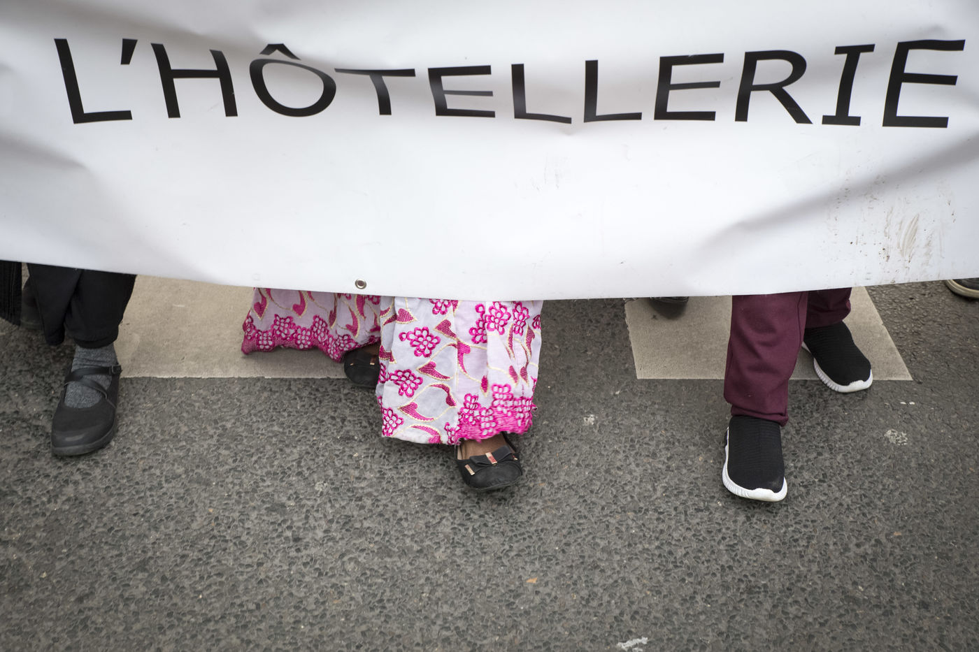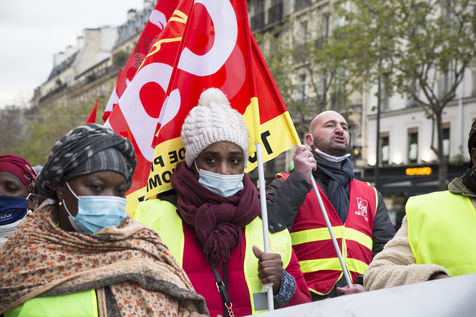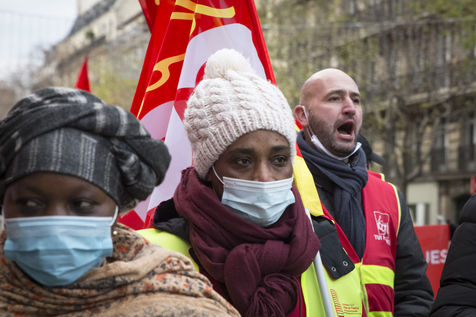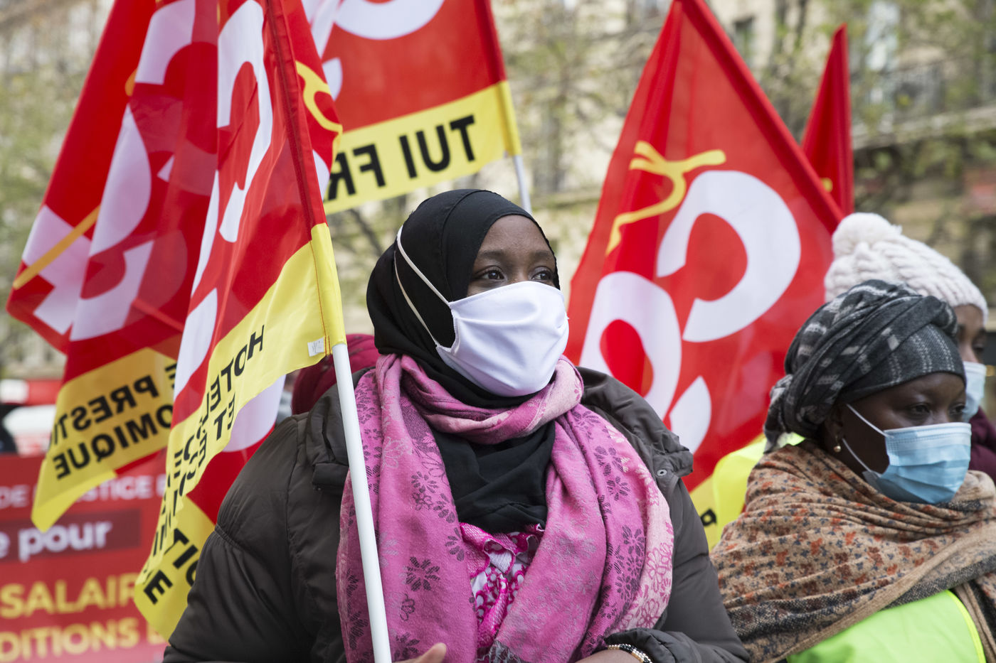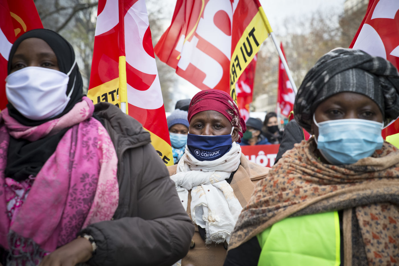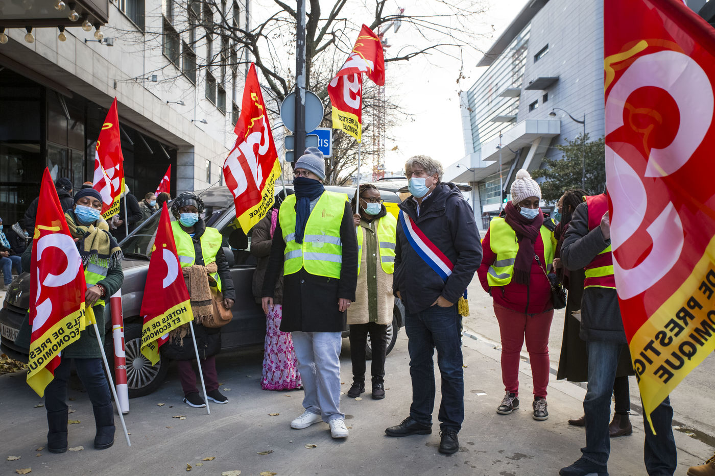 FRANCE, Paris, December 10, 2020. The CGT-HPE union called for a rally to protest against the job cuts and collective performance agreements (2016 labor law agreements). After several announcements of layoffs in the sector, they accuse the large hotel groups of taking advantage of the health crisis to carry out stock market restructuring and outsource services in security or cleaning. This subcontracting makes it possible, during the takeover, to have precarious part-time employees. A small procession composed in part of the housemaids of the hotel Ibis des Batignolles, on strike since July 2019, demonstrated in front of some major Parisian hotels.