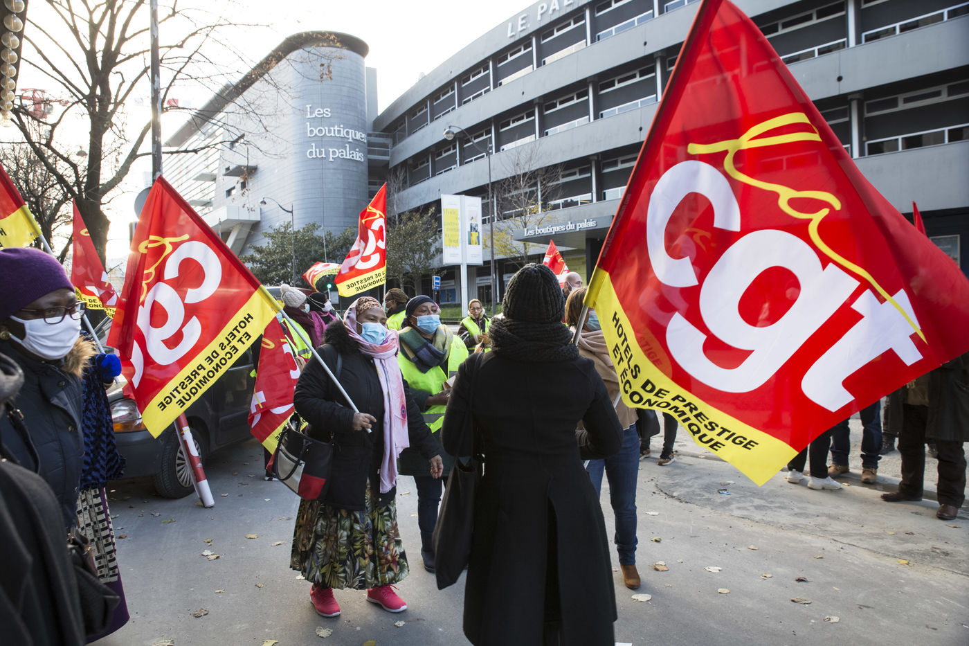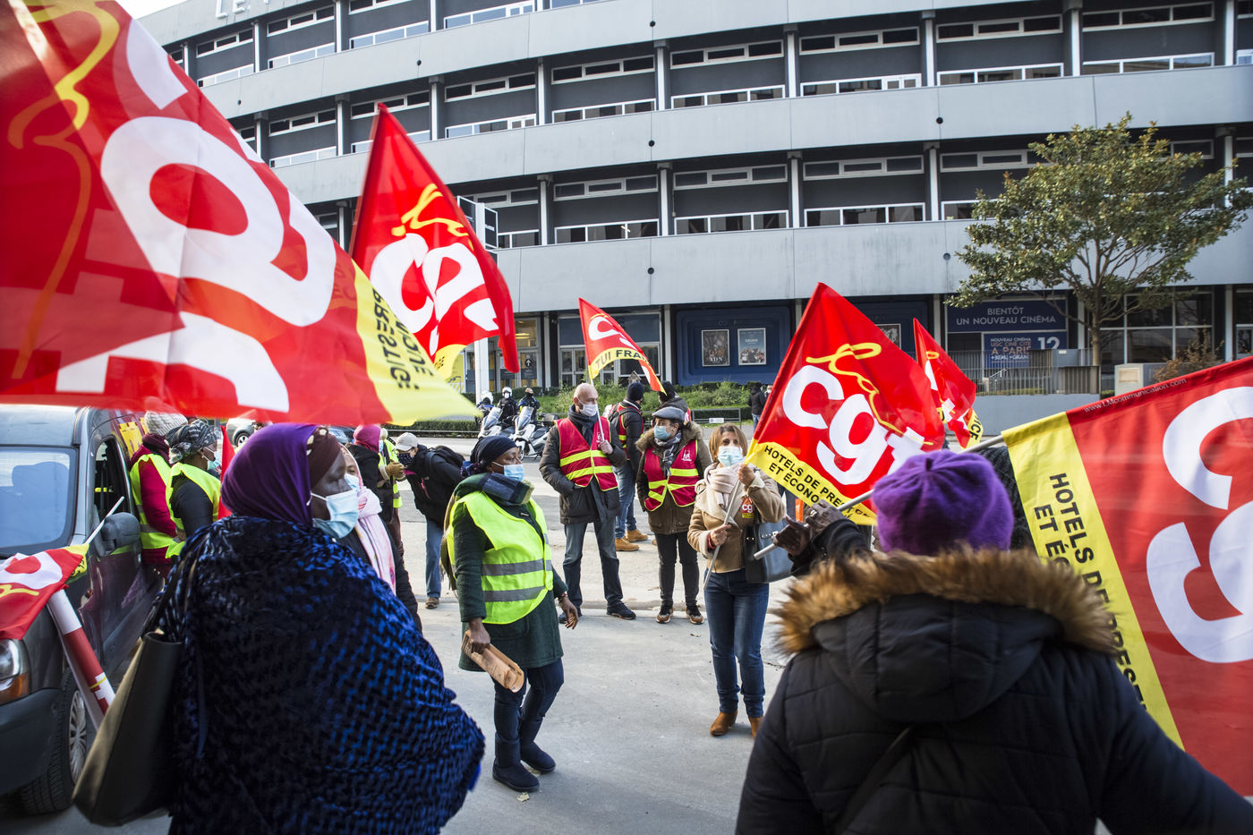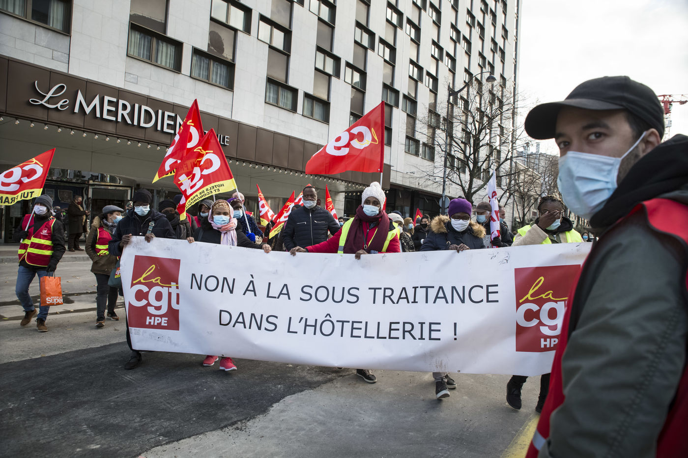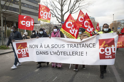 FRANCE, Paris, le 10 Decembre 2020. Le syndicat CGT-HPE appelait a se rassembler pour protester contre les suppressions d emplois et les accords de performance collective (accords de la loi travail de 2016). Apres plusieurs annonces de licenciements dans le secteur, ils reprochent aux grands groupes hoteliers de profiter de la crise sanitaire pour effectuer des restructurations boursieres et mettre des services en sous traitance dans la securite ou le nettoyage. Cette sous-traitance permettant de disposer, lors de la reprise, de salaries en temp partiel precarises. Un petit cortege compose en partie des femmes de menages de l hotel Ibis des Batignolles, en greve depuis juillet 2019, a manifeste devant quelques grands hotels parisiens.