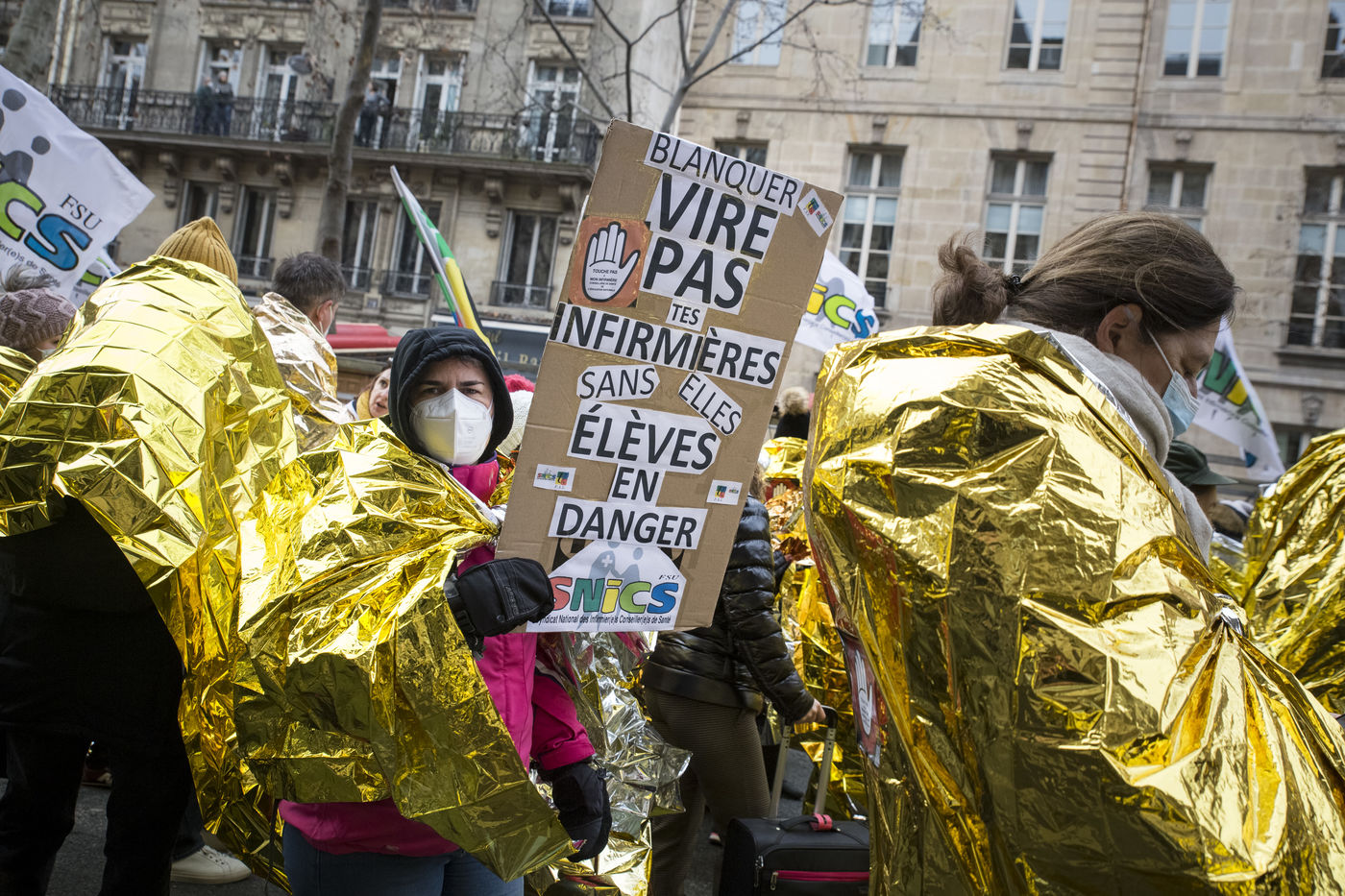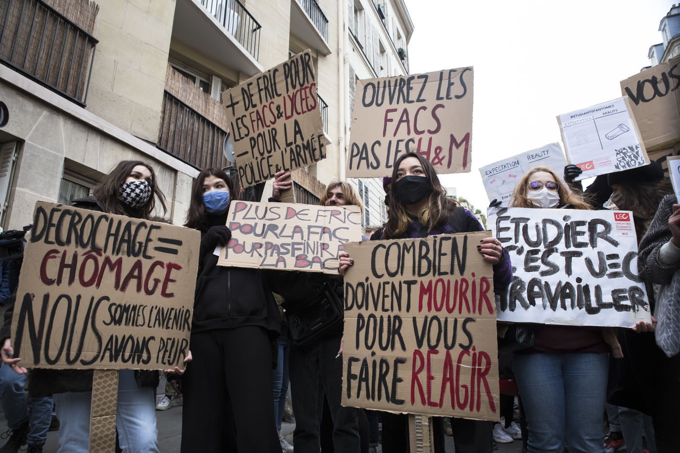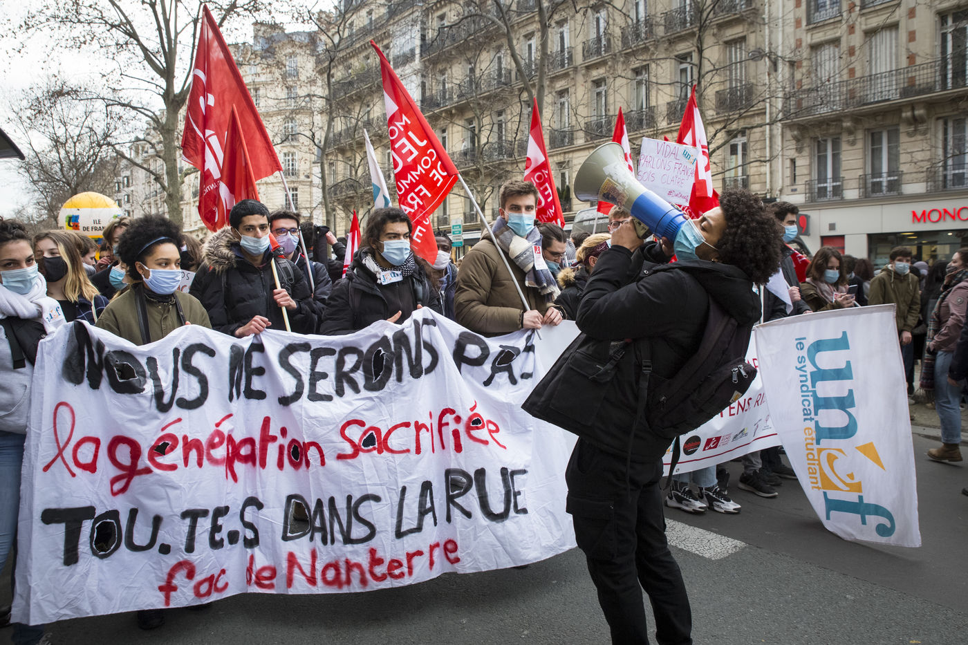 FRANCE, Paris, le 26 janvier 2021. Manifestation intersyndicale (FSU, FO, CGT, SUD, SNLC, Snalc), du personnel de l Education Nationale pour denoncer ses conditions de travail, encore degradees avec la pandemie de Covid-19. Enseigants, etudiants et parents d eleves attiraient l attention sur la precarite et la detresse etudiante dans la gestion de cette crise sanitaire.