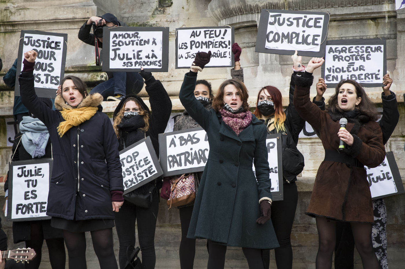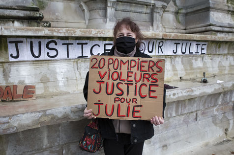 Sunday February 7, 2021, place Saint-Michel, Paris, France. Support rally for Julie (pseudonym) before her case is re-examined by the Court of Cassation on February 10. Julie accuses 20 members of the Paris fire brigade of repeated rapes between the ages of 13 and 15. After 10 years of legal battle, only three of them have been prosecuted and the recent dequalification of rape acts as sexual assault is causing anger. Julie and her mother, Corinne Leriche, are fighting for all the attackers to be judged, and that the facts be reclassified as rapes of a minor in a meeting.