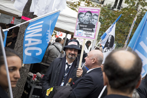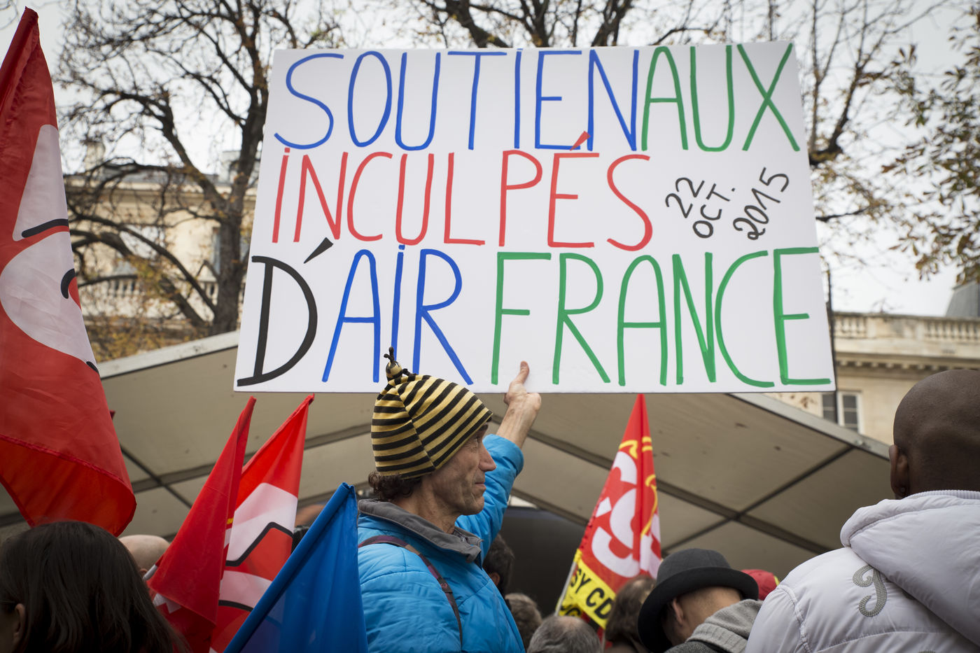 At the call of twelve unions (CGT, SNPAF, FO, CFTC, ALTER, SNPL, SNPNAC, SNPNC, SPAF, SUD-AERIEN, UNSA-PNC, UNAC), Air-France employees, both ground and aircrew, came to demonstrate their opposition to management's layoff plans and their support for their colleagues who were questioned following the events that took place during the CCE on October 5, 2015.