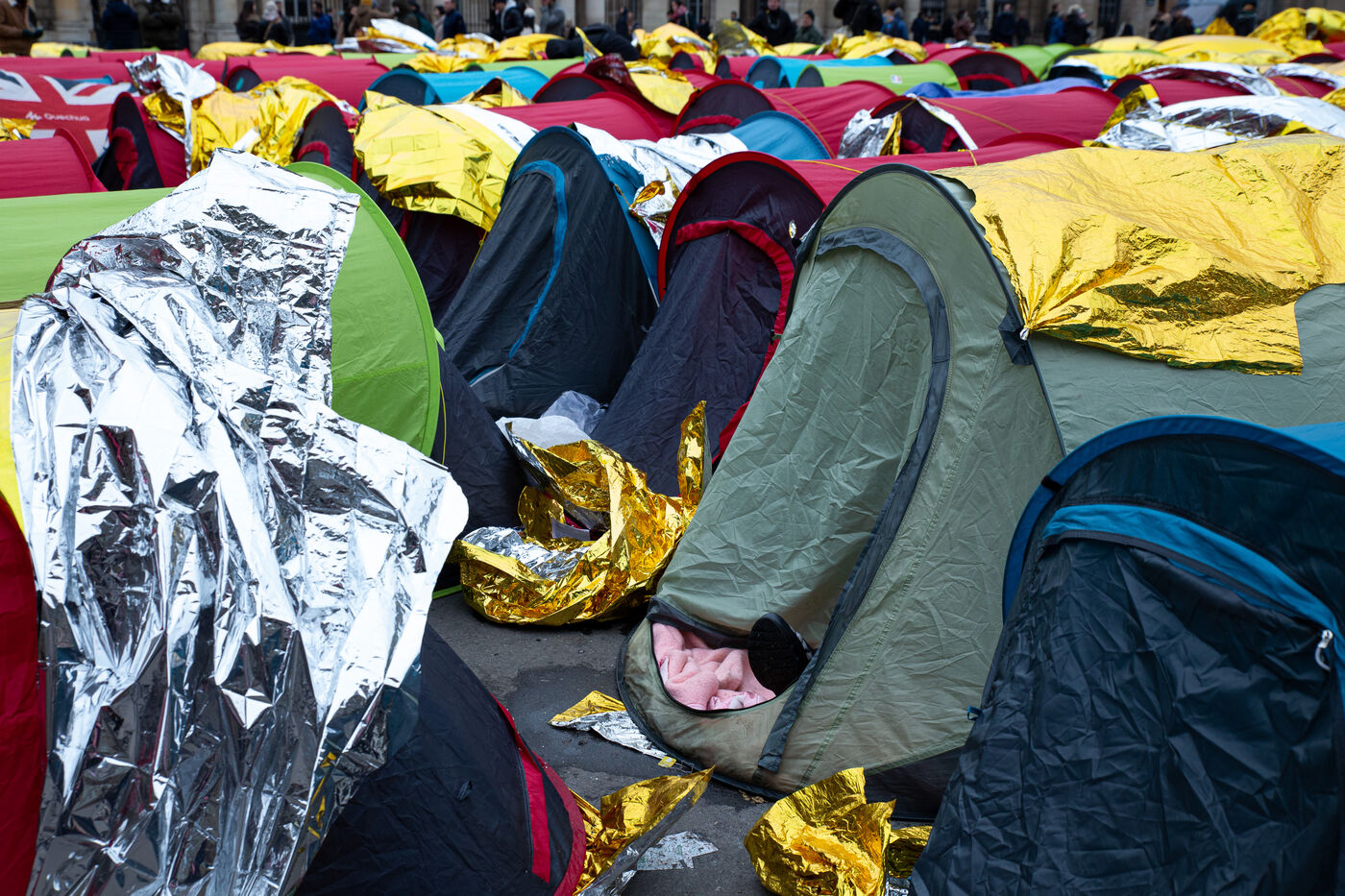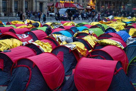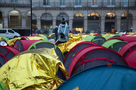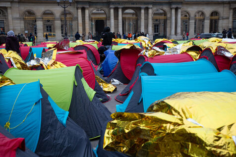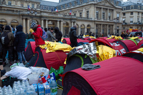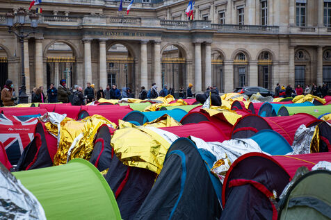 France, Paris, Place du Palais Royal, Saturday, November 3, 2022. Nearly 200 young migrants, in minority appeal, set up a tent camp in front of the Council of State on Friday, to demand their care and access to emergency accommodation. Most of these young people have been surviving since June under a bridge in Ivry sur Seine and are accompanied in this action by several associations including Utopia 56, the Tara Center, Medecin du Monde, Timmy, Les Midis du Mie and Medecin sans Frontieres.