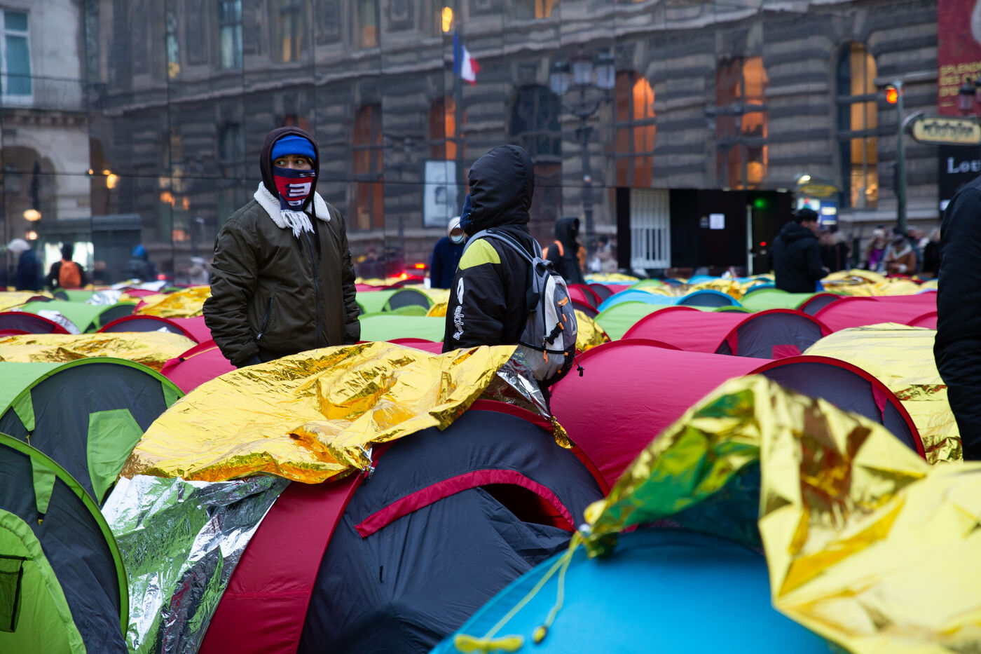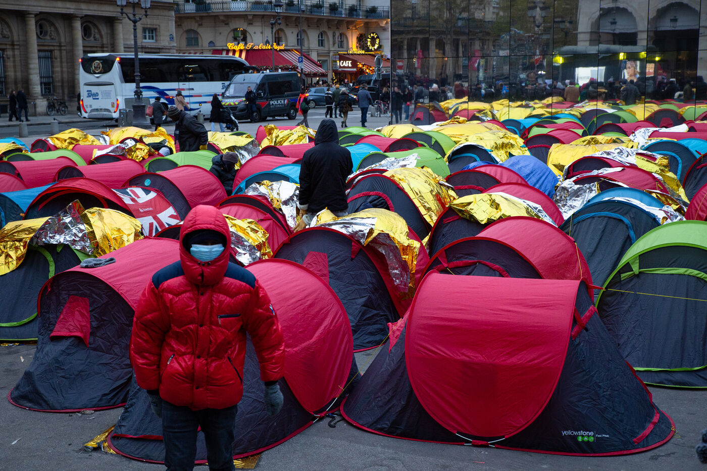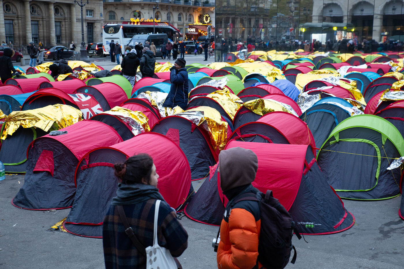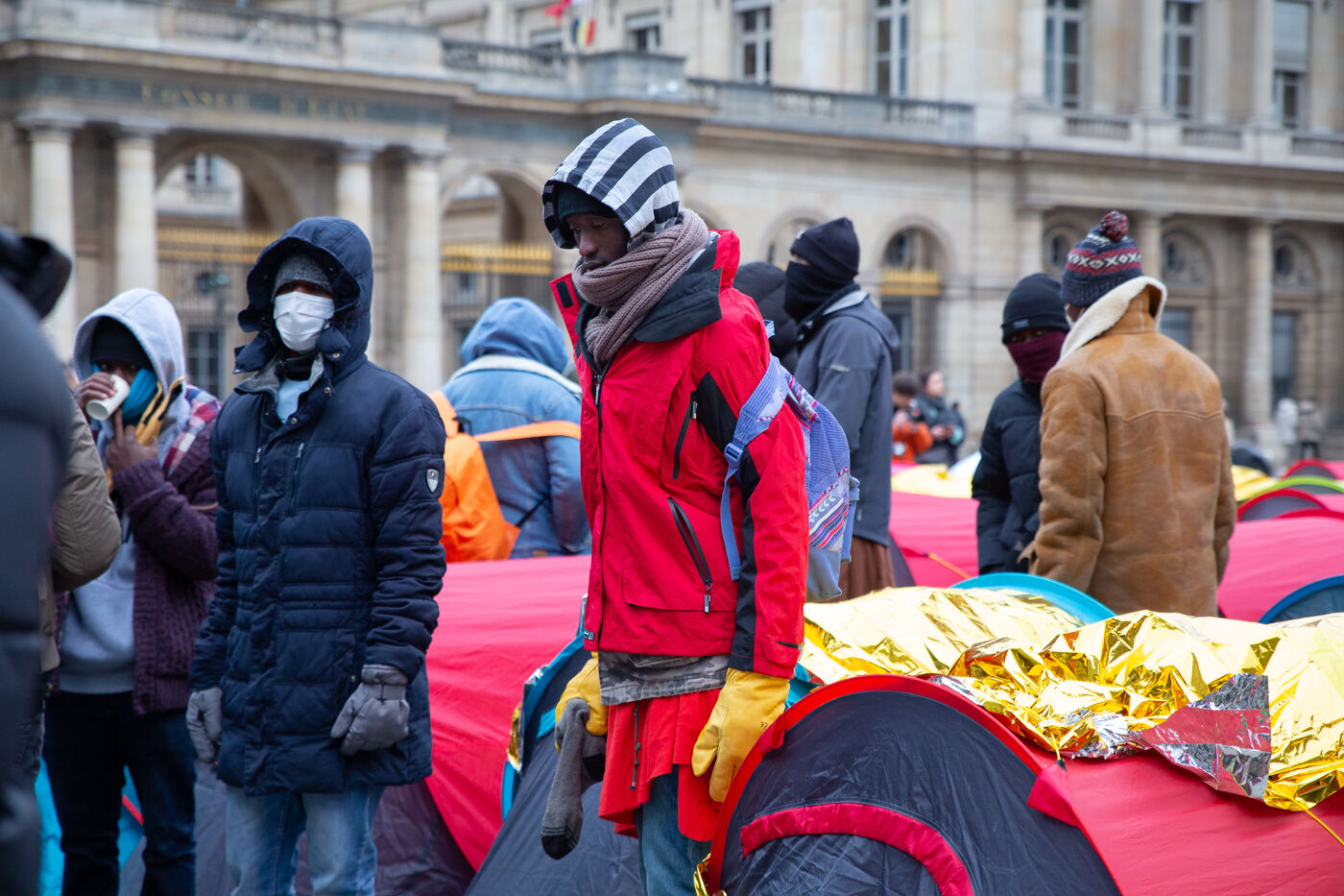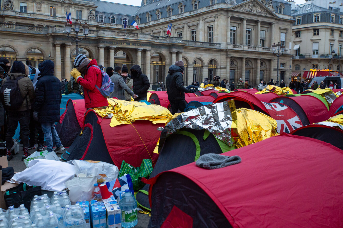 France, Paris, Place du Palais Royal, le samedi 3 Novembre 2022. Près de 200 jeunes migrants, en recours en minorité, ont installé vendredi un campement de tentes devant le Conseil d'État, pour réclamer leur prise en charge et l'accès à un hébergement d'urgence. La plupart de ces jeunes survivent depuis le mois de juin sous un pont a Ivry sur seine et sont accompagnes dans cette action par plusieurs associations dont Utopia 56, le Centre Tara, Medecin du monde, Timmy, Les Midis du Mie et Medecin sans frontieres.