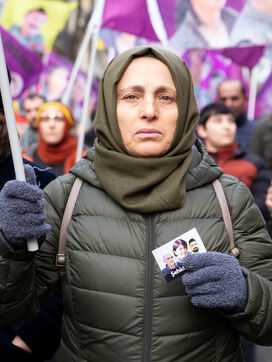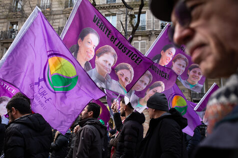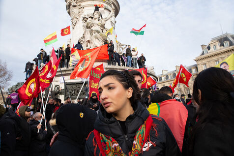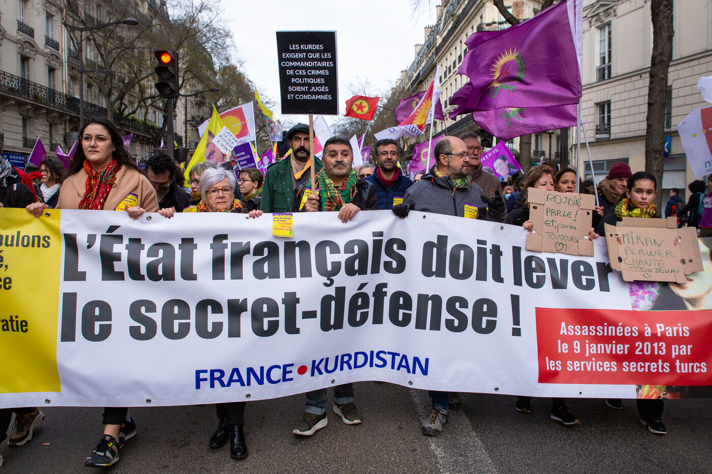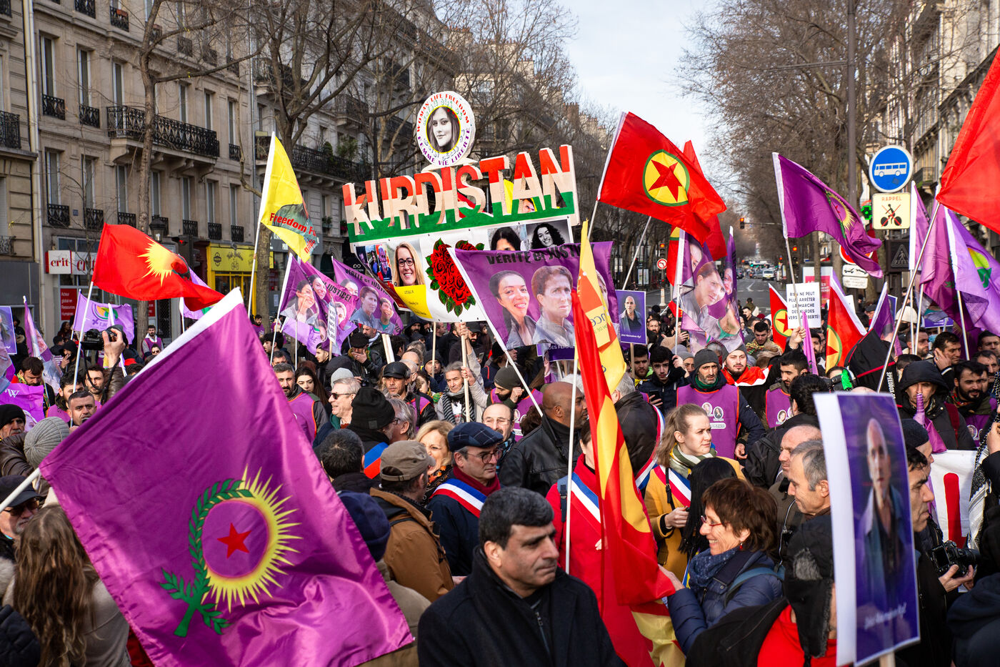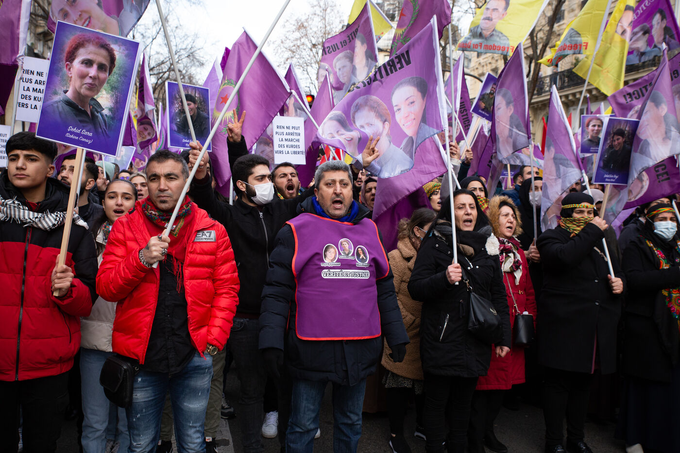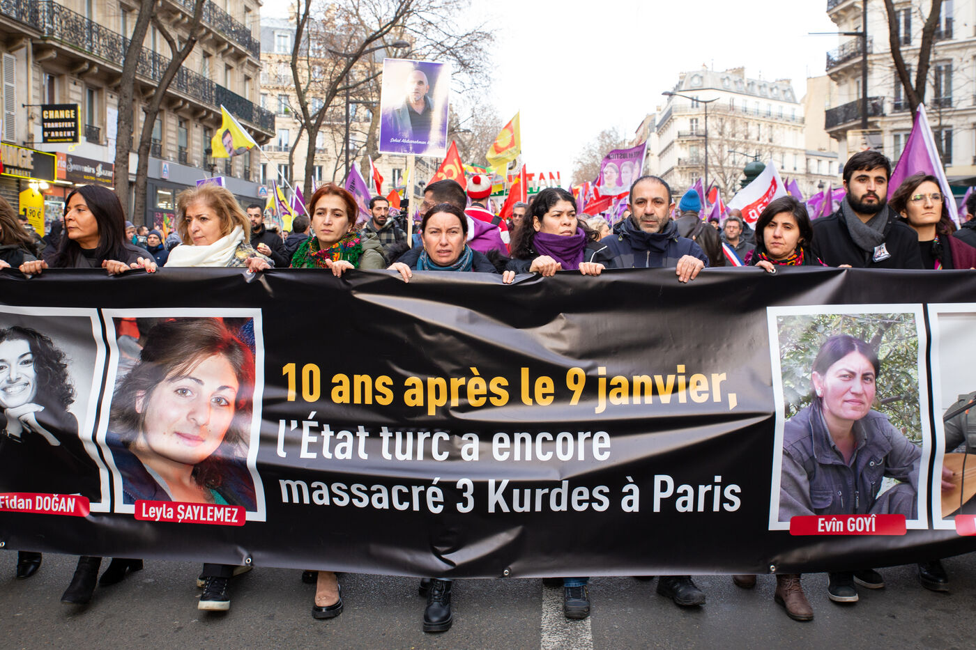 FRANCE, Paris, January 7, 2023. A large march in honor of the three Kurdish activists Sakine Cansiz (Sara), co-founder of the PKK, Fidan Dogan (Rojbin), representative in France of the Kurdistan National Congress (KNK), and Leyla Saylemez (Ronahi), a member of the Kurdish youth movement, who were murdered in Paris, in the 10th arrondissement, on the night of January 9 to 10, 2013.