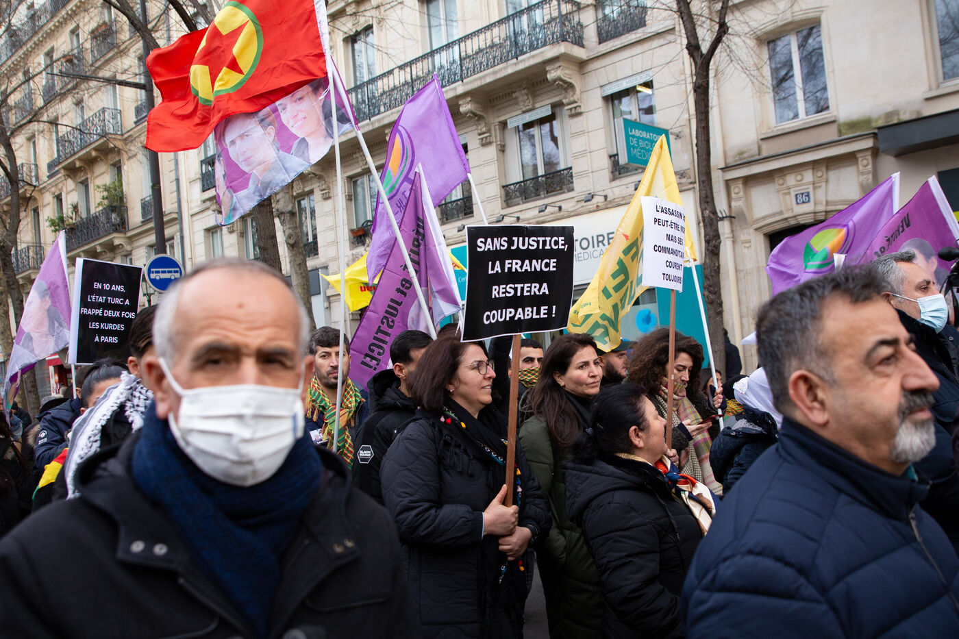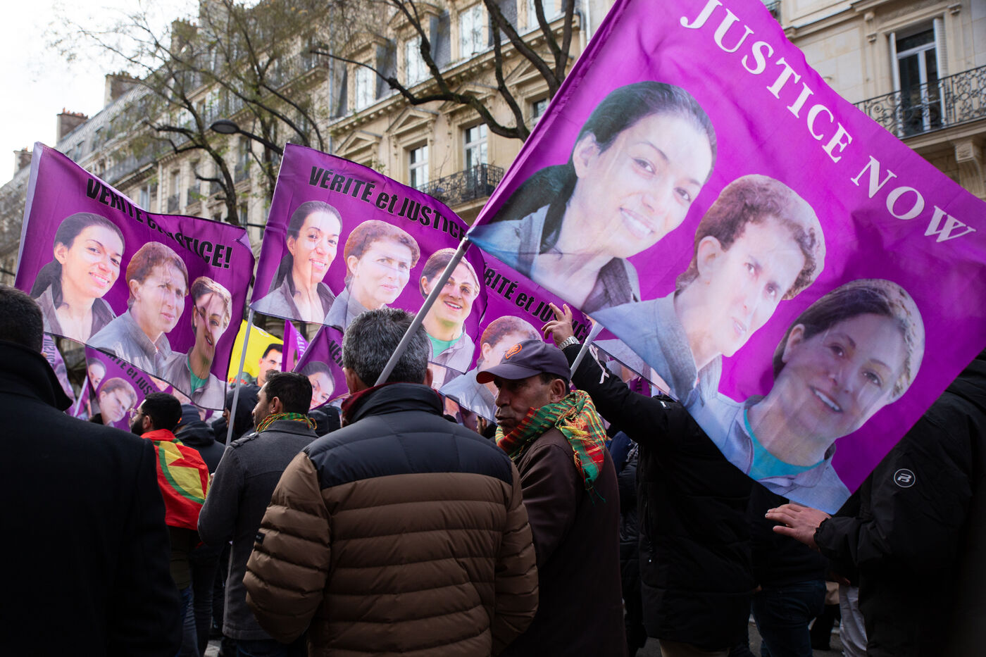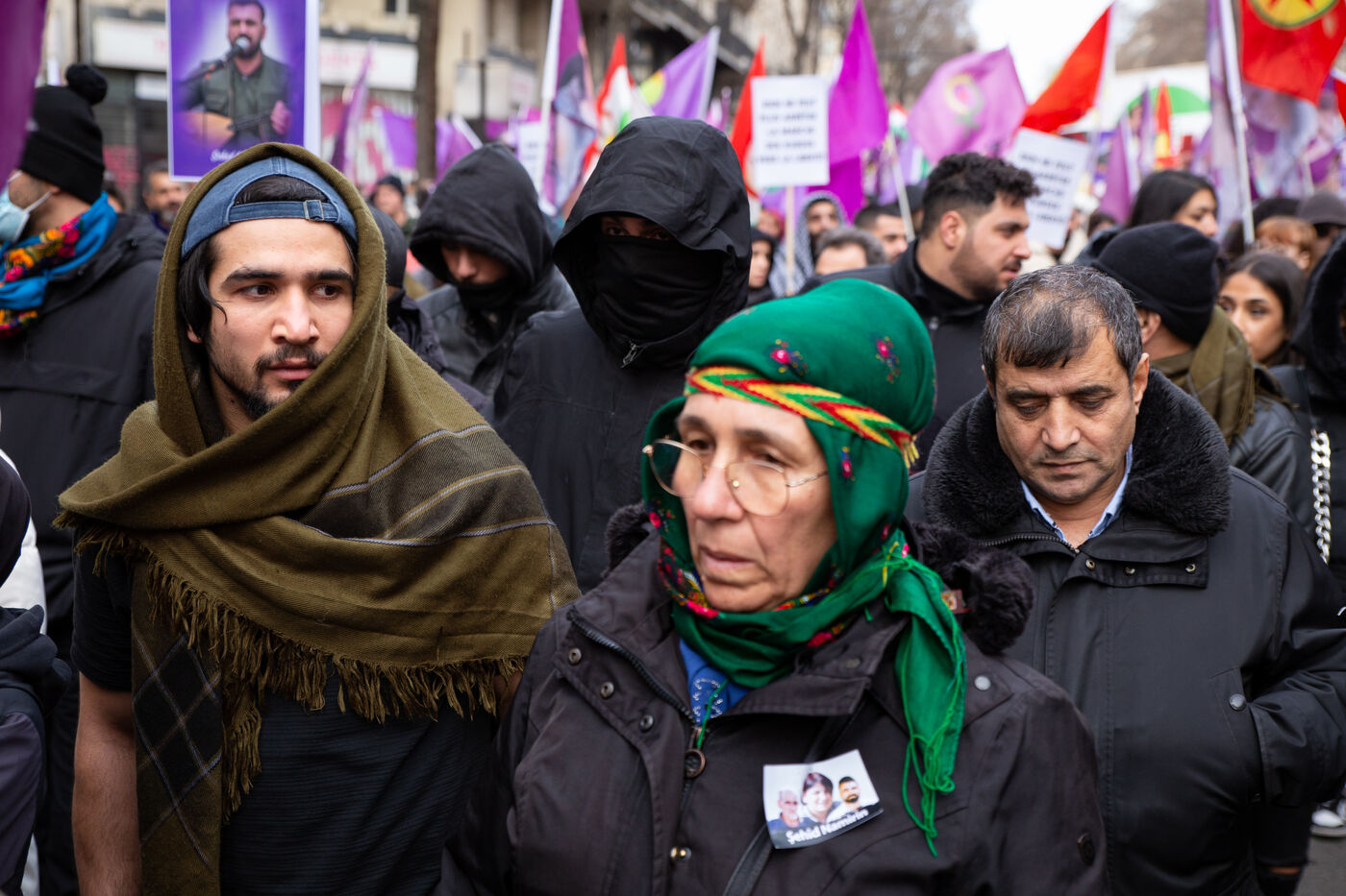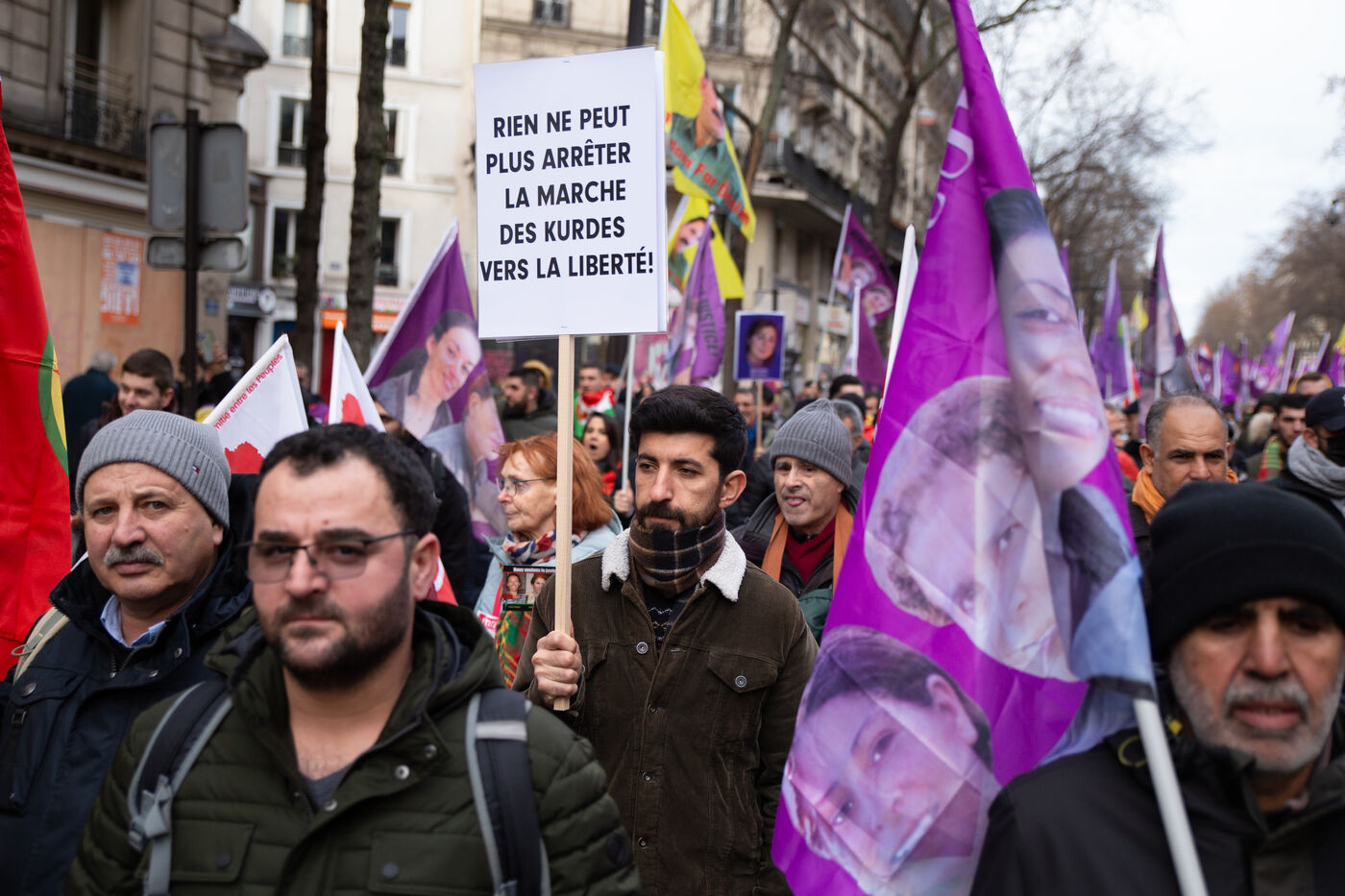 FRANCE, Paris, le 07 janvier 2023. Grande marche en hommage aux trois militantes kurdes Sakine Cansiz (Sara), co-fondatrice du PKK, Fidan Dogan (Rojbin), représentante en France du Congres national du Kurdistan (KNK), et Leyla Saylemez (Ronahi), membre du mouvement de jeunesse kurde, assassinées a Paris, dans le 10e arrondissement, dans la nuit du 9 au 10 janvier 2013.