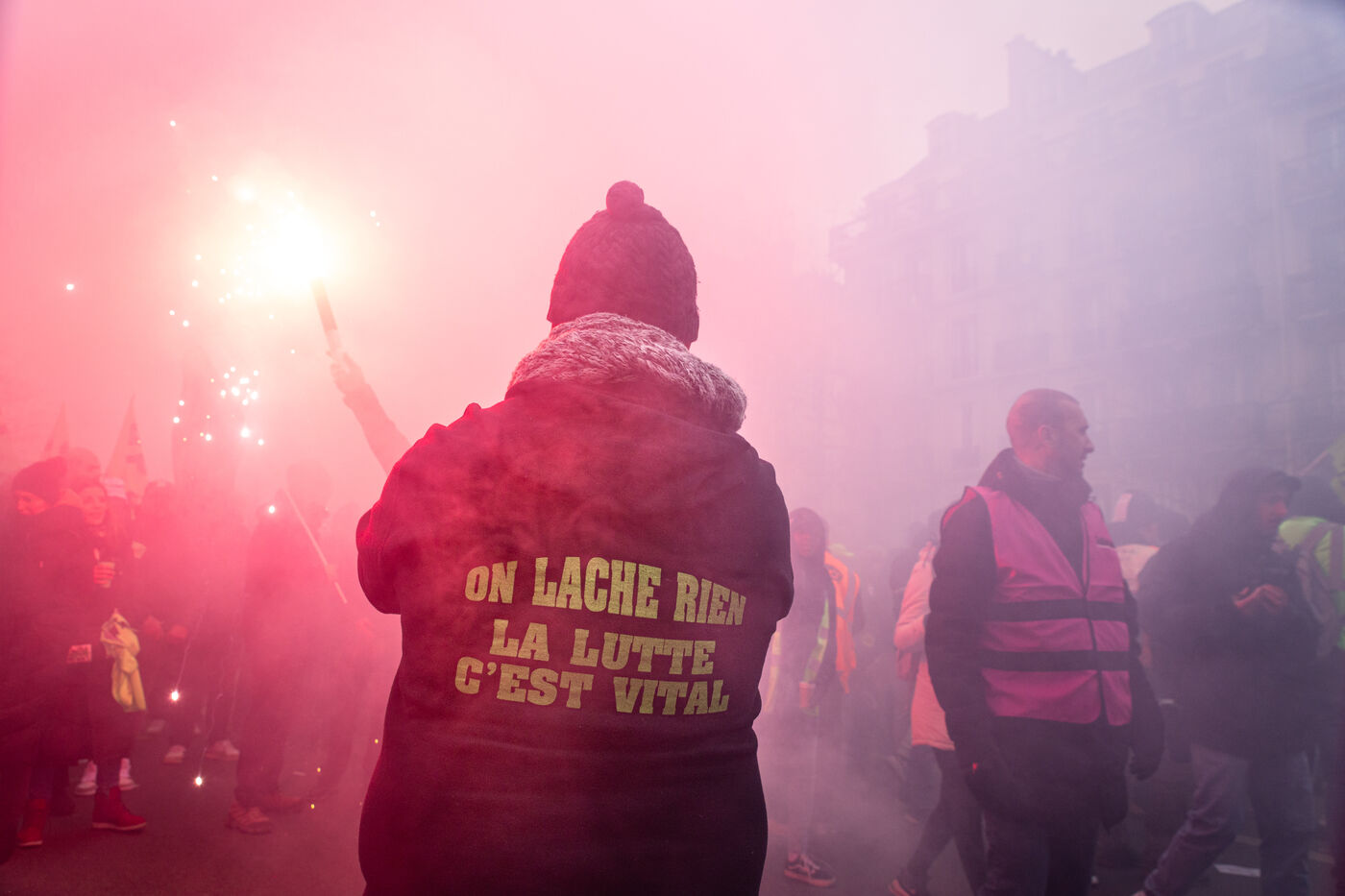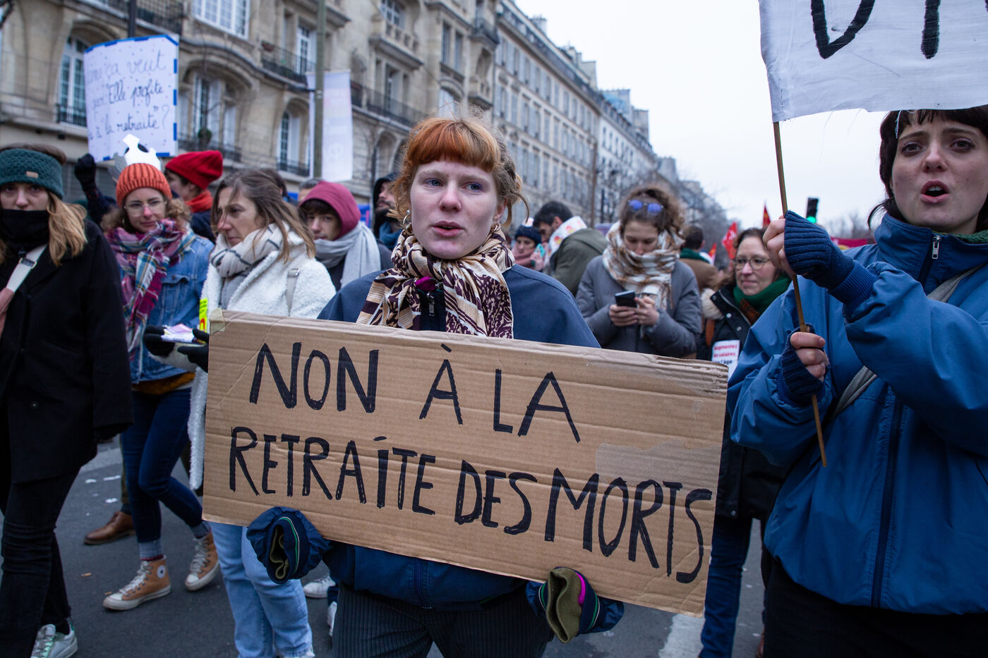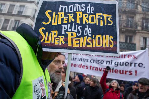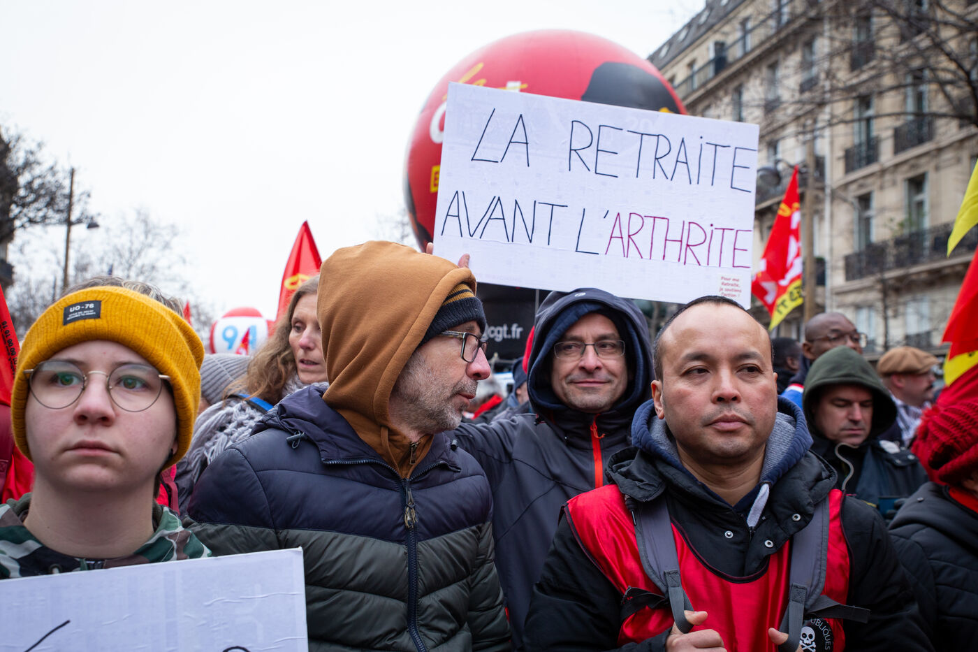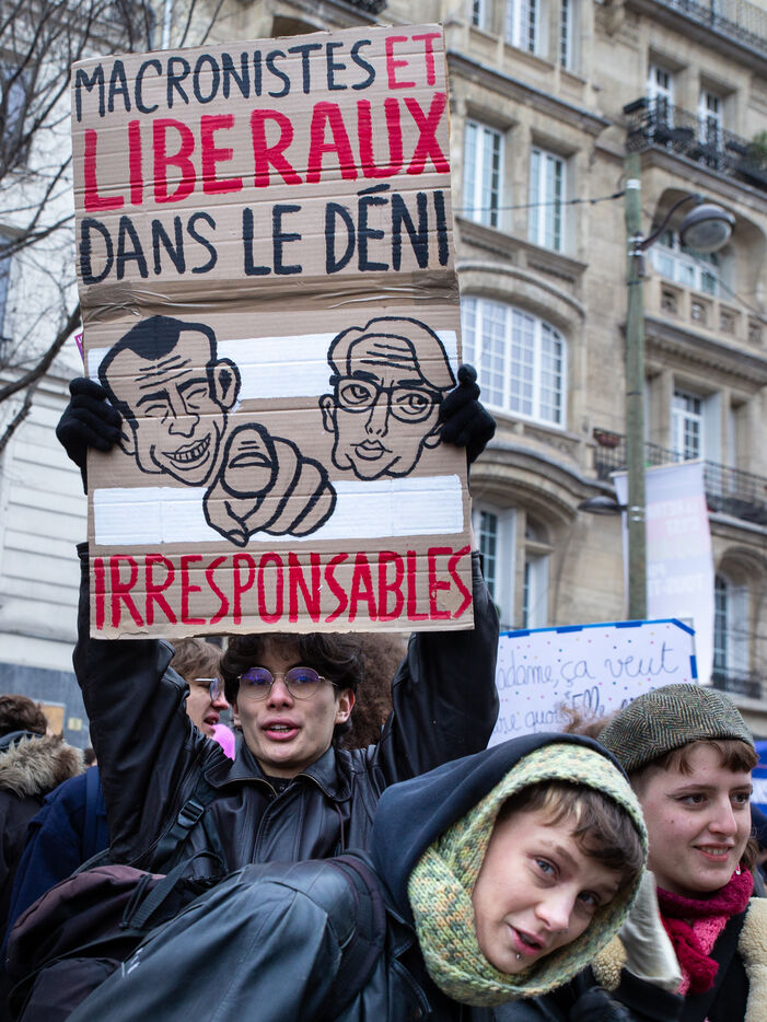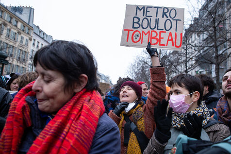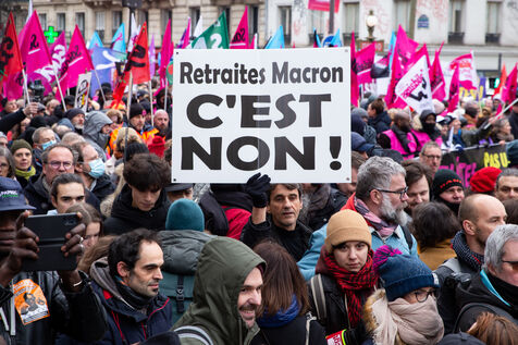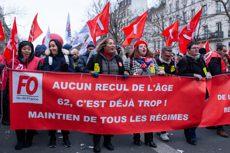 France, Paris, January 19, 2023. Parisian demonstration against the pension reform. First day of mobilization against the reform carried by Elizabeth Borne and her government. The demonstrators protest against the postponement of the legal retirement age to 64 years and the acceleration of the increase of the contribution period.