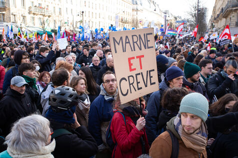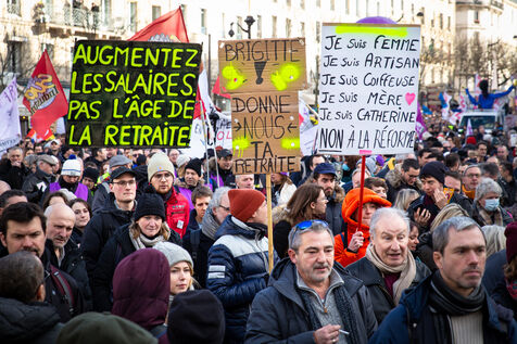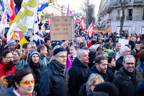 France, Paris, le 31 janvier 2023. Manifestation parisienne contre la reforme des retraites. Deuxieme journee de mobilisation intersyndicale contre la reforme portee par Elizabeth Borne et son gouvernement. Les manifestants protestent contre le report de l age legal de la retraite a 64 ans et l acceleration de l augmentation de la duree de cotisation.