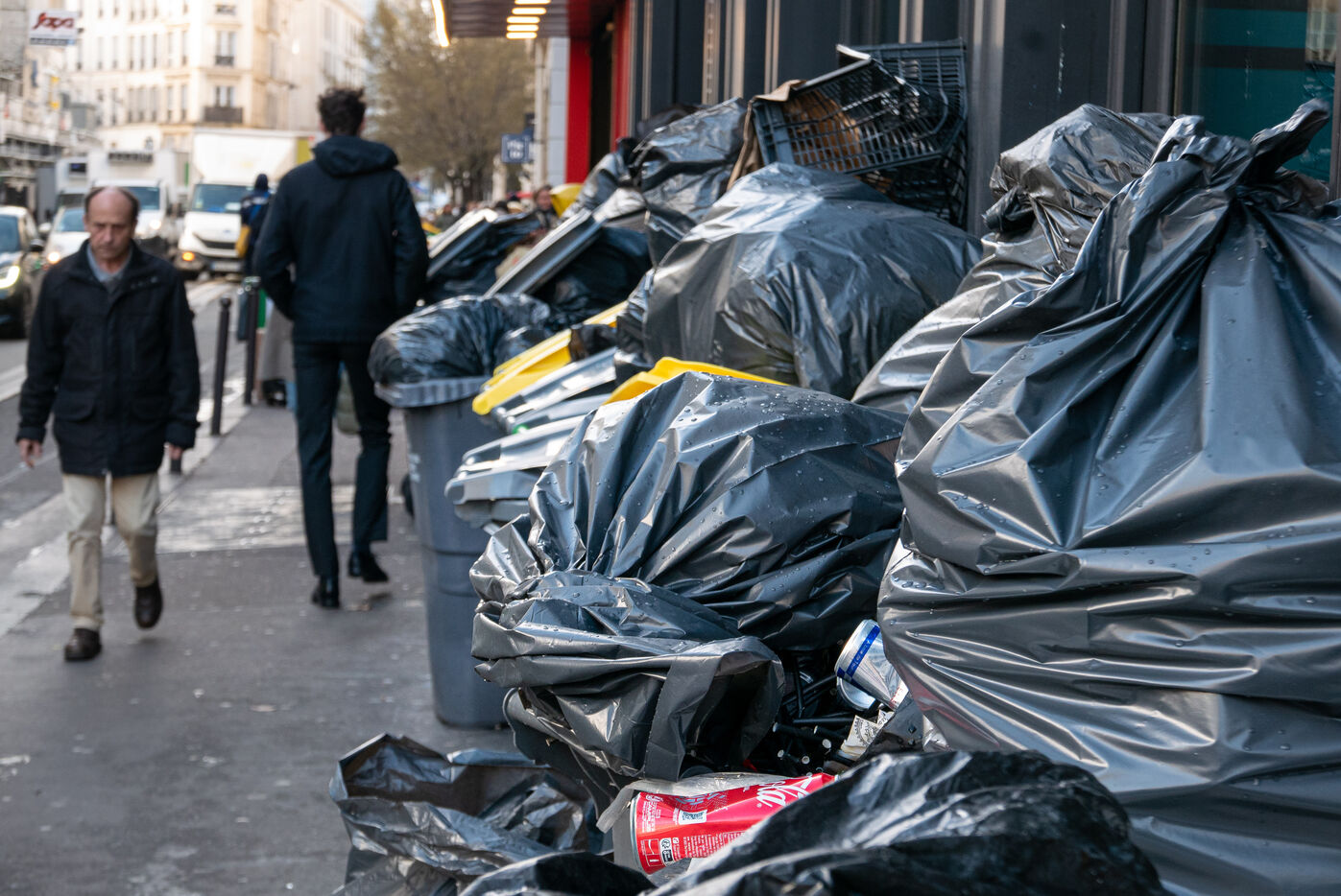 France, Paris, March 14, 2023. Illustration. Strike of the garbage collectors. Overflowing garbage cans and garbage bags in a Paris street. The garbage collectors of the city of Paris are on strike since March 7 to protest against the reform brought by Elizabeth Borne and her government.