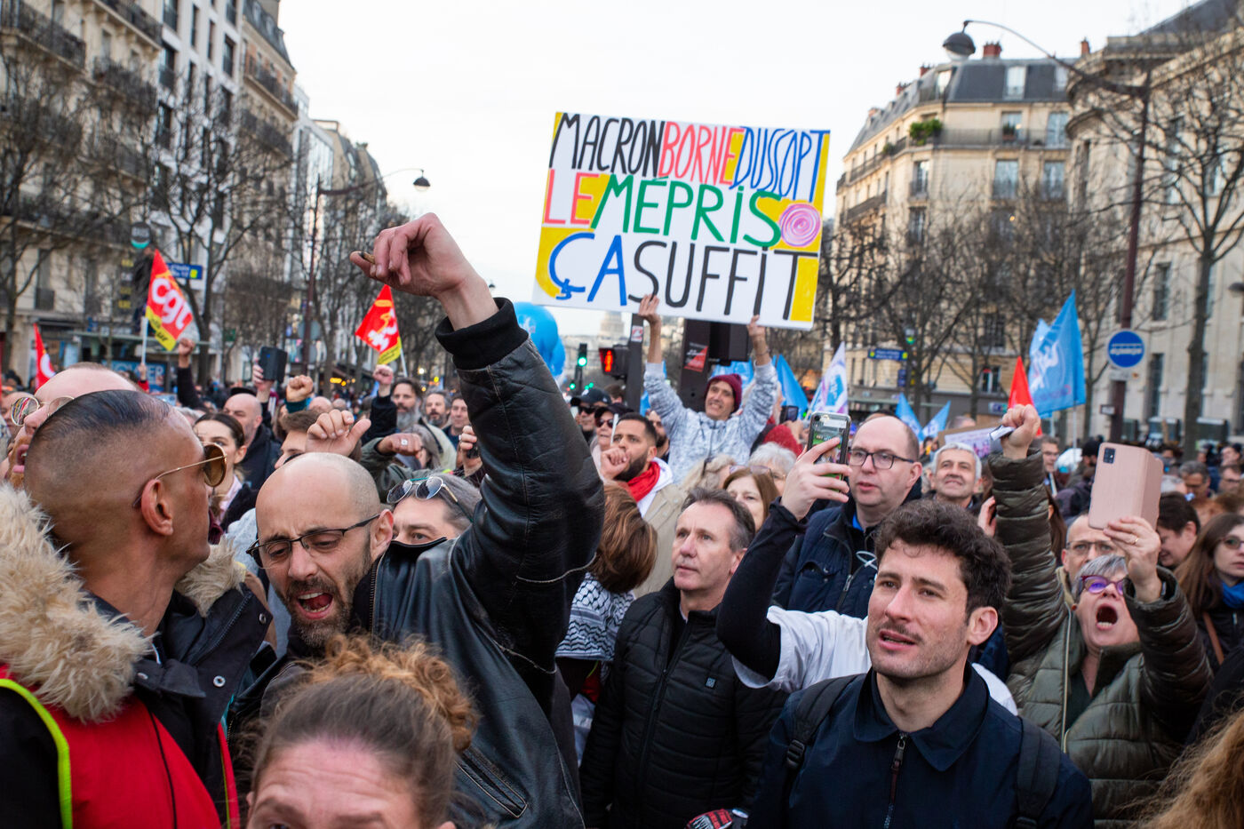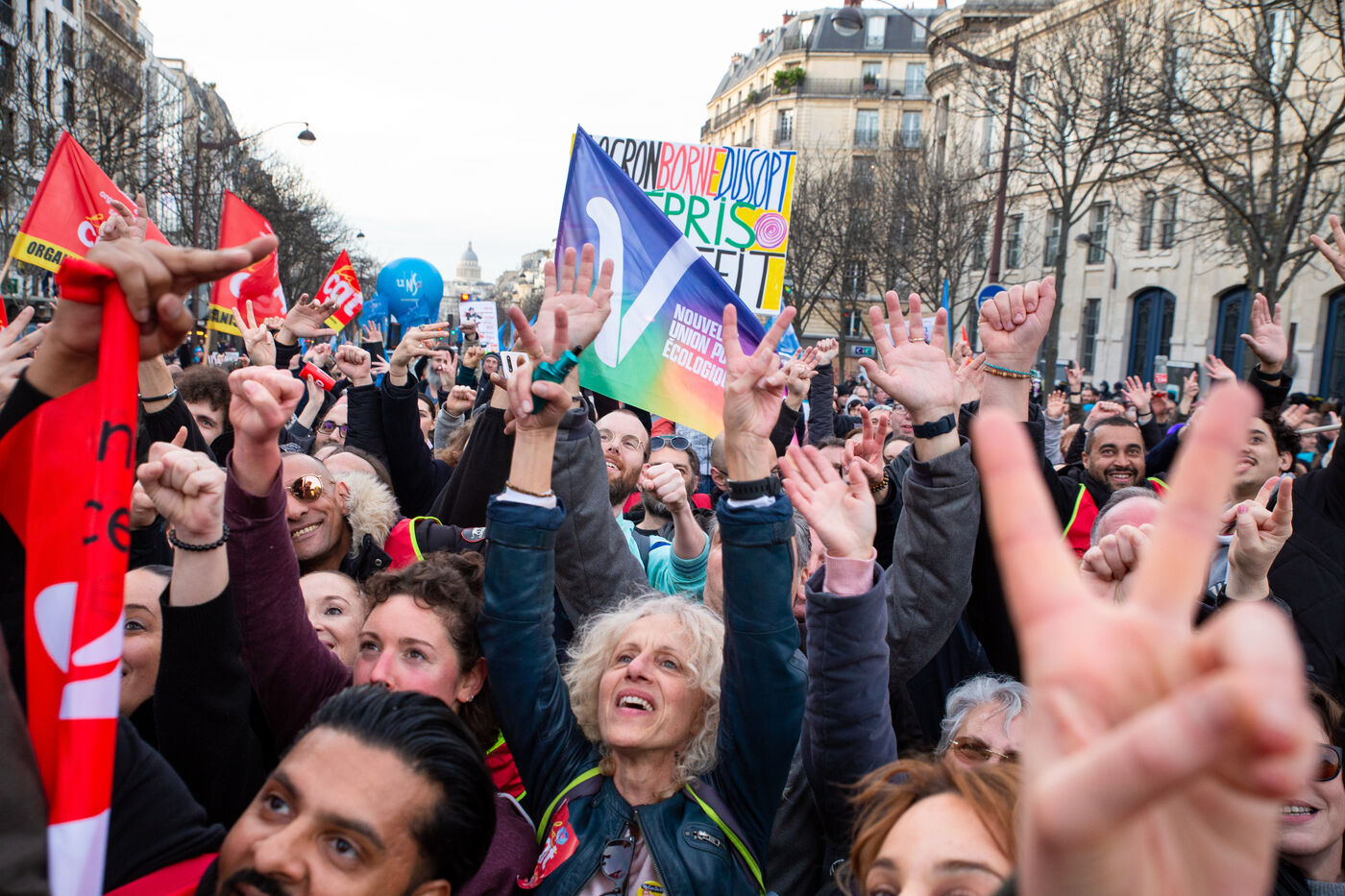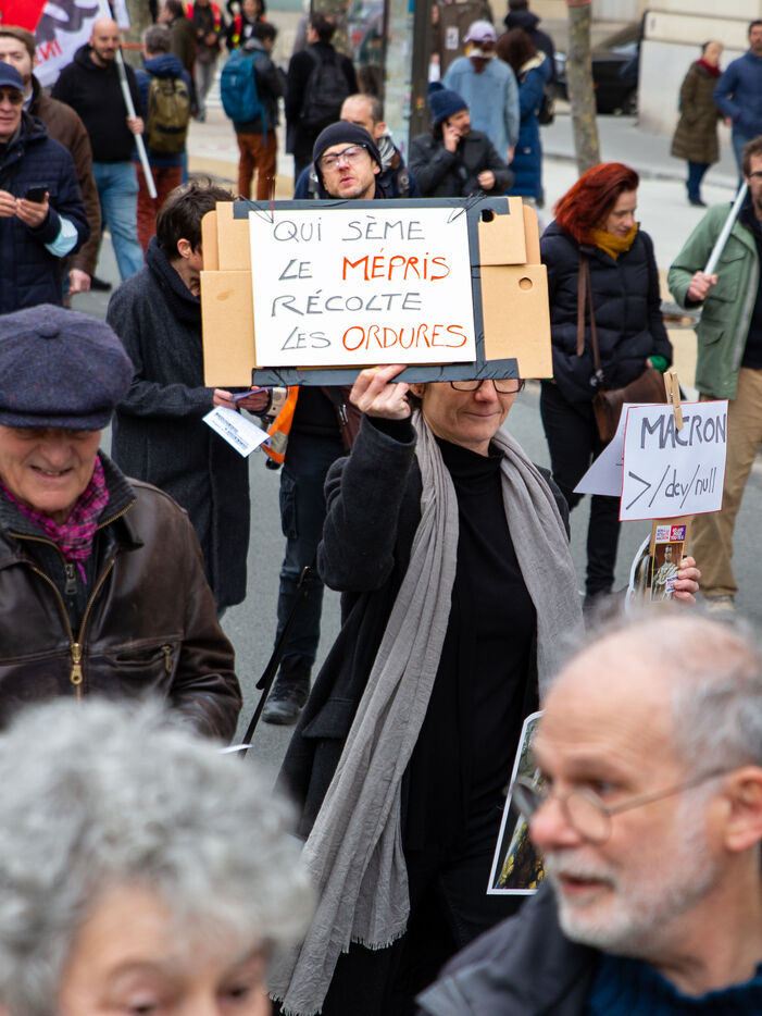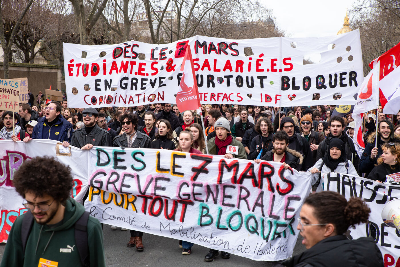 France, Paris, March 15, 2023. Parisian demonstration against the pension reform. Eighth day of mobilization against the reform of the pension system by Elizabeth Borne and her government. The demonstrators are protesting against the postponement of the legal retirement age to 64 years and the acceleration of the increase in the contribution period.