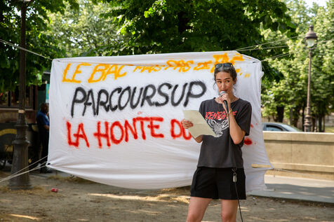 France, Paris, le Vendredi 9 juin 2023. Rassemblement a l appel du Mouvement des Mères isolées, de la FIDL, la CGT Educ?action, la FCPE Union Locale Paul Valery. Les participant demandent l?abrogation de ParcourSup, de la réforme du Bac, la suppression de la plateforme MonMaster et d?avantage de moyens pour l?enseignement supérieur et les étudiants.