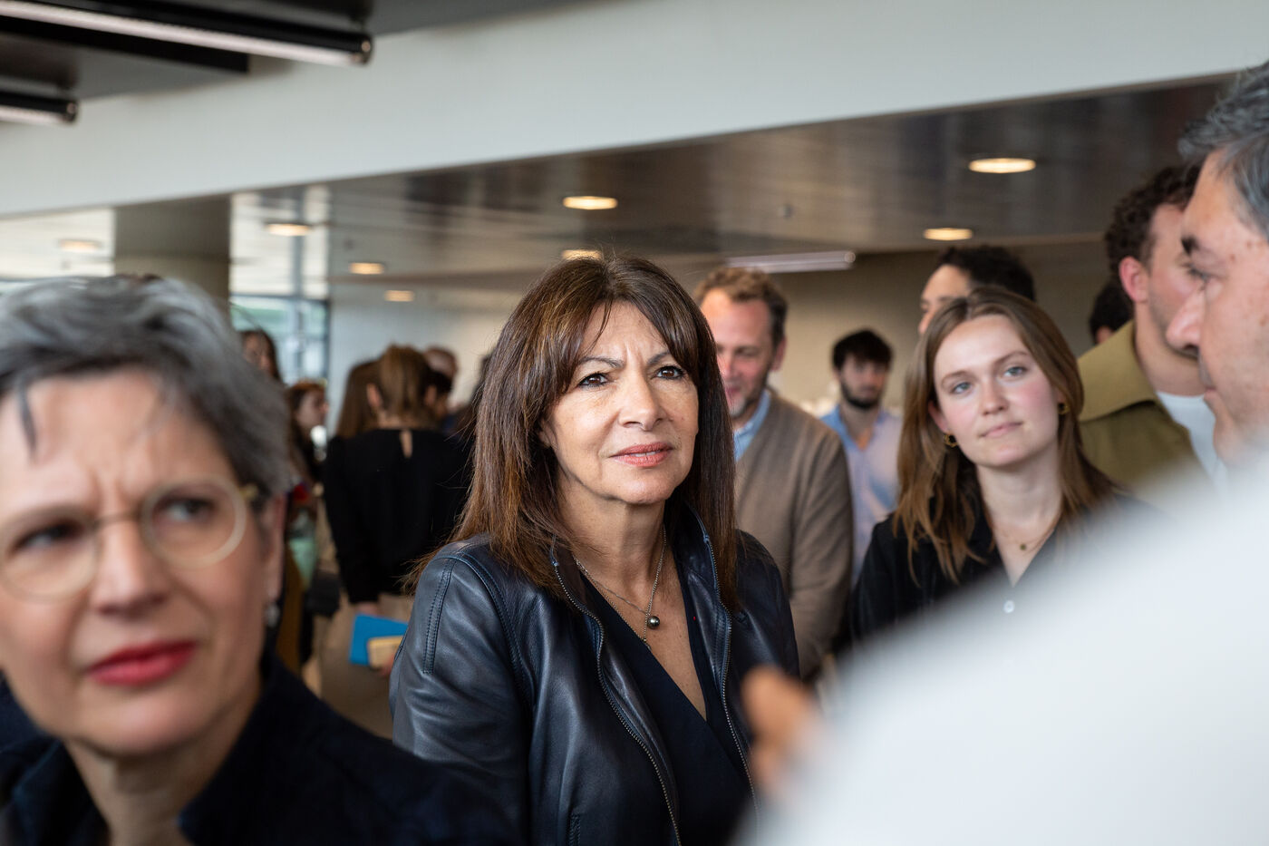 France, Paris, May 23, 2023 Inauguration of the Manufacture Berlier, in the 13th arrondissement of Paris. The RIVP's Berlier building houses a social, solidarity-based, circular textile factory. In the presence of the mayor of Paris, deputy mayors of the city of Paris, the mayor of the 13th arrondissement, and the president of the RIVP. Jerome COUMET (Mayor of 13?), David Belliard (deputy mayor), Anne Hidalgo (mayor of Paris) and Sandrine Rousseau (deputee ecologiste Nupes) visit the stands.