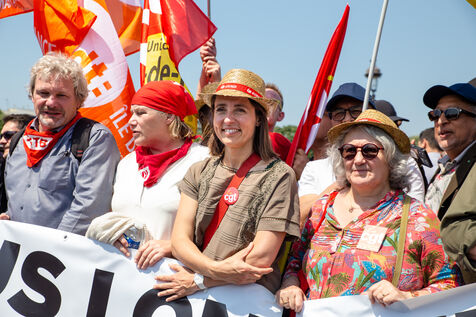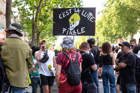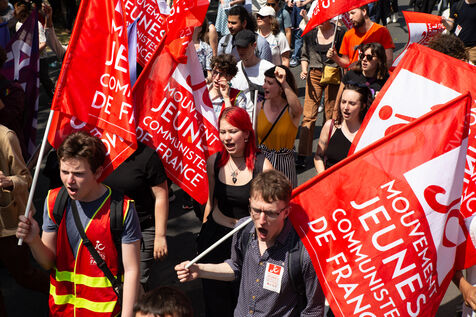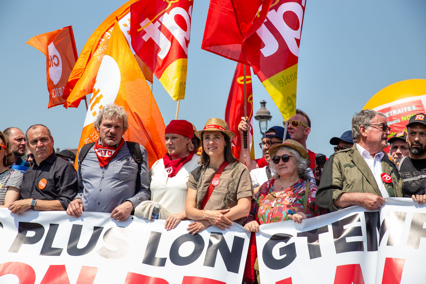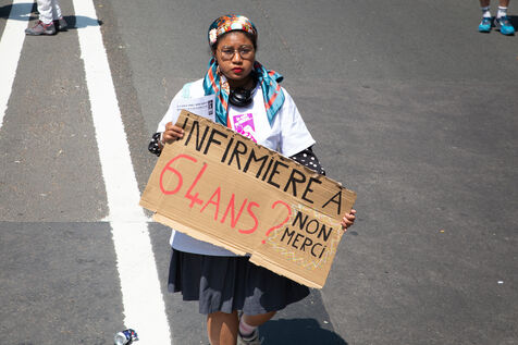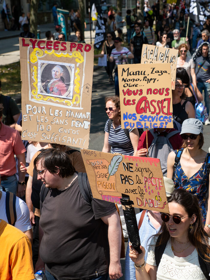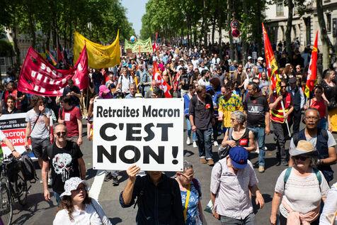 France, Paris, June 6, 2023. Paris demonstration against pension reform. Fourteenth day of inter-union mobilization against the pension reform proposed by Elizabeth Borne and her government. Demonstrators protest against the postponement of the legal retirement age to 64 and the acceleration of the increase in the contribution period.