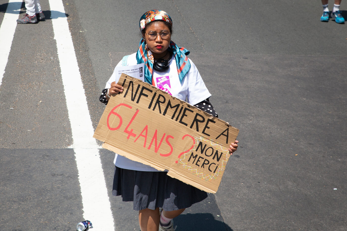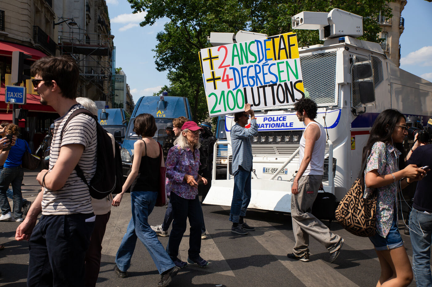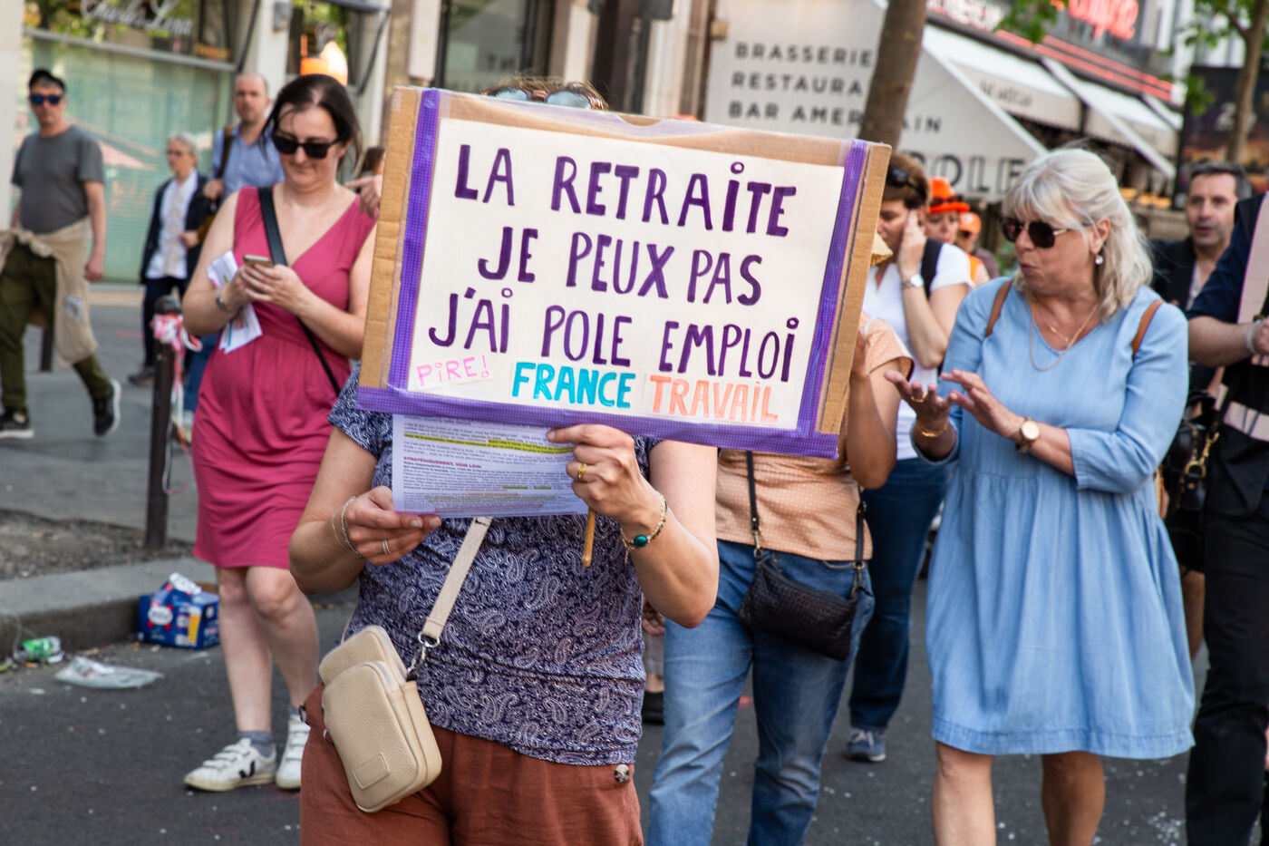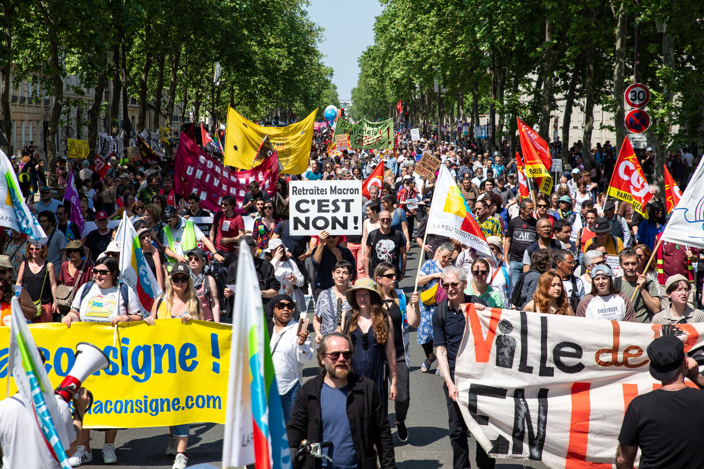 France, Paris, le 6 juin 2023. Manifestation parisienne contre la reforme des retraites. Quatorzieme journee de mobilisation intersyndicale contre la reforme portee par Elizabeth Borne et son gouvernement. Les manifestants protestent contre le report de l age legal de la retraite a 64 ans et l acceleration de l augmentation de la duree de cotisation.