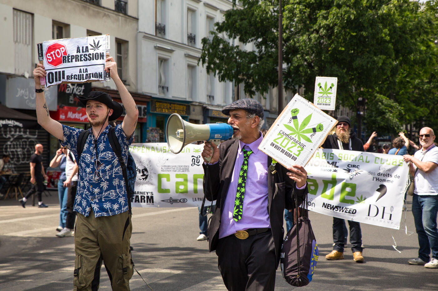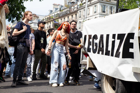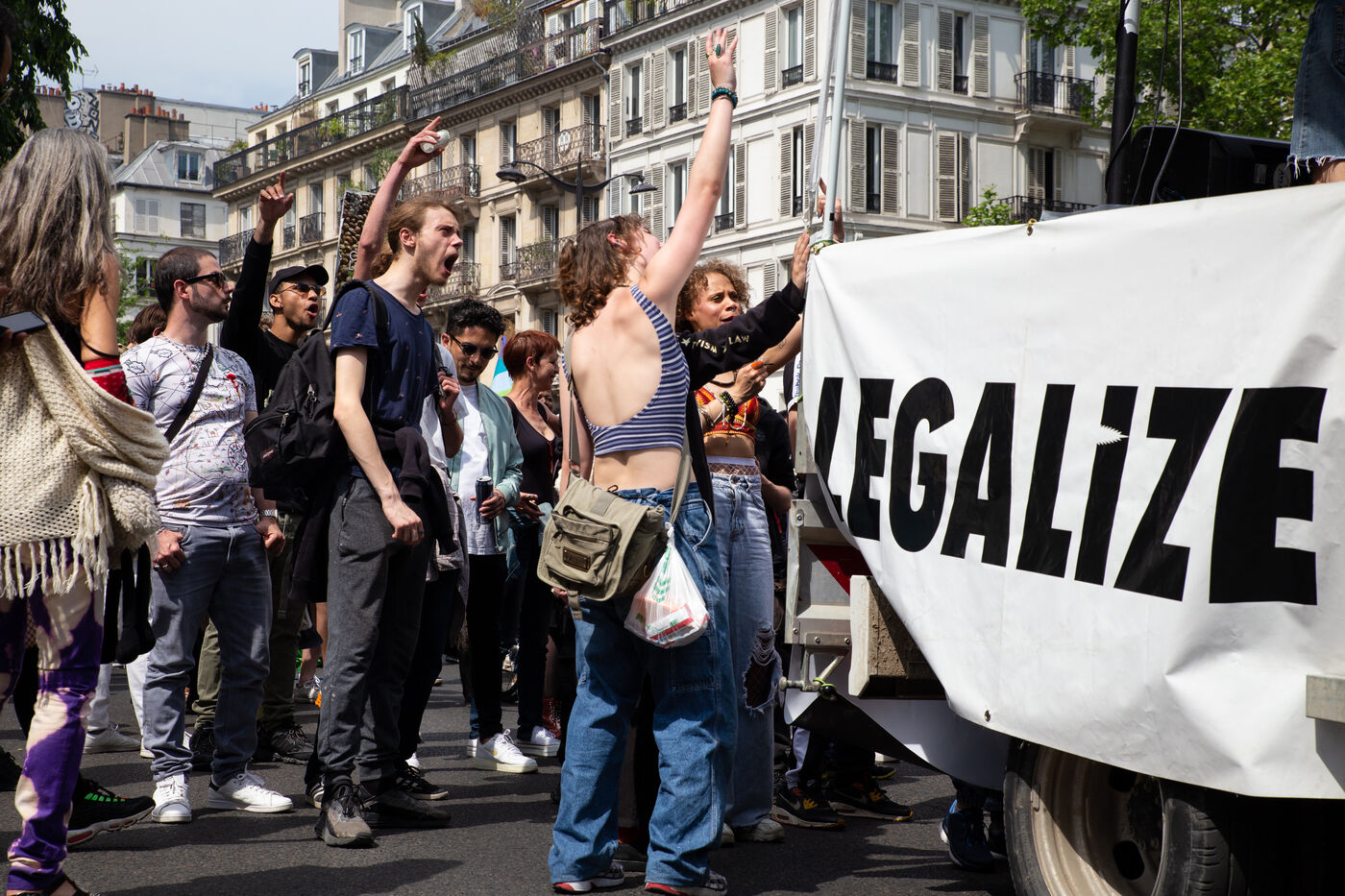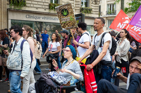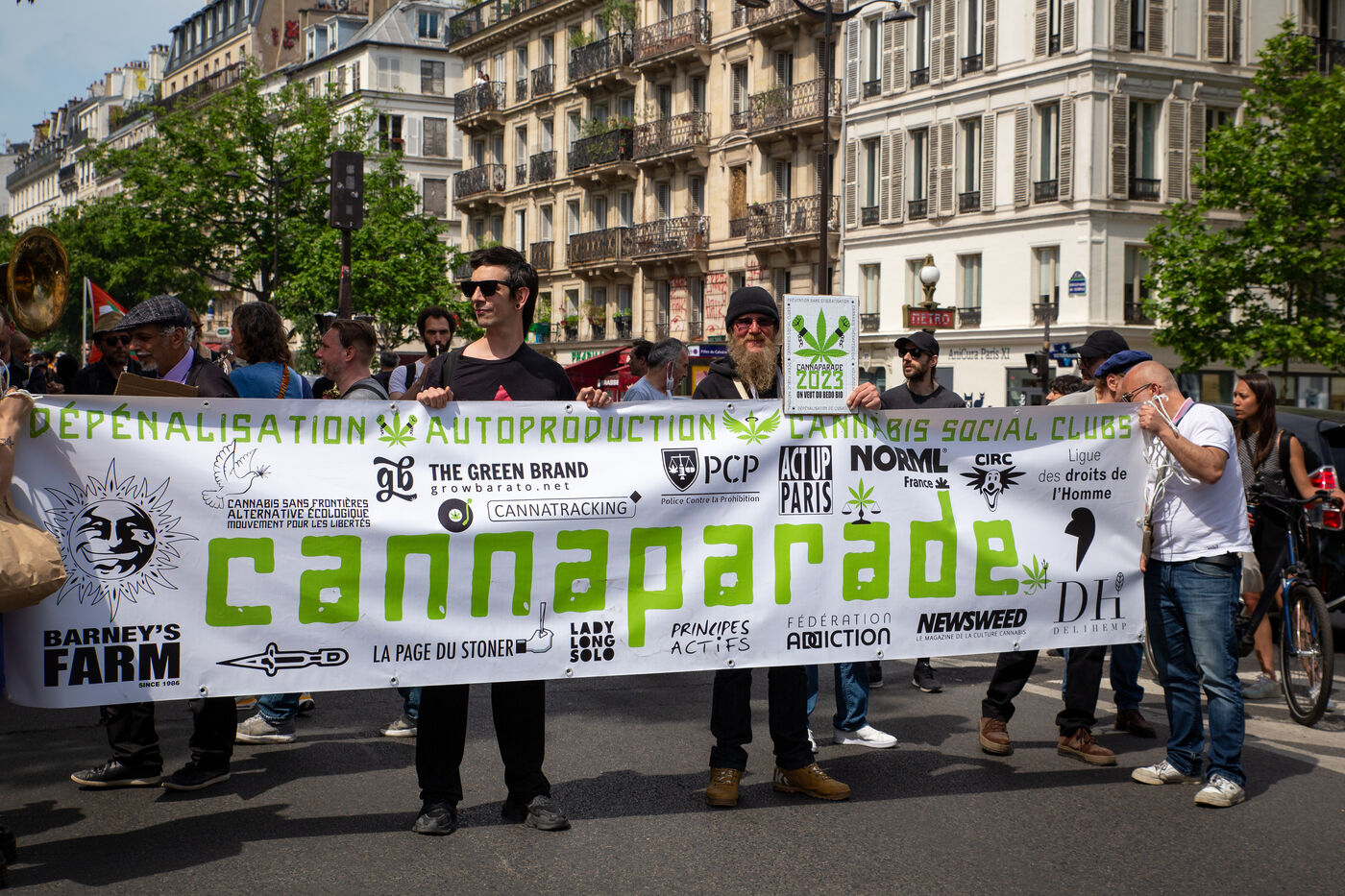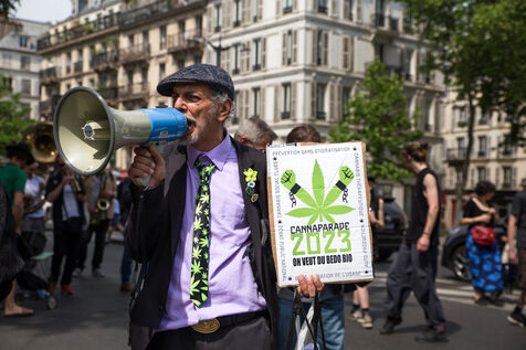 France, Paris, May 27, 2023. Cannaparade 2023. Supporters of drug law reform marched from Place de la République to Place de la Bastille, demanding alternatives to prohibition in order to liberate cannabis. They demanded: decriminalization of use, a national public debate, authorization for therapeutic cannabis, prevention without stigmatization, the possibility of self-production and Cannabis Social Clubs.