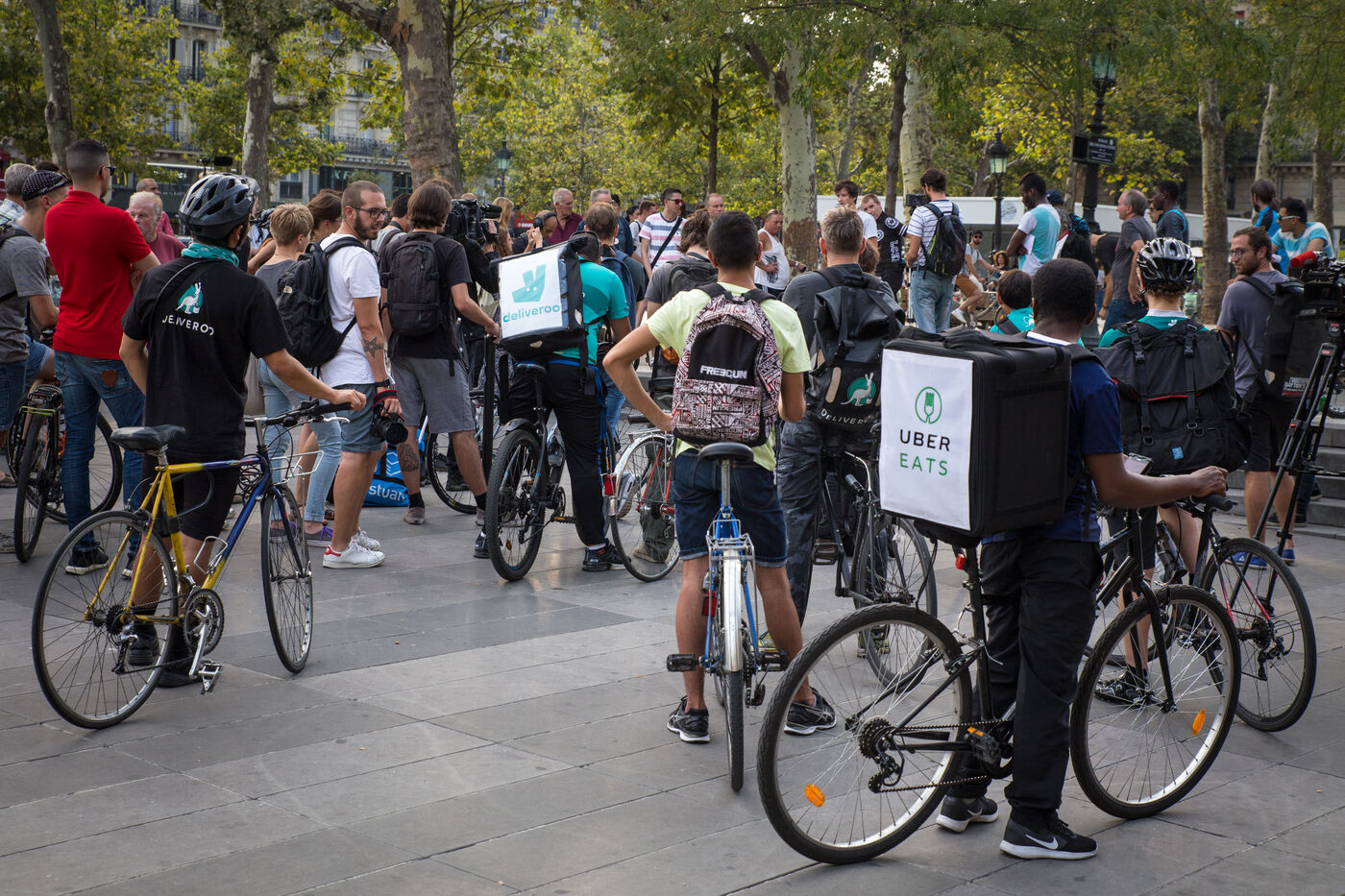 Dimanche 27 août 2017, Paris, France. Trente à quarante livreurs à vélos parisiens se sont rassemblés place de la République. Les coursiers Deliveroo rejoints par certains d'autres plateformes (Foodora, Stuart et UberEATS) contestent les nouveaux contrats mis en application par Deliveroo et tente d'organiser la lutte contre la précarité de leur condition.