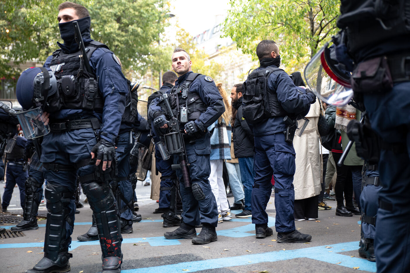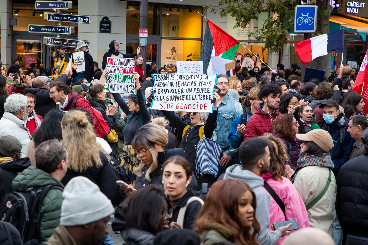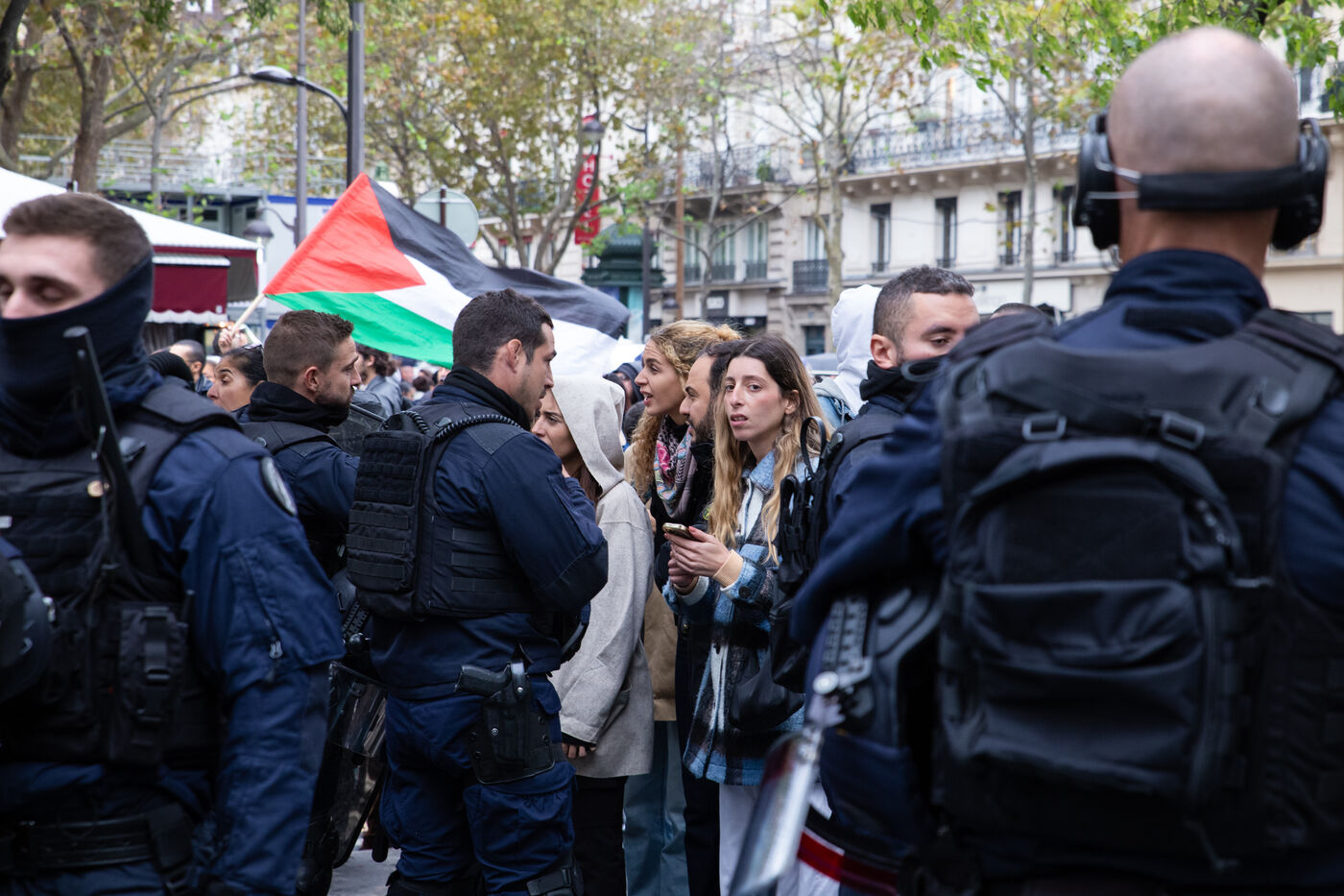 France, Paris, le 28 octobre 2023. Rassemblement en soutien au peuple palestinien, interdit par la Prefecture de Paris dans un contexte d alerte urgence attentat en France. Les manifestants venus exiger la fin de l?intervention militaire israelienne et bombardements sur Gaza, sont rapidement pris dans une nasse.