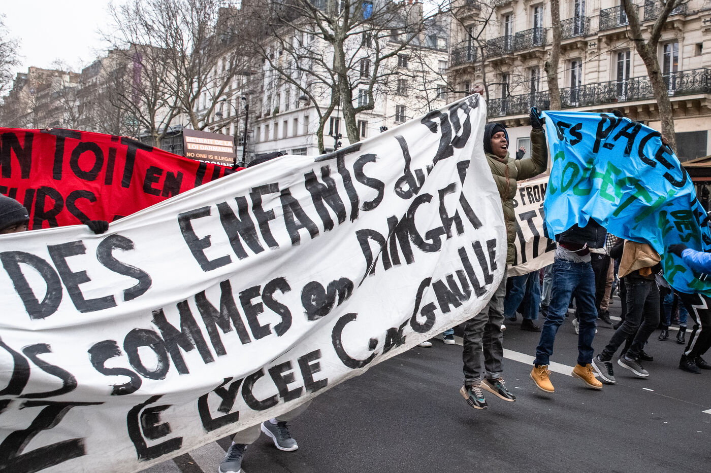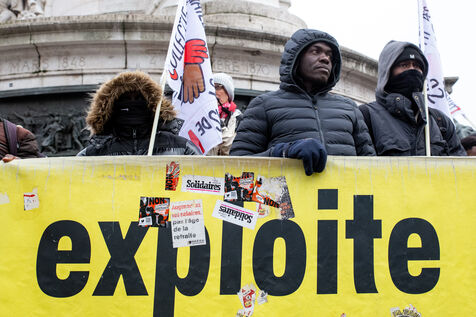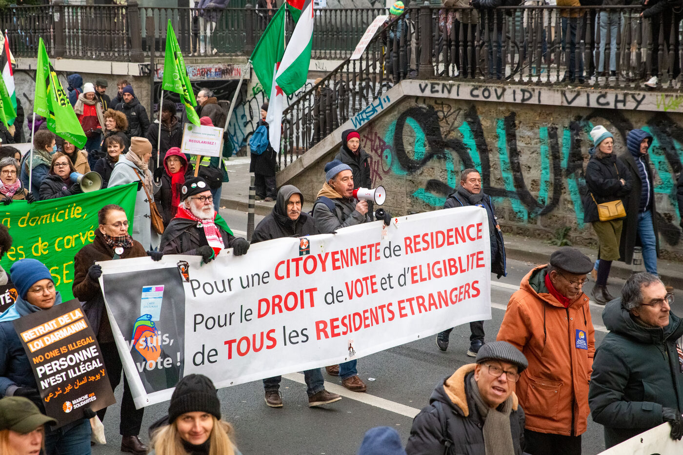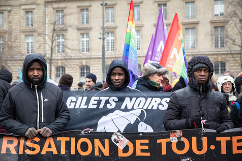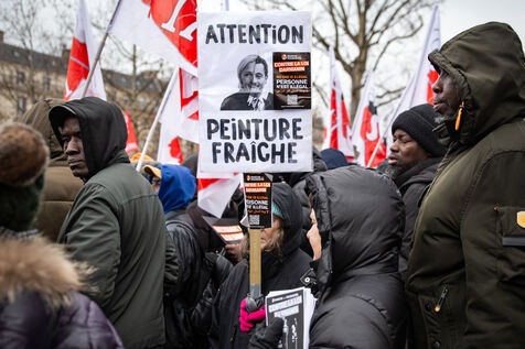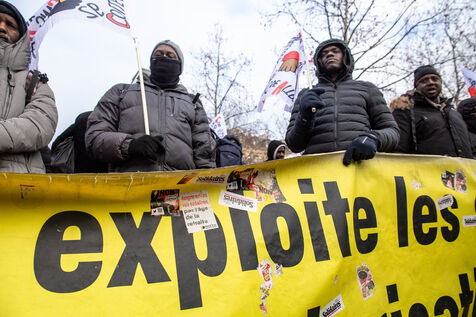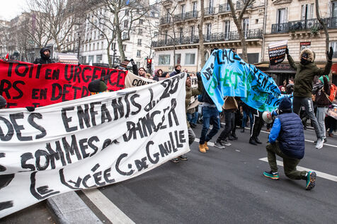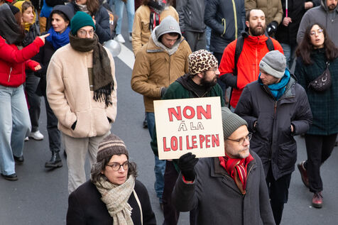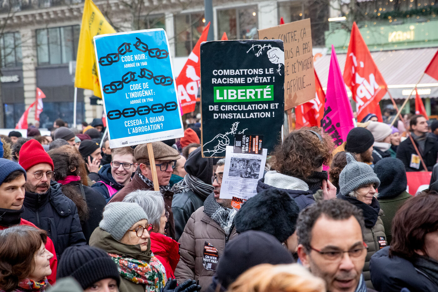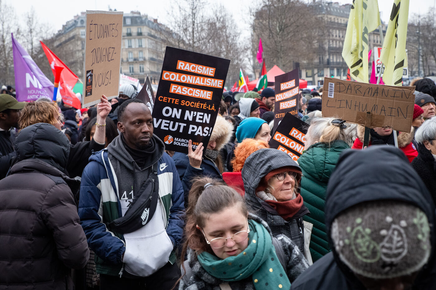 France, Paris, 14 January 2024. Demonstration in Paris against the Asylum and Immigration Bill, known as the Darmanin Bill, which provides for migration quotas, tougher rules on family reunification and access to certain benefits, as well as measures on integration, residence and asylum applications. Adopted at the end of December 2023, the bill is currently being examined by the Constitutional Council.