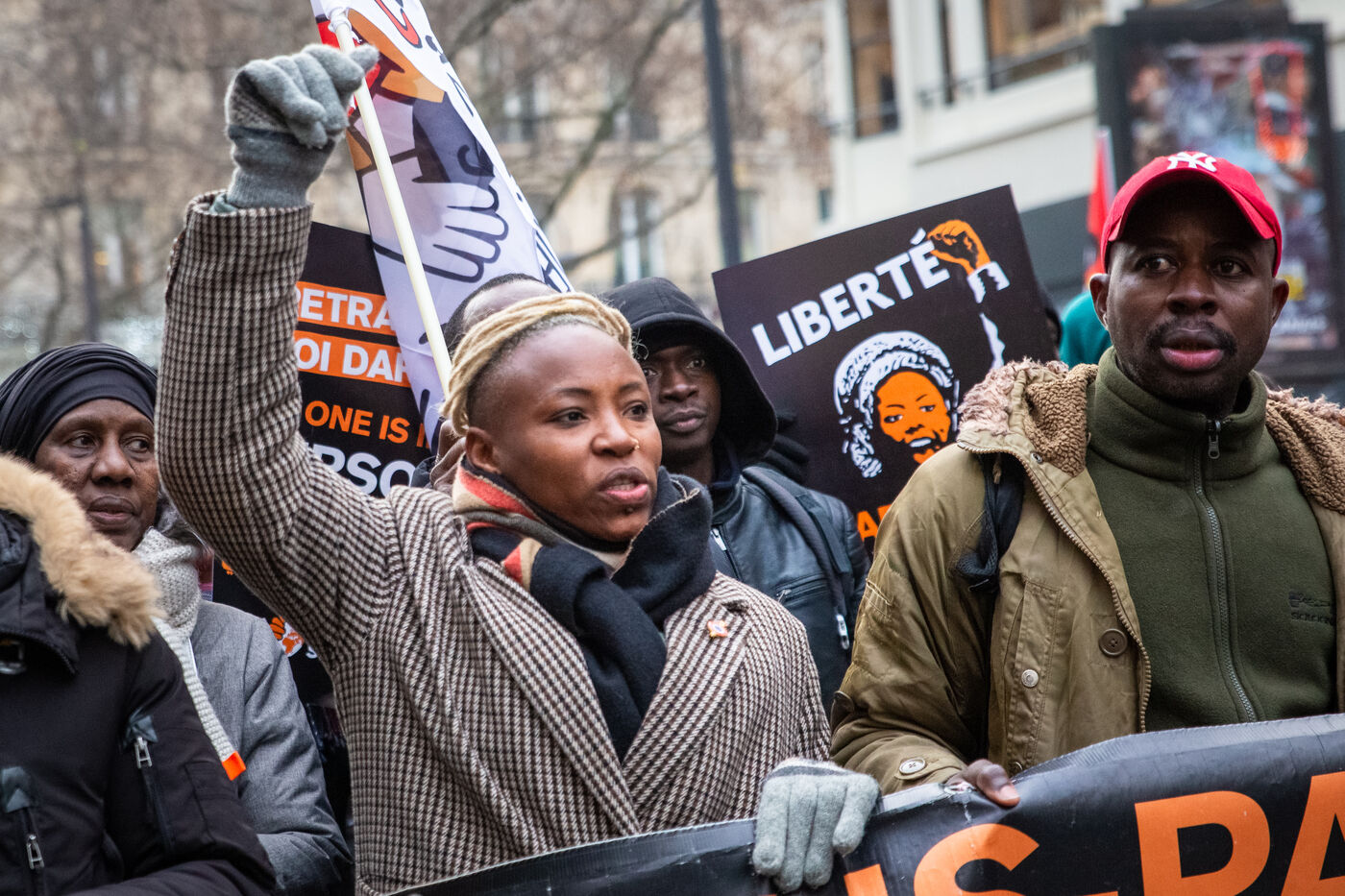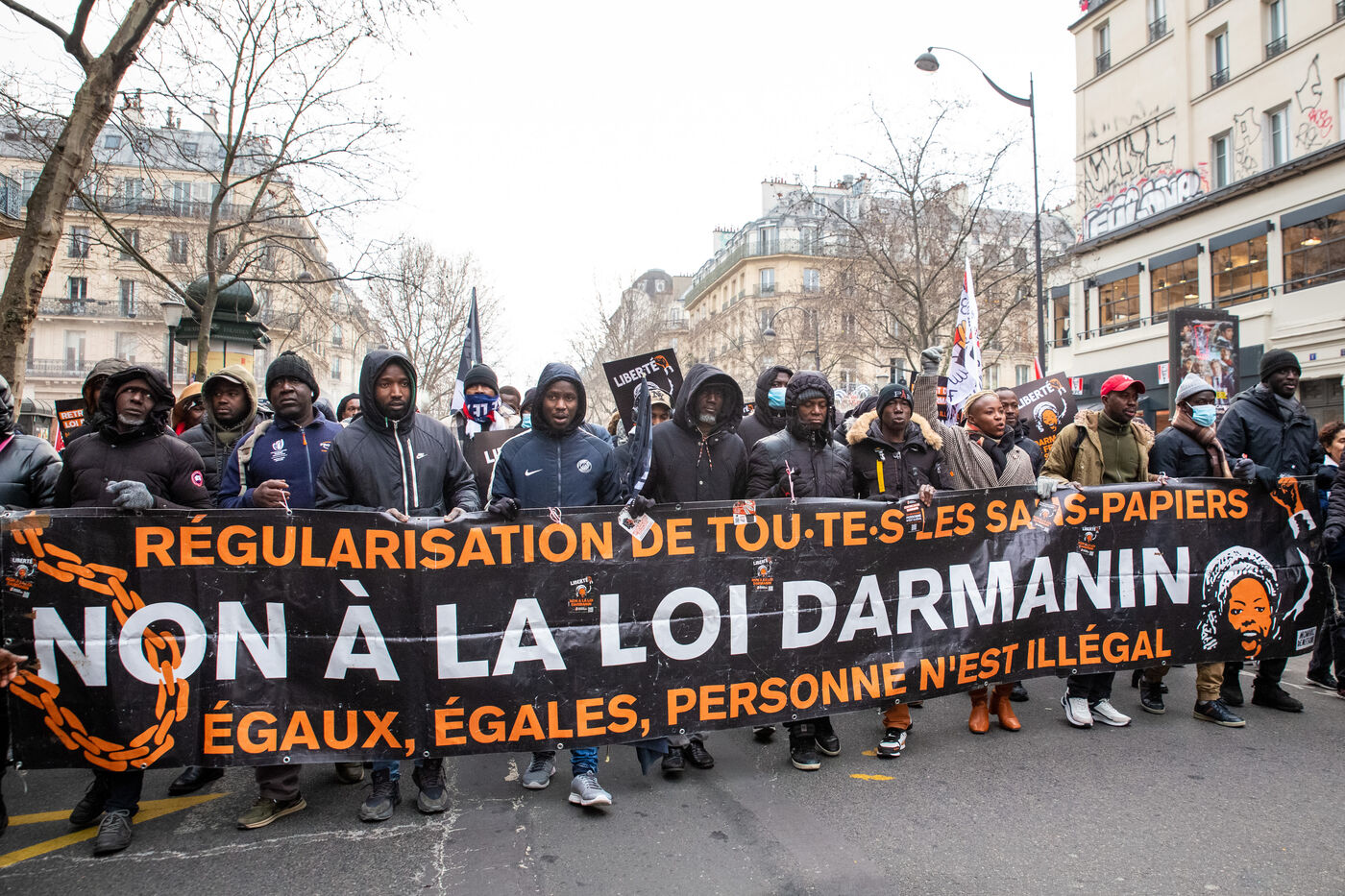 France, Paris, le 14 janvier 2024. Manifestation parisienne contre la loi asile immigration, dite loi Darmanin, qui prevoit notamment quotas migratoires, durcissement du regroupement familial et d?acces a certaines allocations, ainsi que des mesures sur l integration, le sejour et les demandes d asile. Adopté fin décembre 2023 le projet de loi est en cours d?examen au Conseil Constitutionnel.