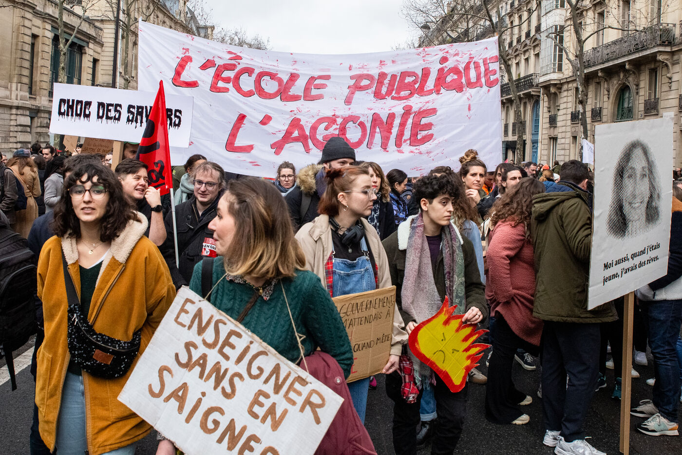 France, Paris, le 1ier fevrier 2024. Manifestation des enseignants, professeurs de l ecole publique et personnels de l Education nationale contre la politique du gouvernement et contre la ministre de l education nationale Amelie Oudea-Castera.