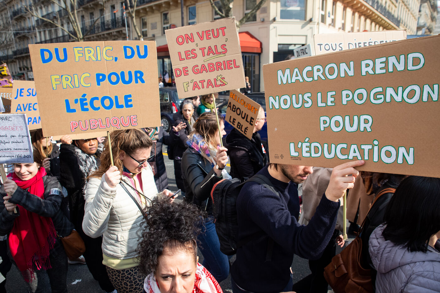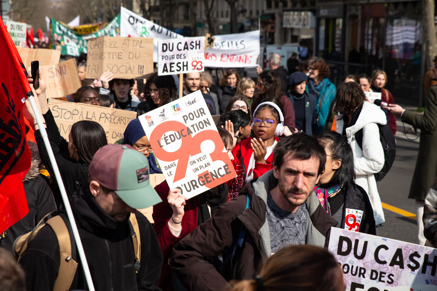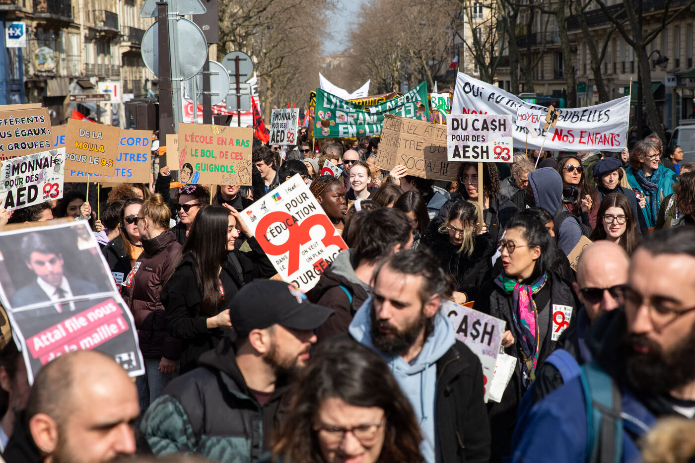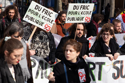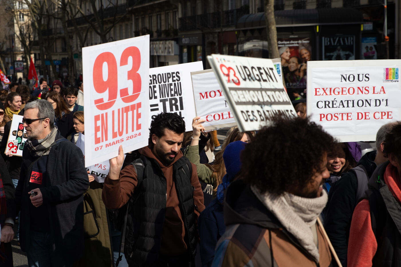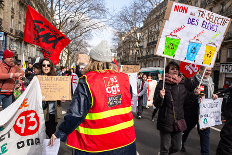 France, Paris, le 7 mars 2024. Manifestation a Paris des enseignants, assistants d education, parents d eleves et eleves de la Seine-Saint-Denis. A l appel de l intersyndicale (FSU, CGT Educ?action, SUD éducation, CNT), ils reclament un plan d urgence pour le departement le plus pauvre de France et protestent contre les groupes de niveaux. Alertant sur l etat d insalubrite des etablissements scolaires, ils demandent plus de moyens humains et financiers.