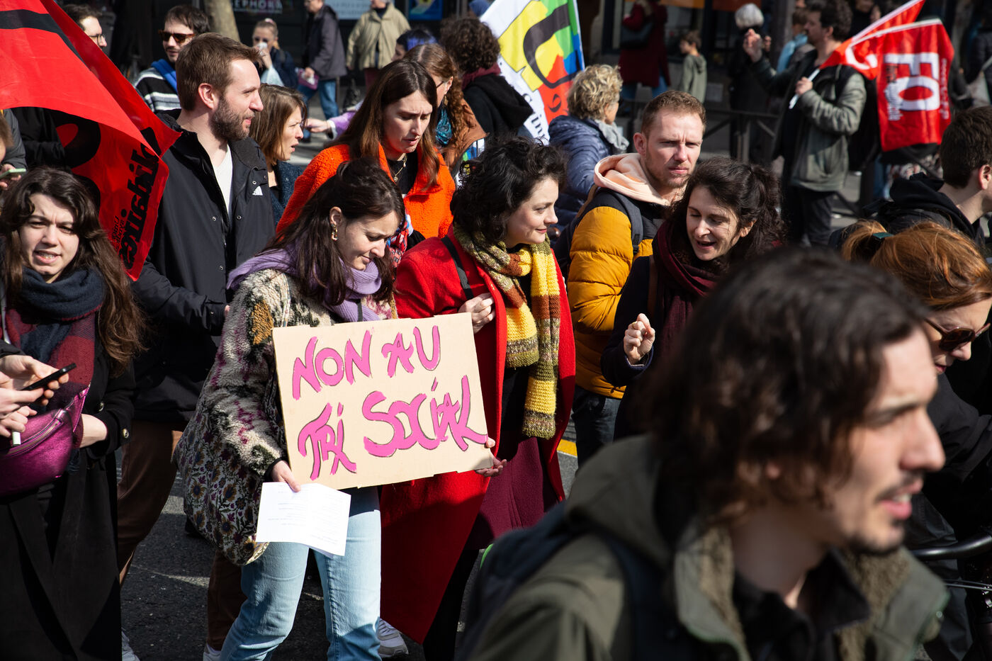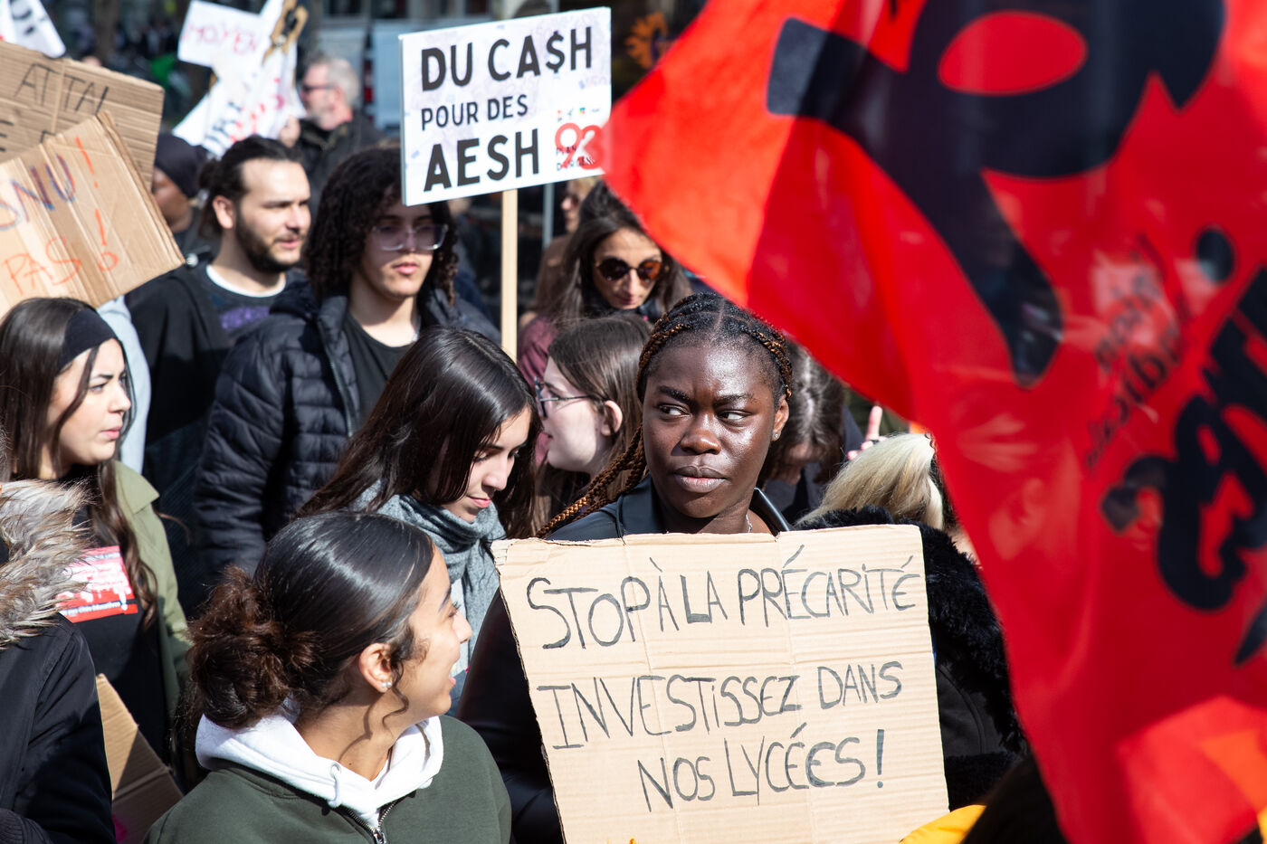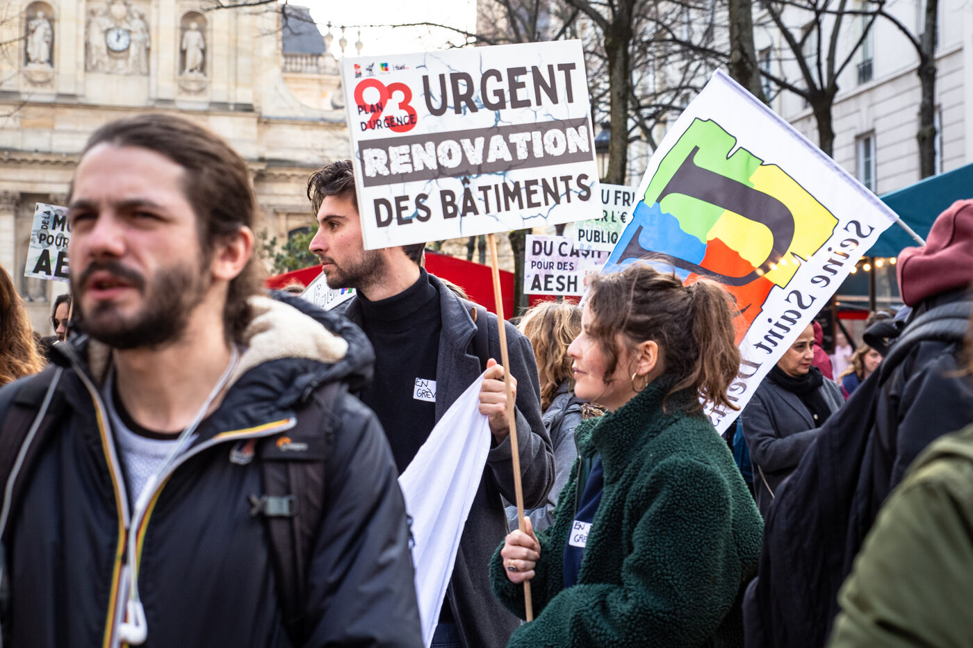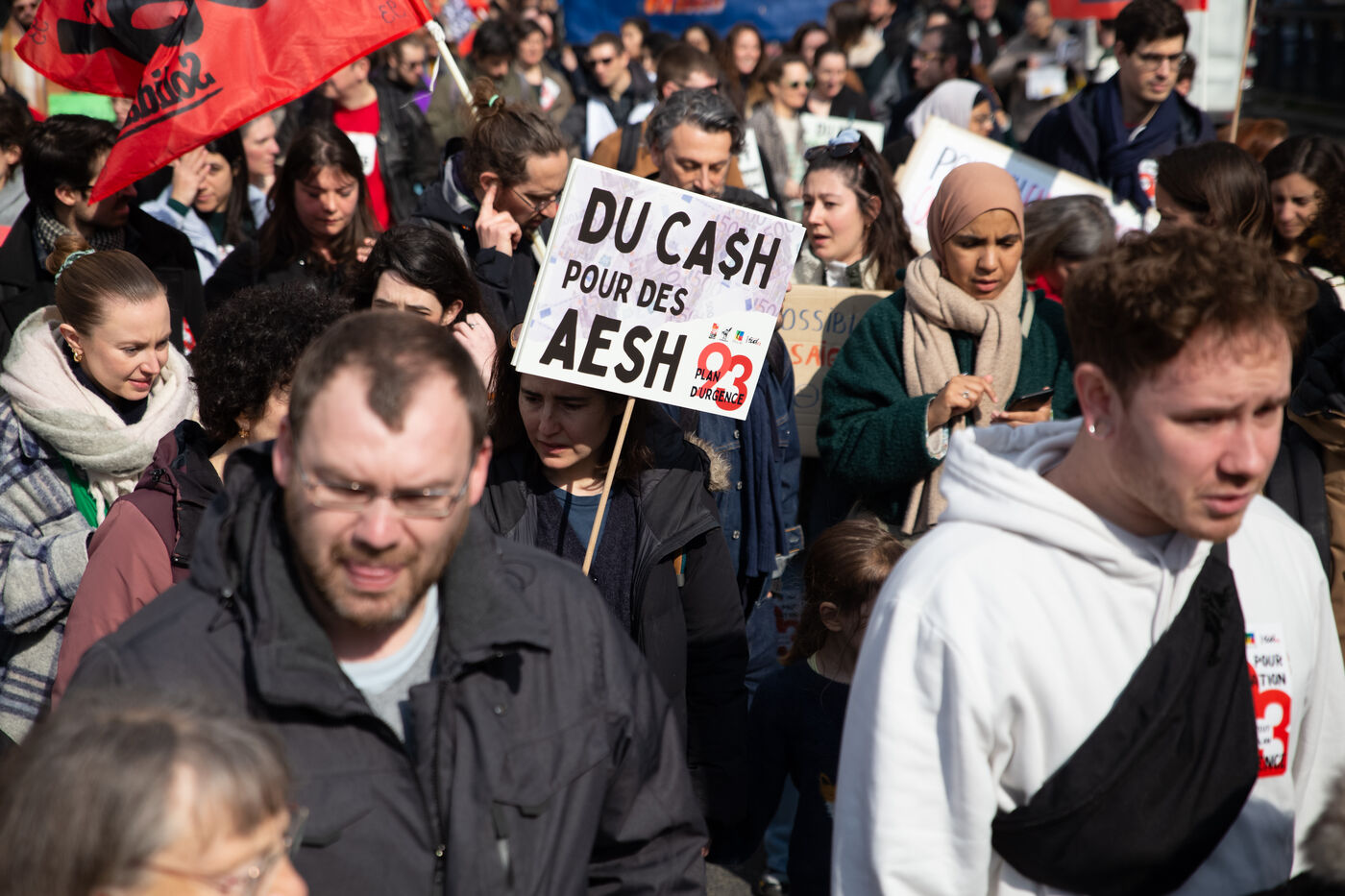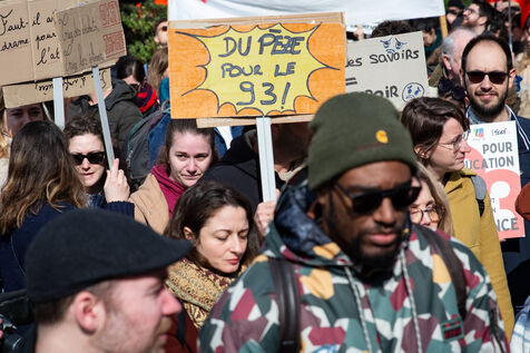 France, Paris, le 7 mars 2024. Manifestation a Paris des enseignants, assistants d education, parents d eleves et eleves de la Seine-Saint-Denis. A l appel de l intersyndicale (FSU, CGT Educ?action, SUD éducation, CNT), ils reclament un plan d urgence pour le departement le plus pauvre de France et protestent contre les groupes de niveaux. Alertant sur l etat d insalubrite des etablissements scolaires, ils demandent plus de moyens humains et financiers.