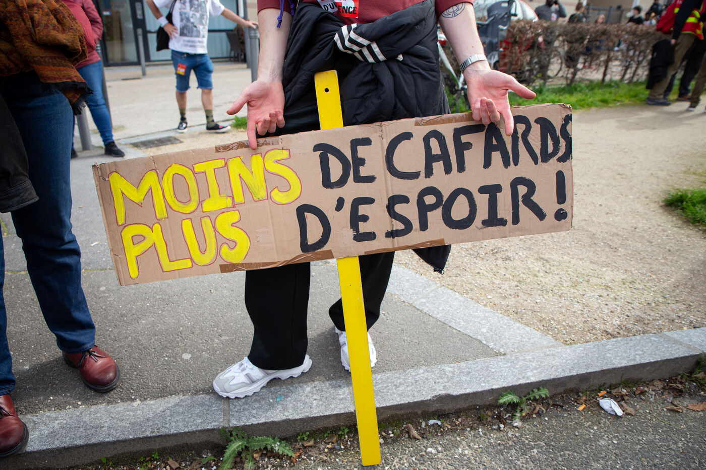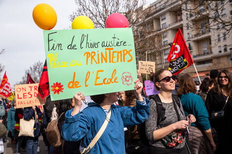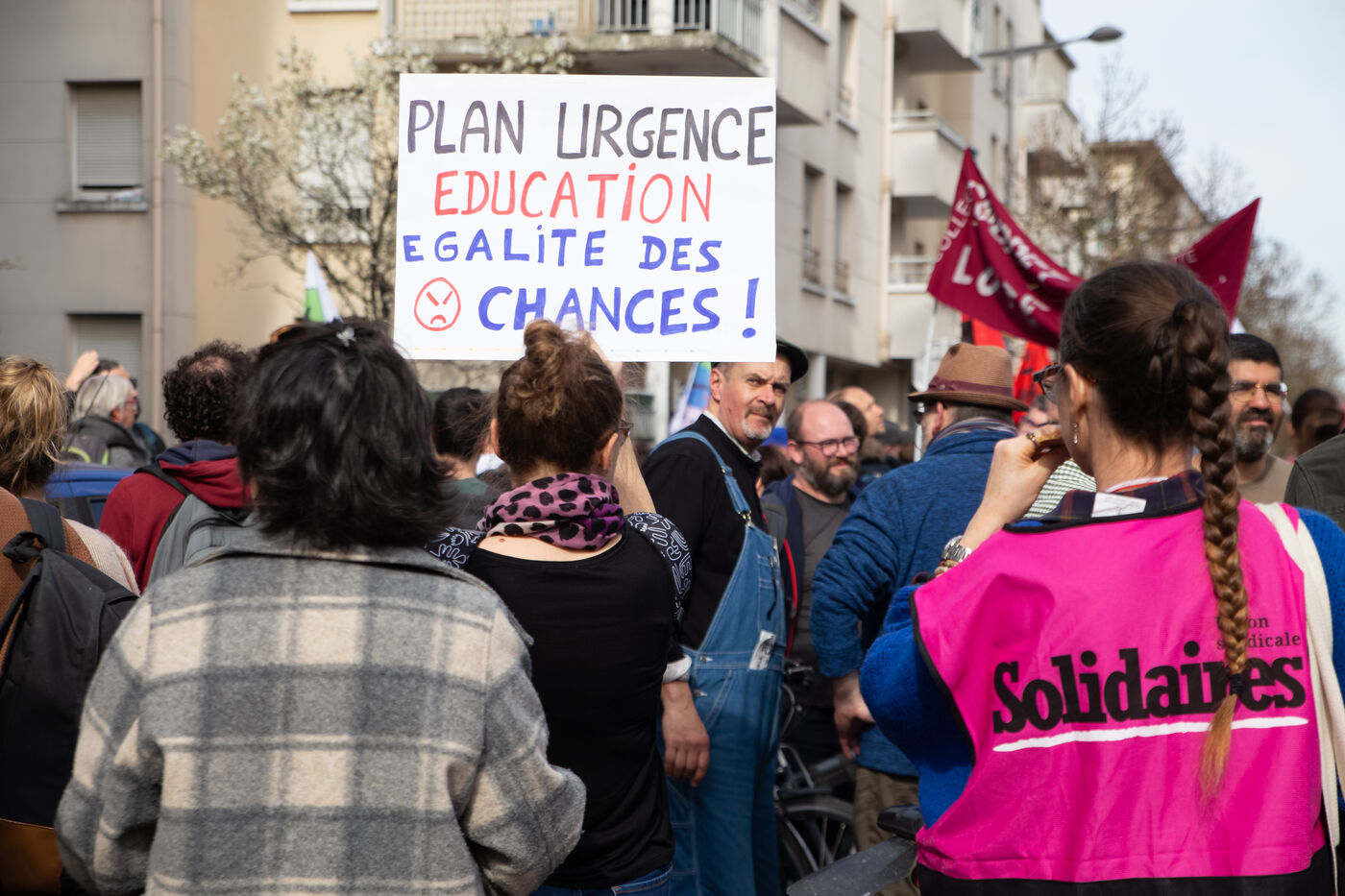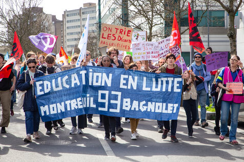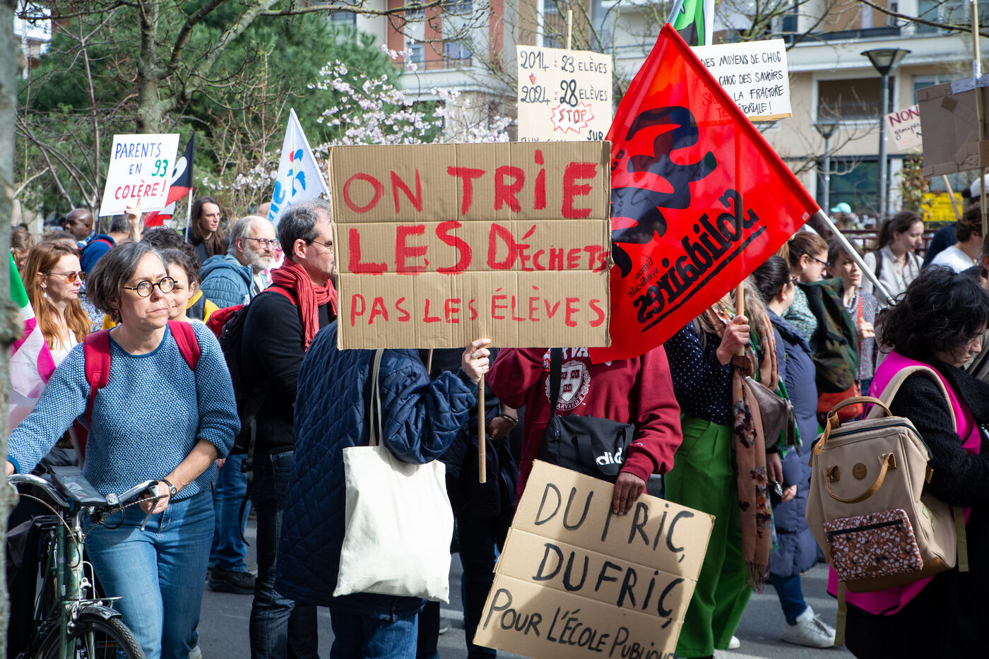 France, Bobigny, 14 March 2024. Rally in front of the DSDEN (Direction des services départementaux de l'Éducation nationale) in Bobigny. Various processions of teachers, education assistants, parents and pupils demonstrated on Thursday across Seine-Saint-Denis and converged on the prefecture to demand an emergency plan for the department's state schools. Following the call of the joint trade union (FSU, CGT Educ'action, SUD éducation, CNT), they demanded more human and financial resources and rejected the introduction of grade groups.
