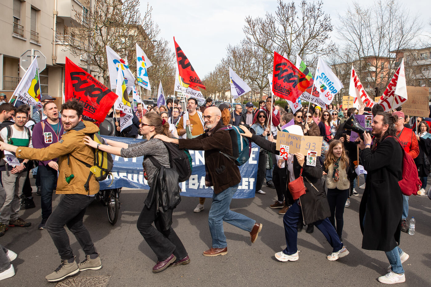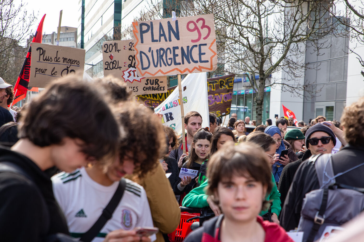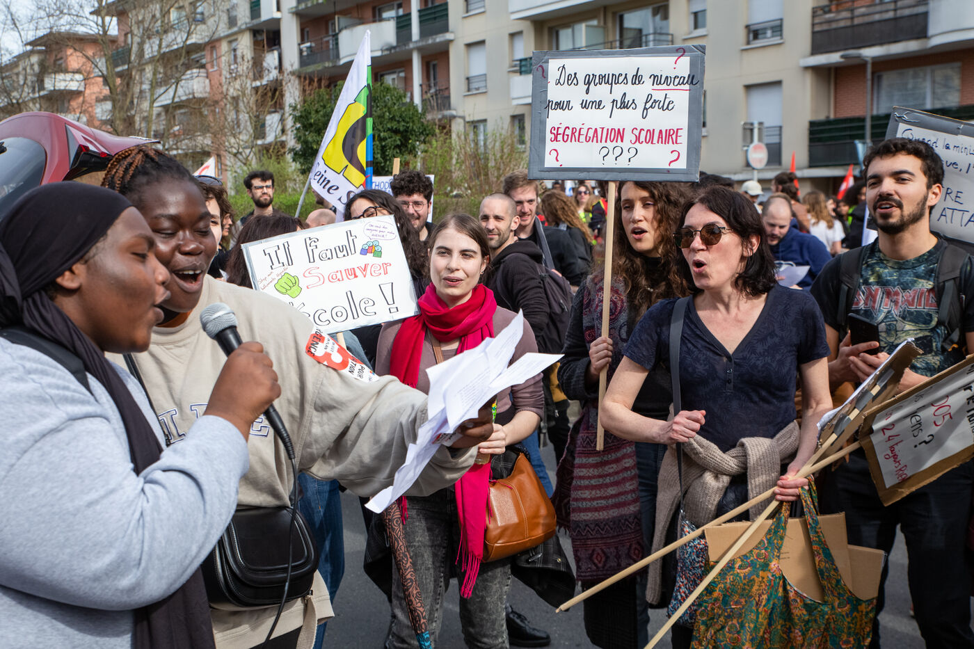 France, Bobigny, le 14 mars 2024. Rassemblement devant la Direction des services departementaux de l'Education nationale (DSDEN) a Bobigny. Differents corteges d enseignants, assistants d education, parents d eleves et eleves ont manifeste ce jeudi a travers la Seine-Saint-Denis et converge vers la prefecture afin d exiger un plan d urgence pour l'ecole publique du departement.. A l appel de l intersyndicale (FSU, CGT Educ?action, SUD éducation, CNT), ils reclament plus de moyens humains et financiers et refuse l instauration de groupes de niveaux.