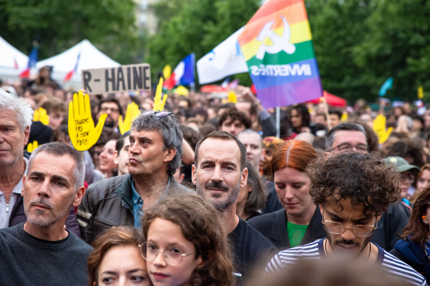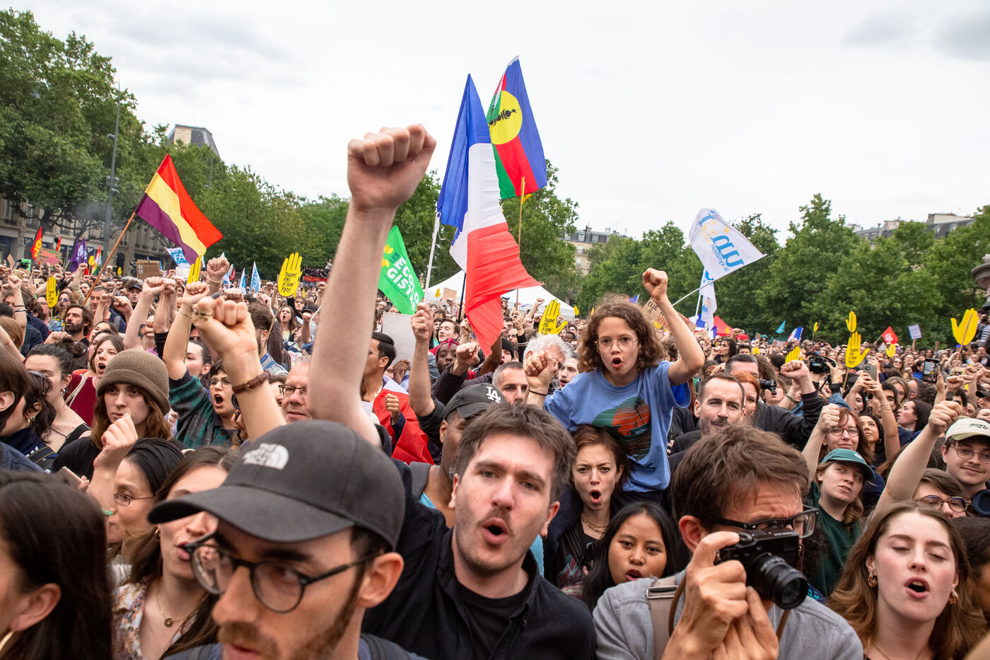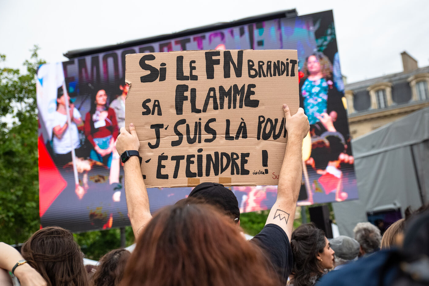 FRANCE, Paris, Place de la République, le 3 juillet 2024. Rassemblement pour un Front democratique contre l extreme droite organise par une centaines de medias independants, d associations et de syndicats, quatre jours avant le deuxieme tour des elections legislatives anticipees.