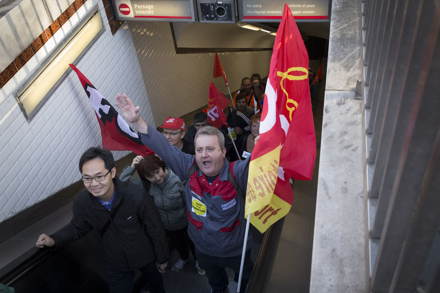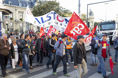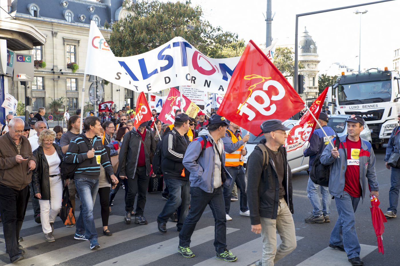 Saint Ouen, France, September 27, 2016. Rally against layoffs in front of Alstom headquarters. Employees demonstrate after the announcement of the closure of the historical site of Belfort.