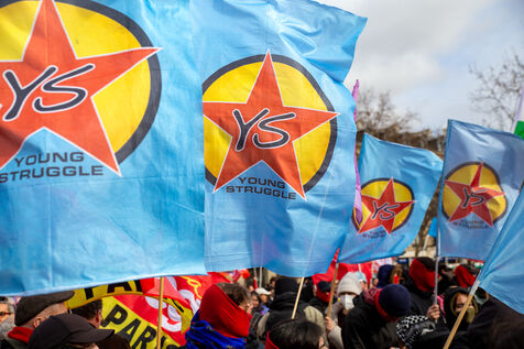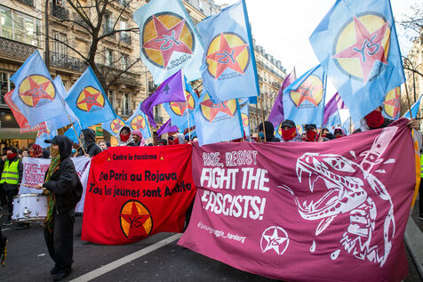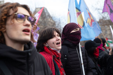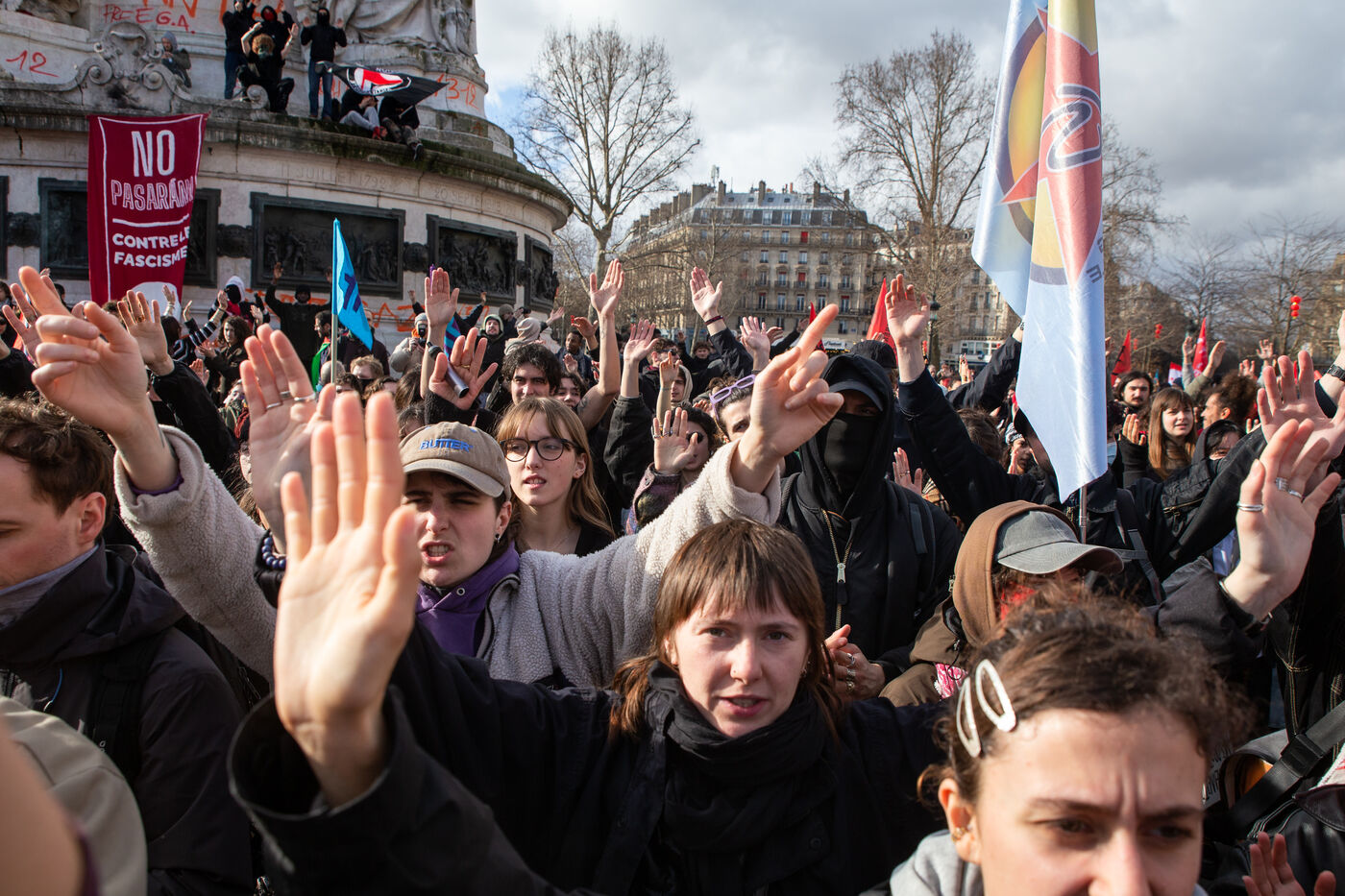 FRANCE, Paris, le 22 Fevrier 2025. Manifestation antifasciste a l appel de l Association Culturelle des Travailleurs Immigres de Turquie (ACTIT) et de Young Struggle, suite a une violente agression a l’arme blanche par des membres de l ultradroite. Militants antifascistes et sympathisants de gauche sont venus denoncer la brutalite de l extreme droite, le climat de violence et de xénophobie actuel. Ils ont voulu tenir la rue pour que les fascistes n y fassent pas leur loi.