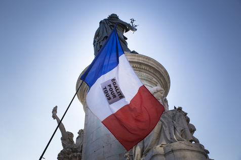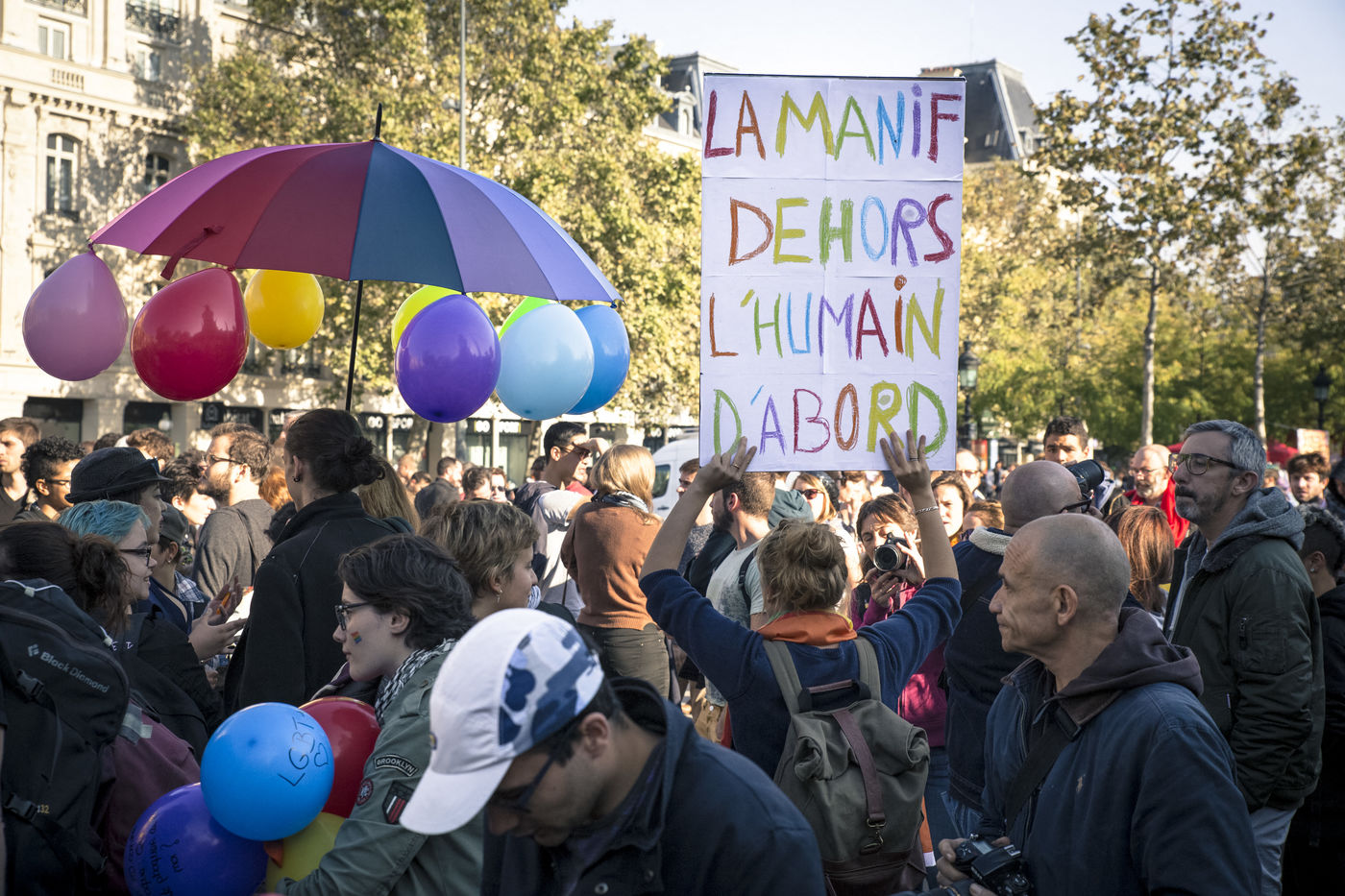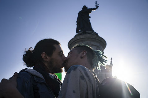 While the "manif pour tous" is taking place at the Trocadéro palace, a KissIN (people kissing each other in a public place) is happening at the same time Place de la République, in Paris, the 16th october 2016.