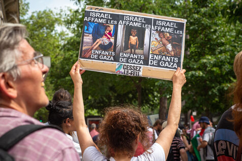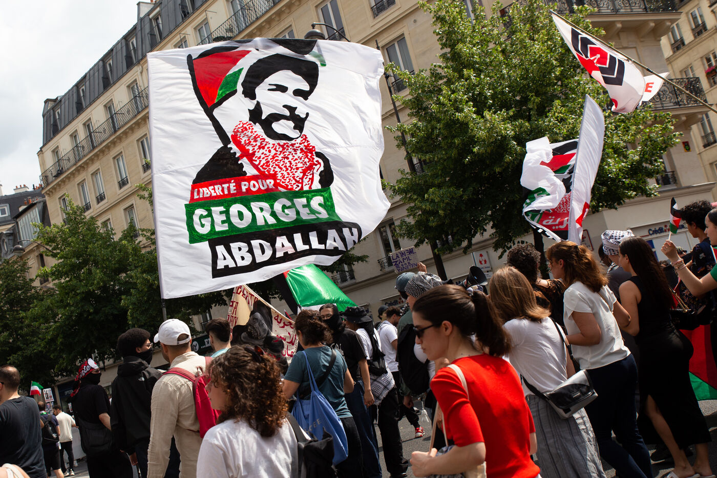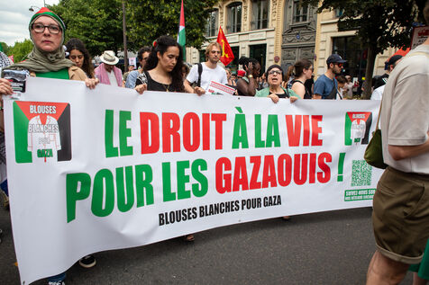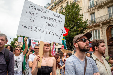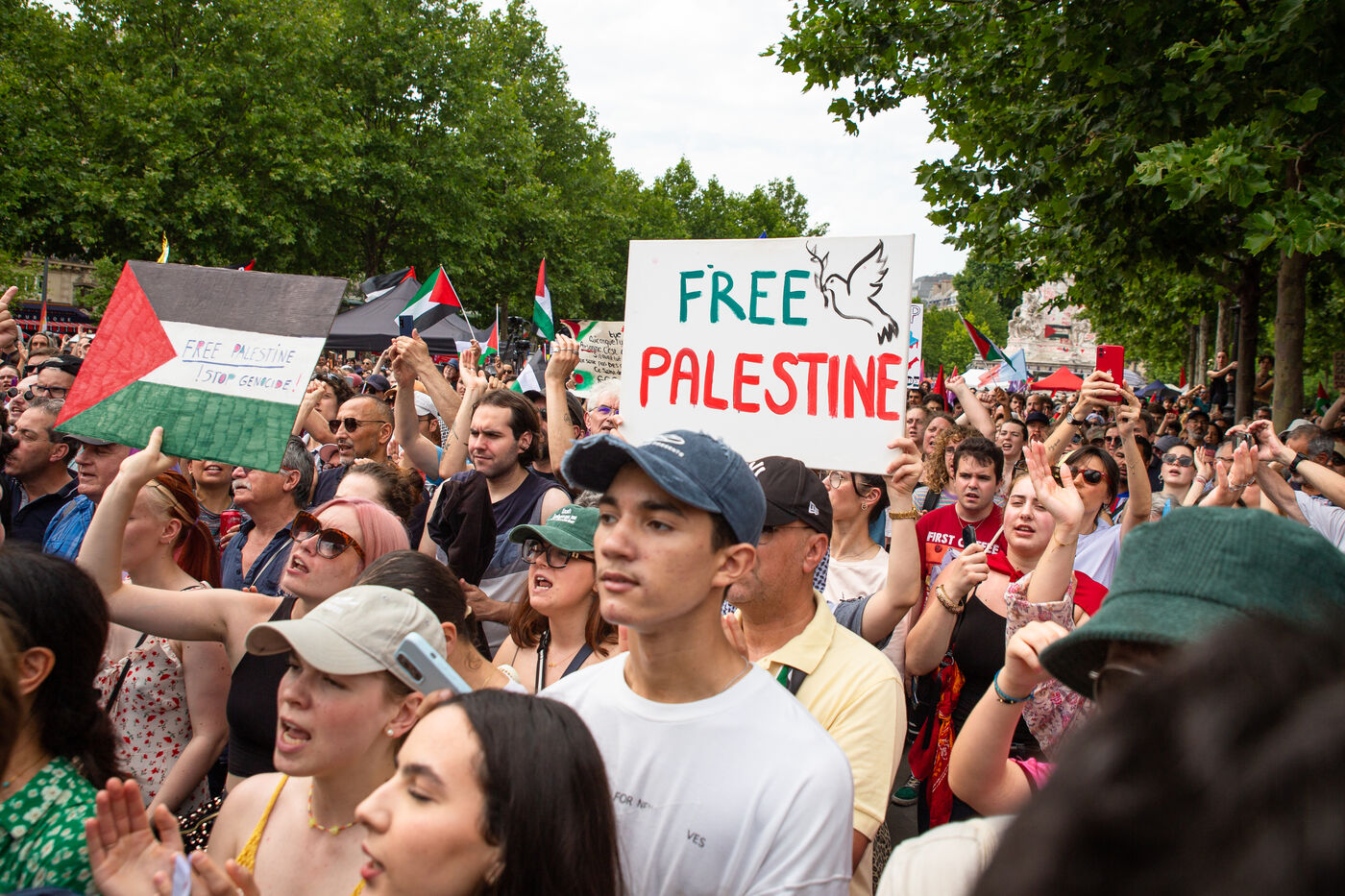 France, Paris, June 14, 2025. Mobilization for Palestine at the call of an inter-union coalition bringing together CFDT, CGT, Unsa, Solidaires, and FSU, the National Collective for a Just and Lasting Peace between Palestinians and Israelis (CNPJDPI), and left-wing parties (LFI, PS, PCF, EELV). Denouncing the abuses committed in Gaza (bombing of civilians, forced displacement, starvation as a weapon of war), and pointing to the genocidal intentions of the Israeli government, the organizers are calling for an immediate ceasefire and unhindered access for humanitarian aid.