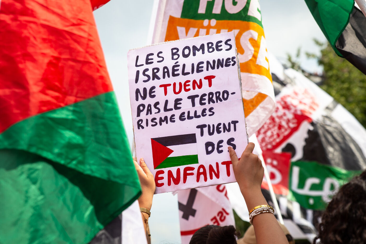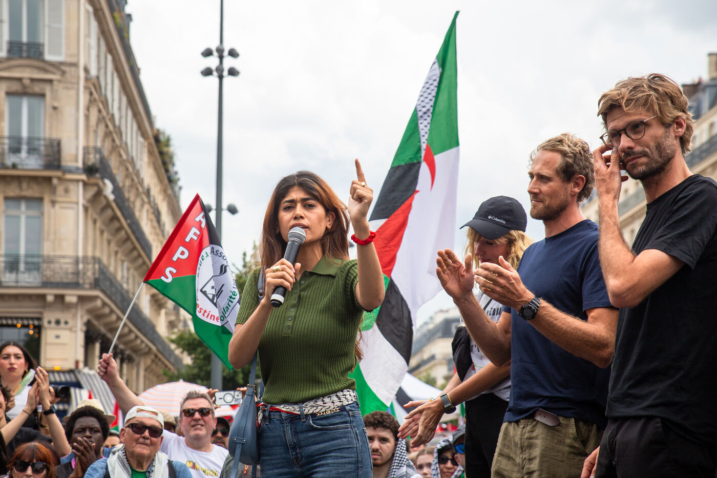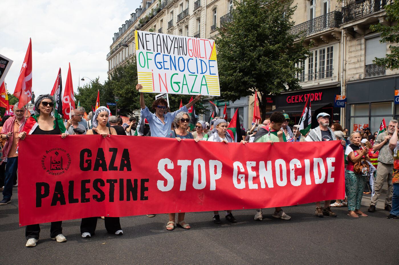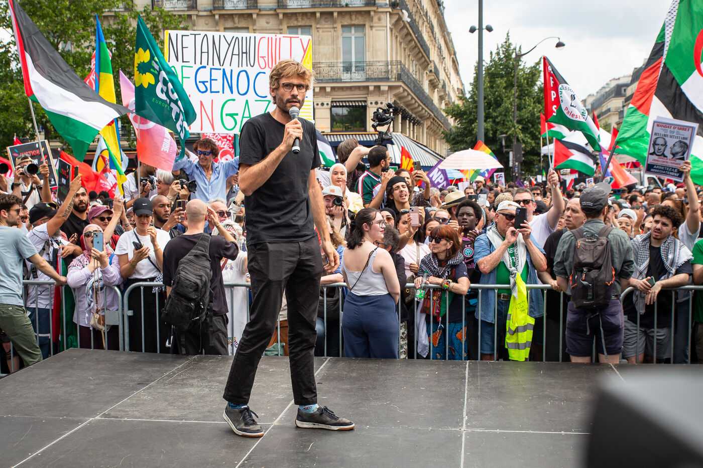 France, Paris, 14 juin 2025. Mobilisation pour la Palestine a l appel d une intersyndicale reunissant CFDT, CGT, Unsa, Solidaires et FSU, du Collectif national pour une Paix Juste et Durable entre Palestiniens et Israéliens (CNPJDPI) des partis de gauche (LFI, PS, PCF, EELV). Denonçant les exactions commises a Gaza (bombardements de civils, deplacements forces, famine comme arme de guerre), et pointant les intentions genocidaires du gouvernement israelien, les organisateurs reclament un cessez-le-feu immediat et un acces sans entraves de l aide humanitaire.