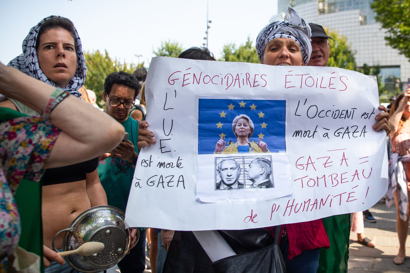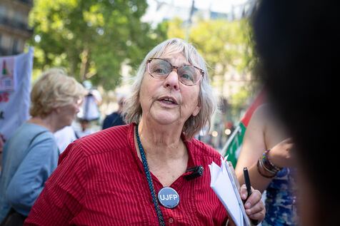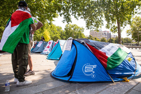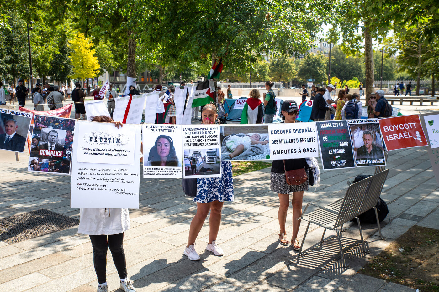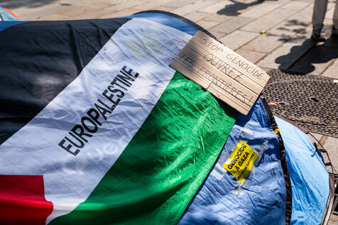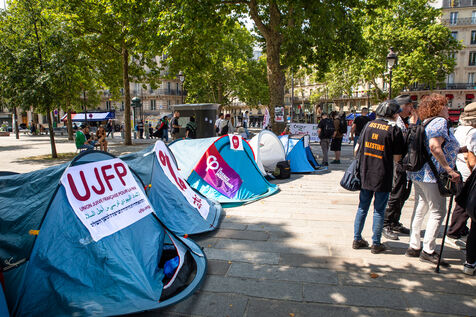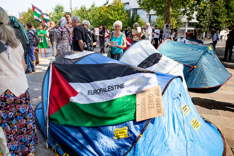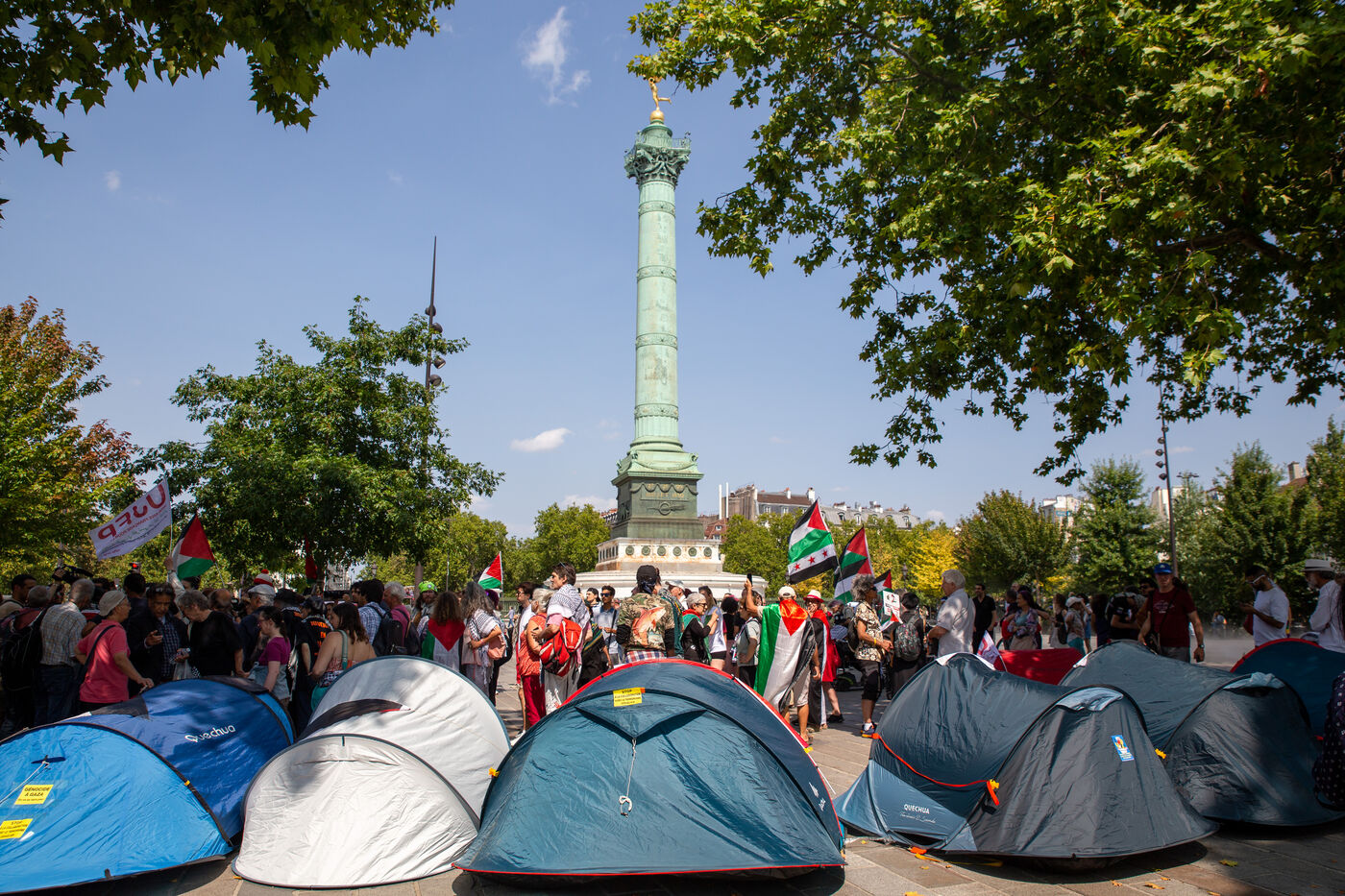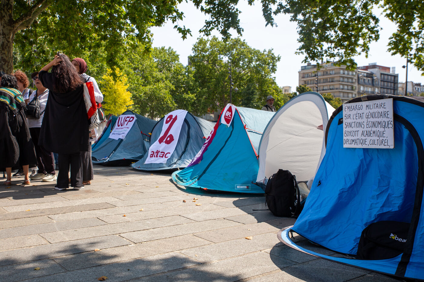 France, Paris, August 9, 2025. Several dozen activists in solidarity with the Palestinian people have set up a camp on Place de la Bastille to demand sanctions against the genocidal Israeli regime. Organized by the French Jewish Union for Peace (UJFP), this action brought together activists from several other organizations: EuroPalestine, LFI, AFPS, Attac, NPA, BDSFrance...