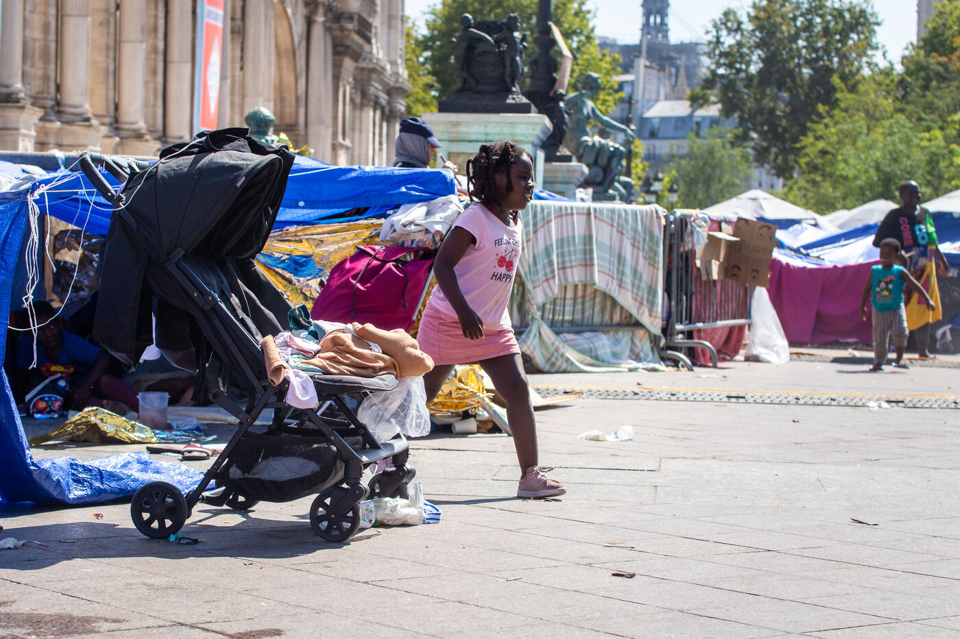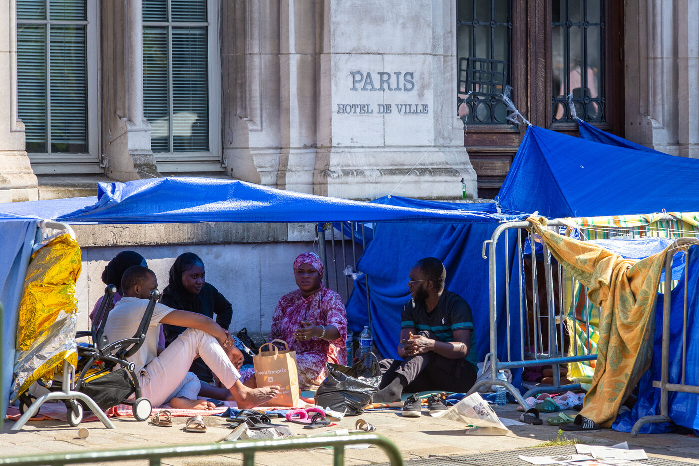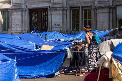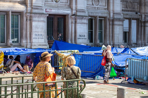 France, Paris, City Hall, August 11, 2025. More than 250 people, mostly families or single women with children, have been occupying the square in front of Paris City Hall for a week. With the help of the Utopia 56 association, they are camping in front of Paris City Hall to obtain decent emergency accommodation.