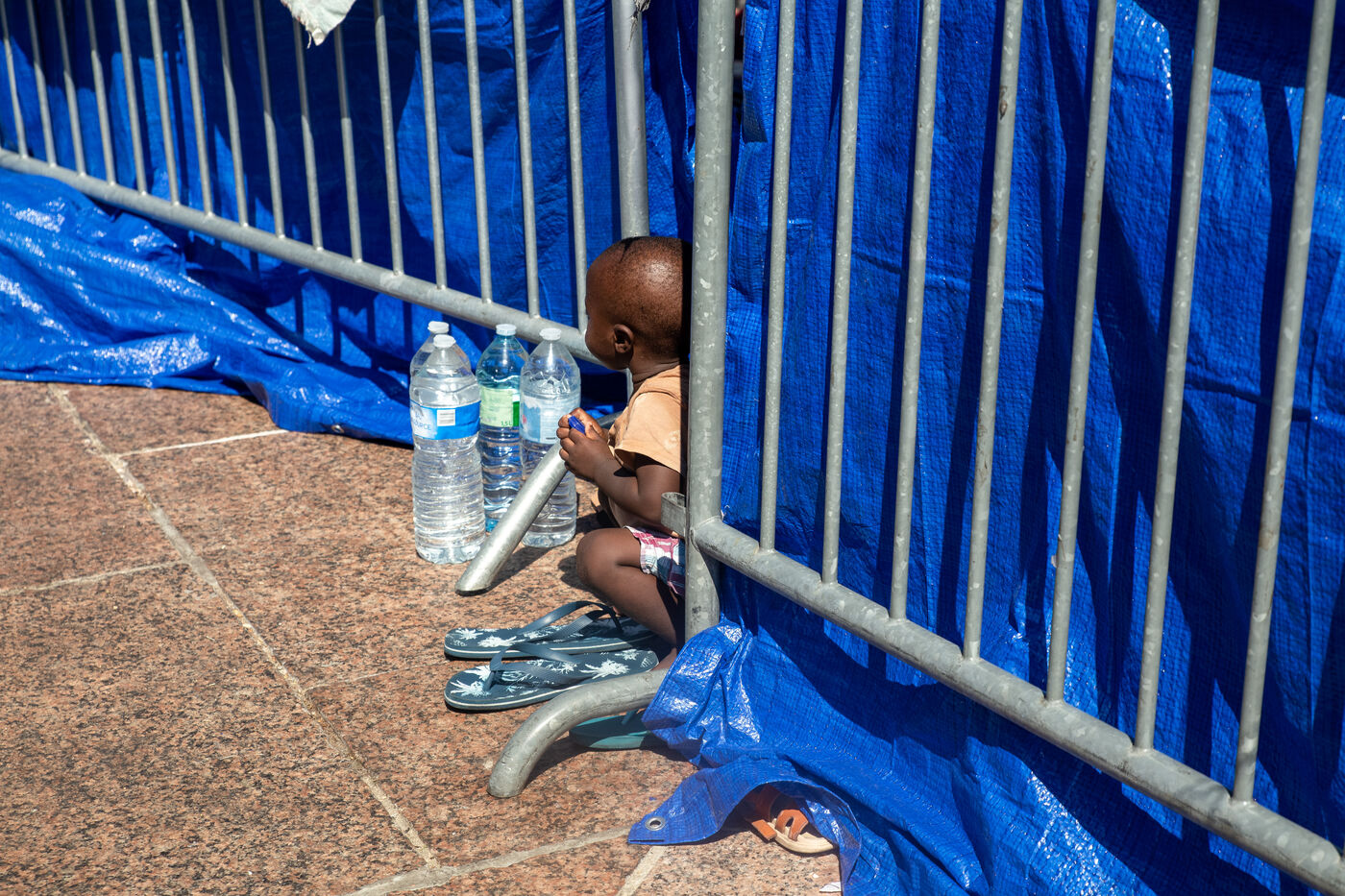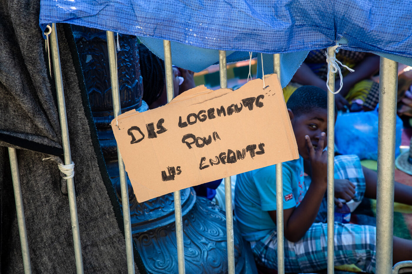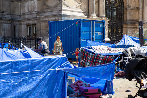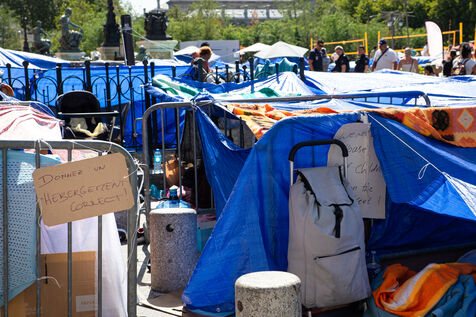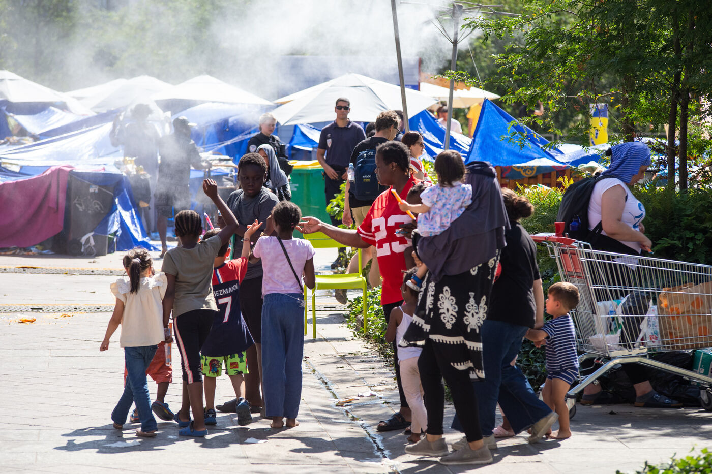 France, Paris, City Hall, August 11, 2025. More than 250 people, mostly families or single women with children, have been occupying the square in front of Paris City Hall for a week. With the help of the Utopia 56 association, they are camping in front of Paris City Hall to obtain decent emergency accommodation.