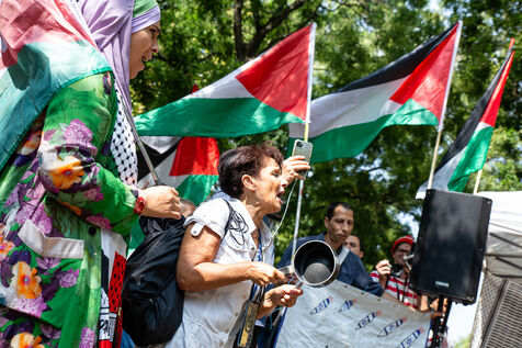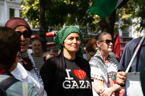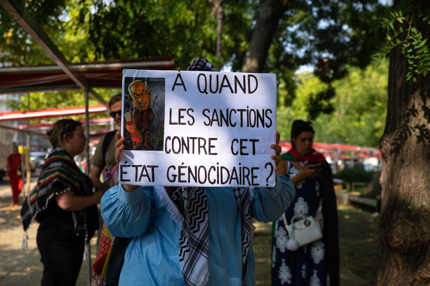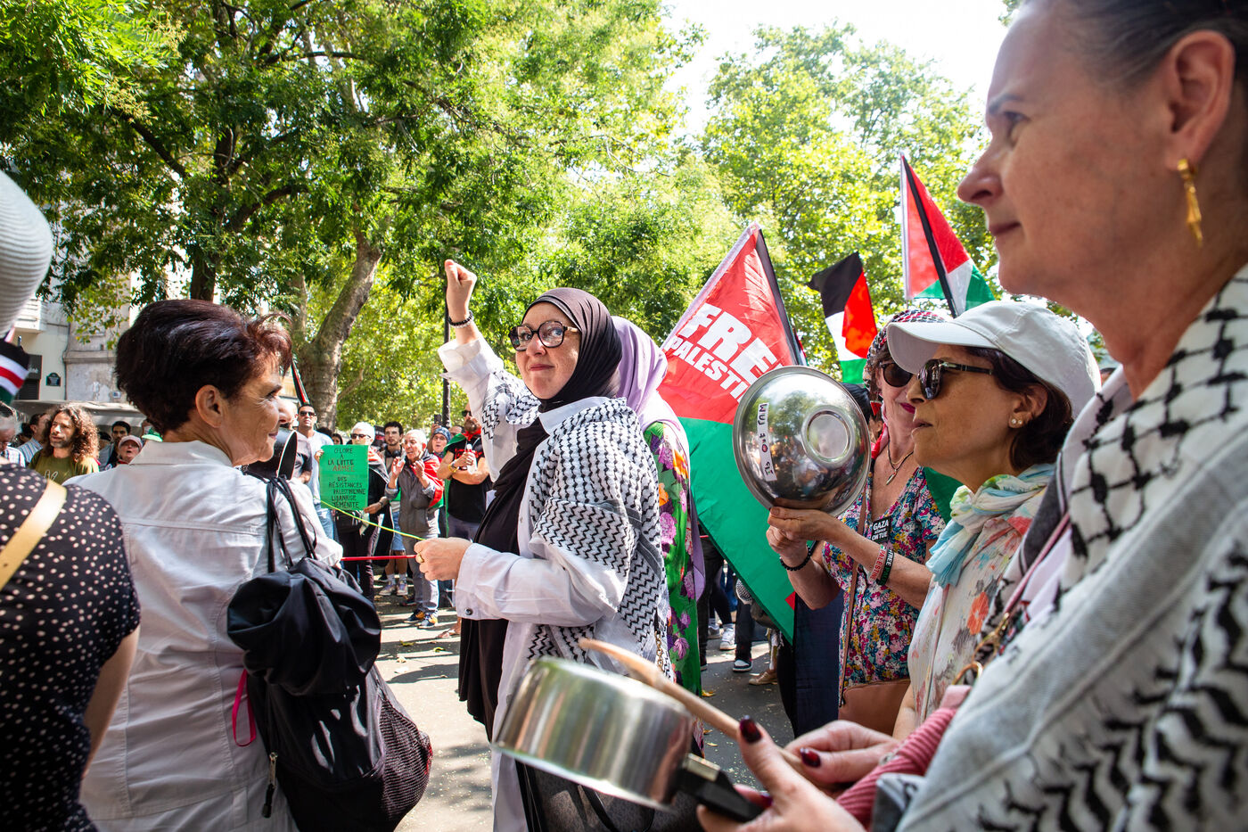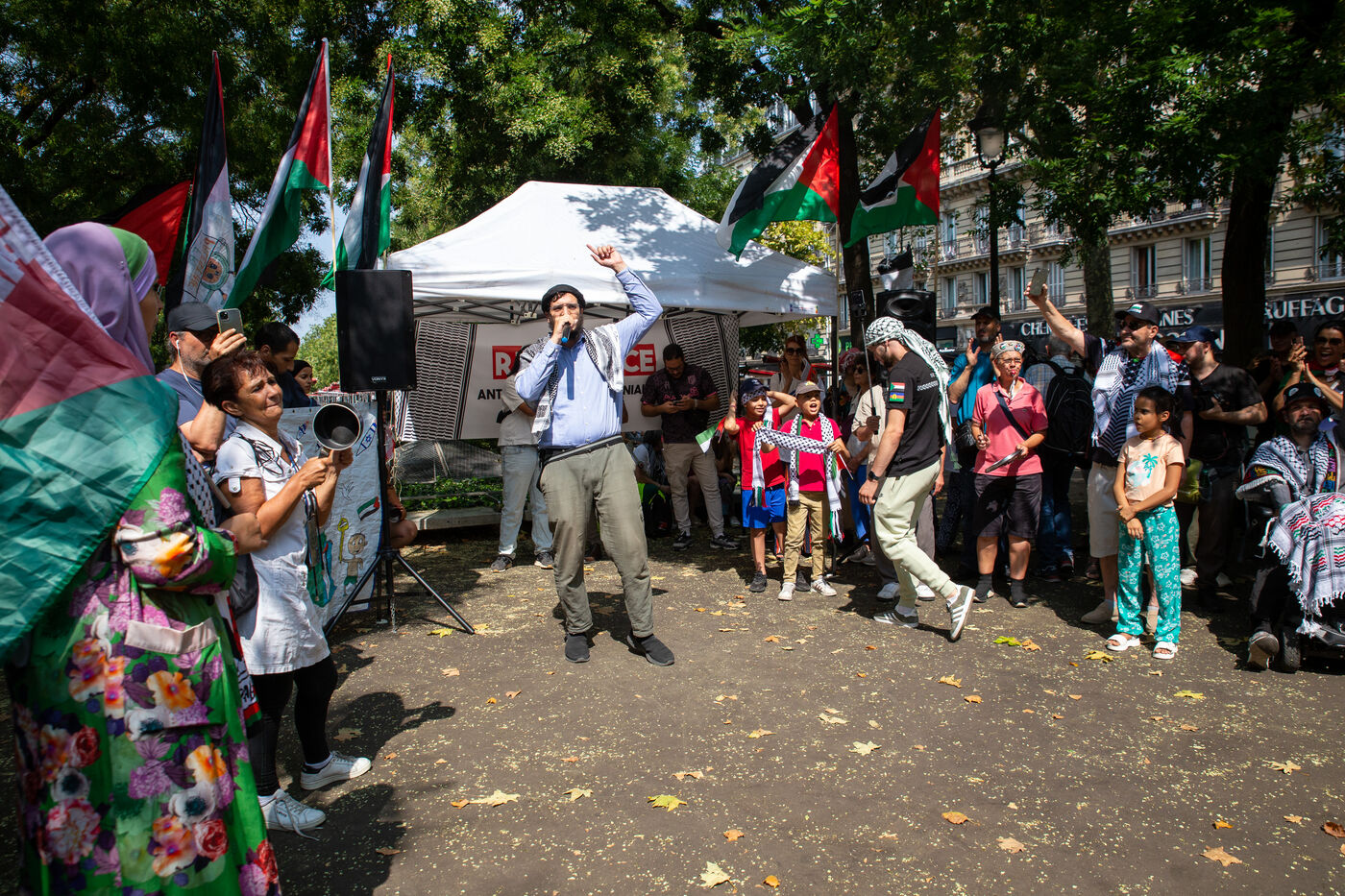 France, Paris, le 9 Aout 2025. Rassemblement pour la Palestine. Malgre la treve estivale, plusieurs centaines de citoyens continuent de se mobiliser en solidarite avec le peuple palestinien. Ils alertent sur le genocide et la famine en cours a Gaza, reclament un cessez-le-feu et des sanctions contre le regime israelien.