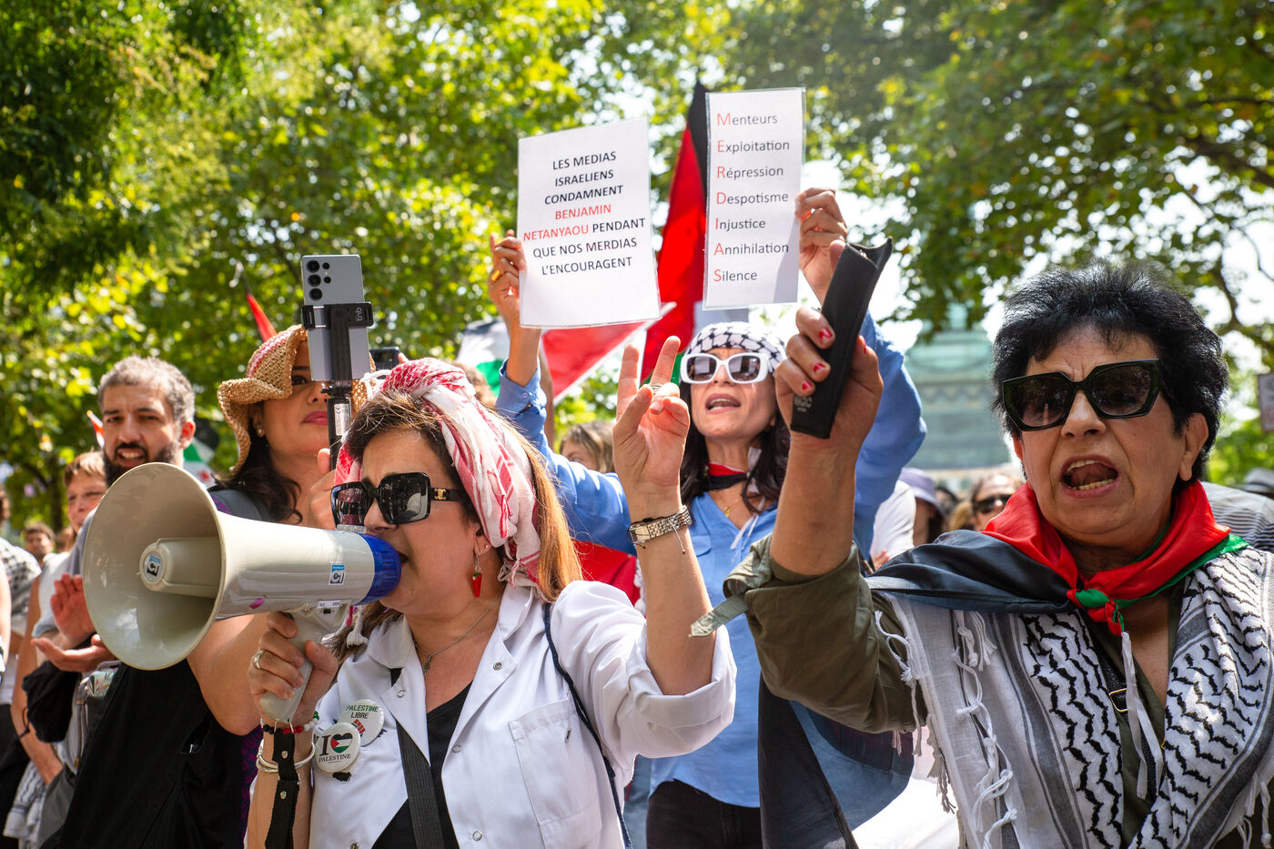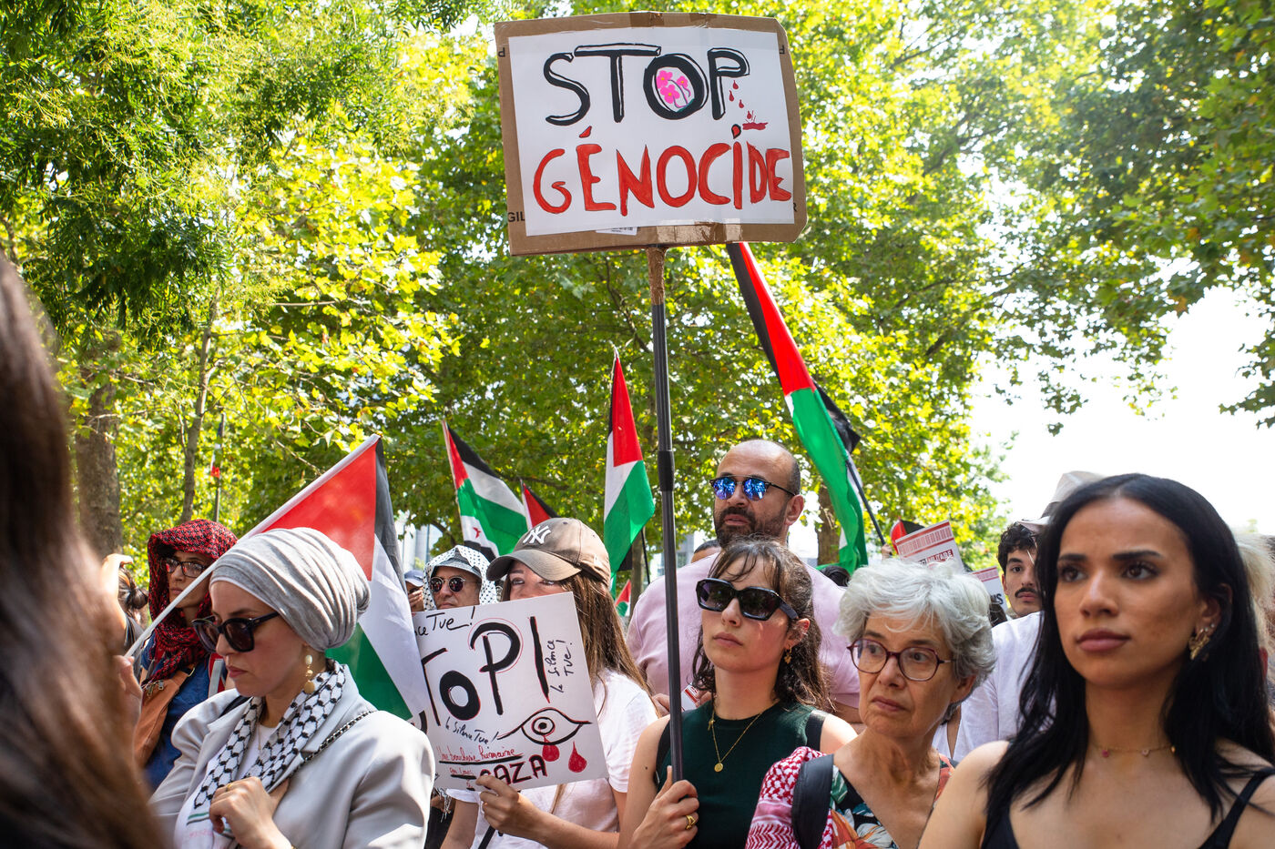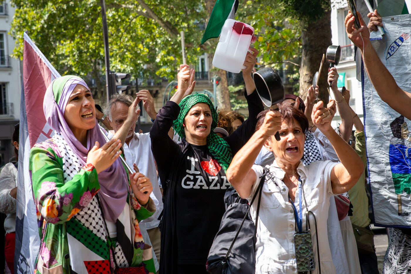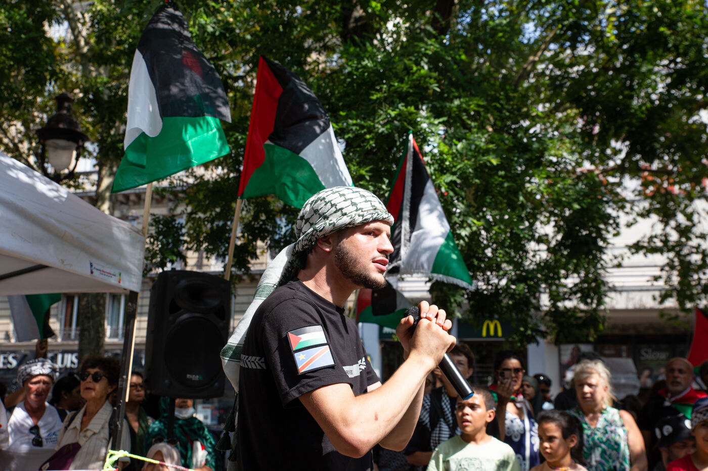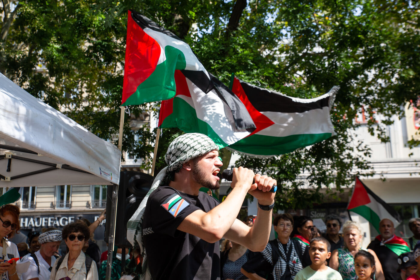 France, Paris, August 9, 2025. Rally for Palestine. Despite the summer truce, several hundred citizens continue to mobilize in solidarity with the Palestinian people. They are raising awareness about the ongoing genocide and famine in Gaza, calling for a ceasefire and sanctions against the Israeli regime.