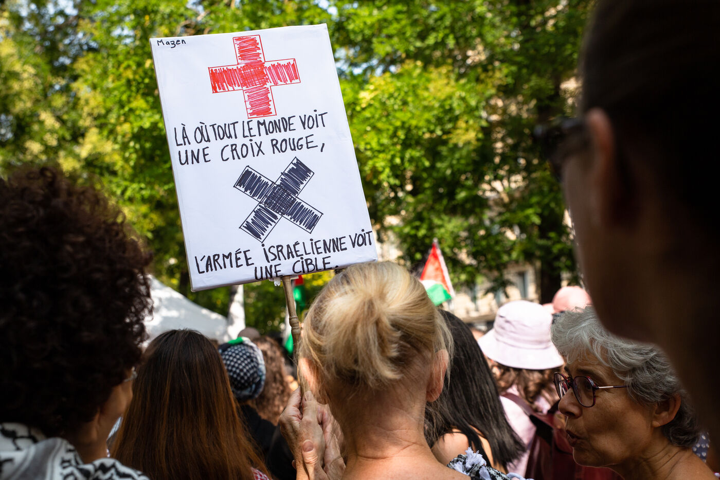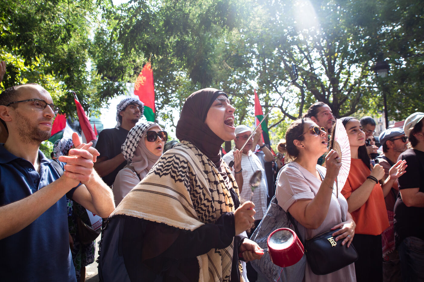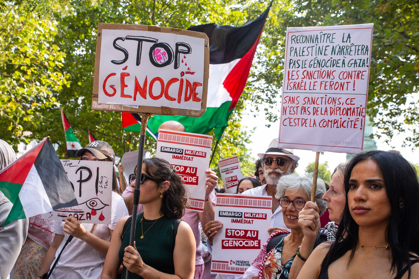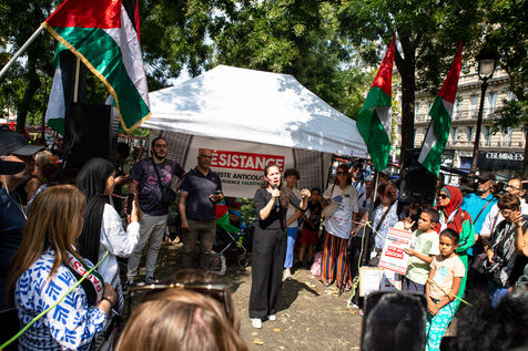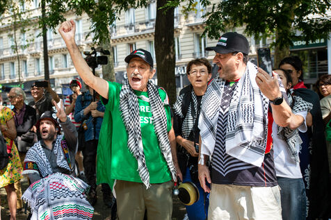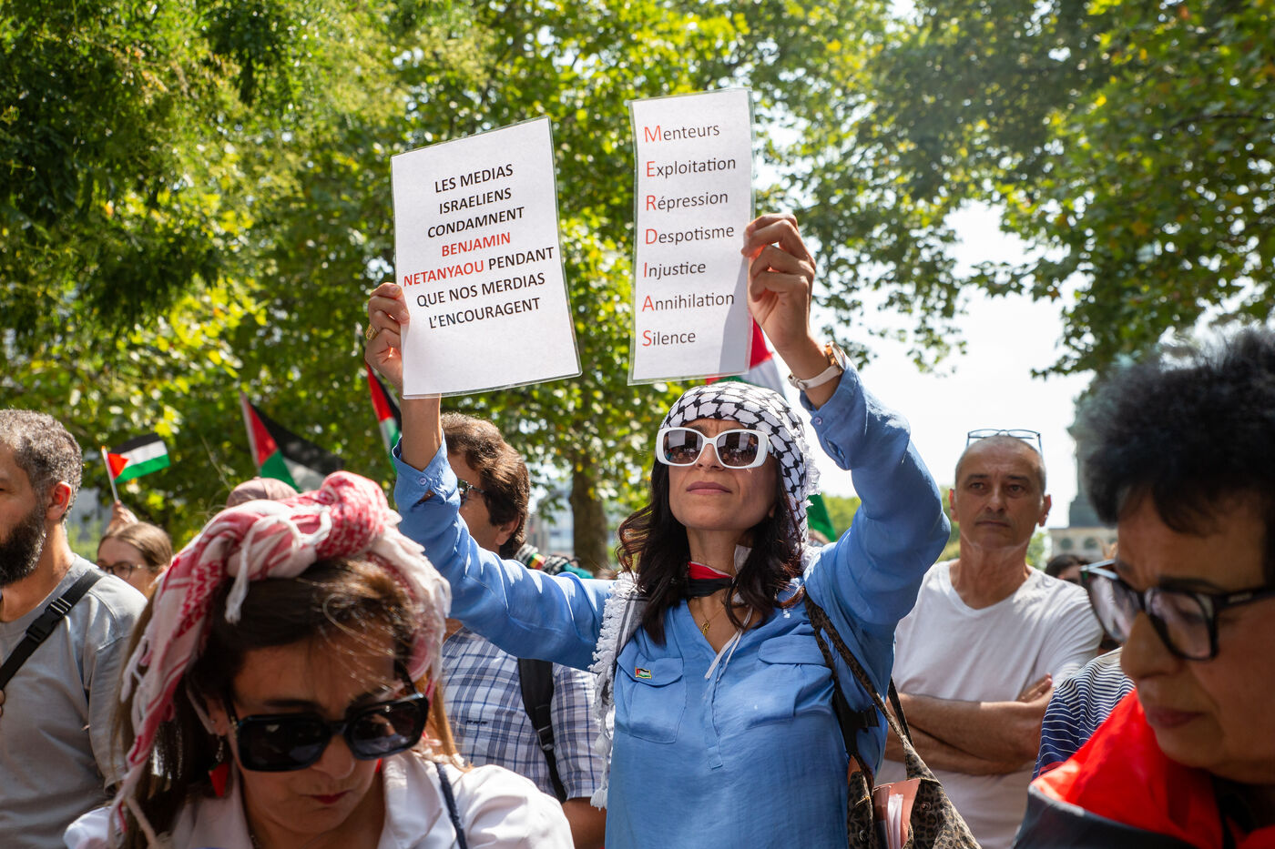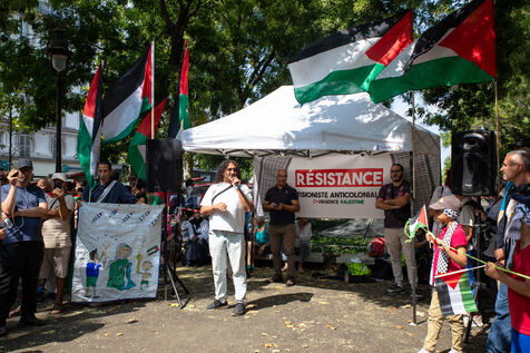 France, Paris, August 9, 2025. Rally for Palestine. Despite the summer truce, several hundred citizens continue to mobilize in solidarity with the Palestinian people. They are raising awareness about the ongoing genocide and famine in Gaza, calling for a ceasefire and sanctions against the Israeli regime.