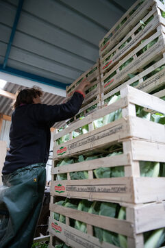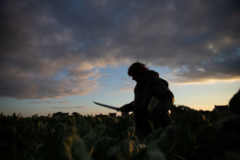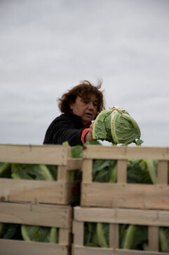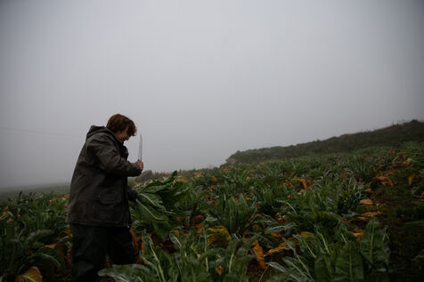 Au milieu d'un océan de choux noyé dans une brume épaisse, une silhouette s'affaire, le couteau tranche, les gestes sont précis, rapides, répétés à l'infini. C'est la saison de la récolte pour Nadine.