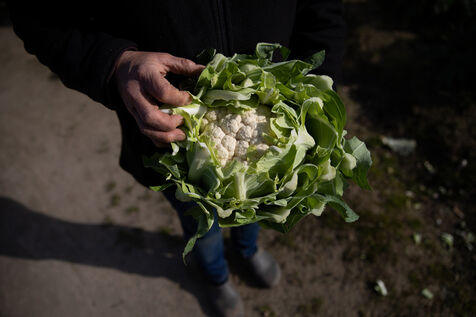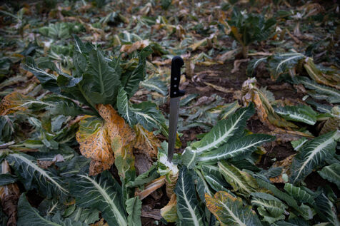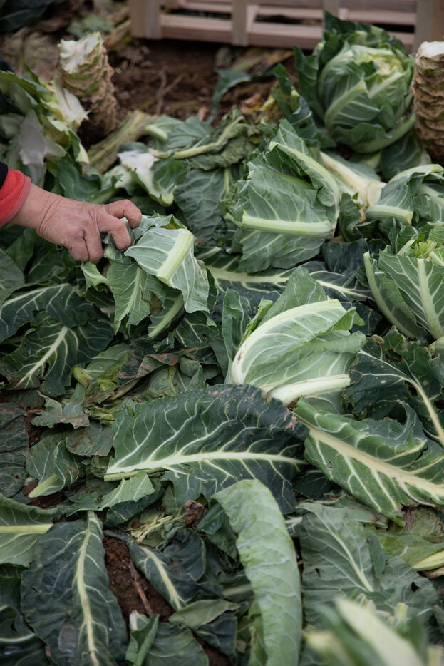 In the middle of a sea of cabbages drowned in a thick mist, a figure is busy, the knife is cutting, the gestures are precise, fast, repeated endlessly. It is the harvest season for Nadine.