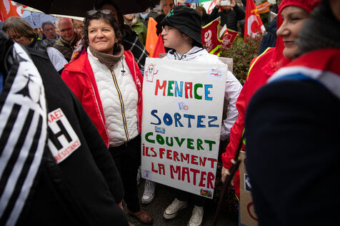 France, Carhaix, 2023-03-18. 5000 people demonstrate against the planned closure of the maternity hospital in Carhaix under the Rist law. Photograph by Vincent Feuray / Hans Lucas.