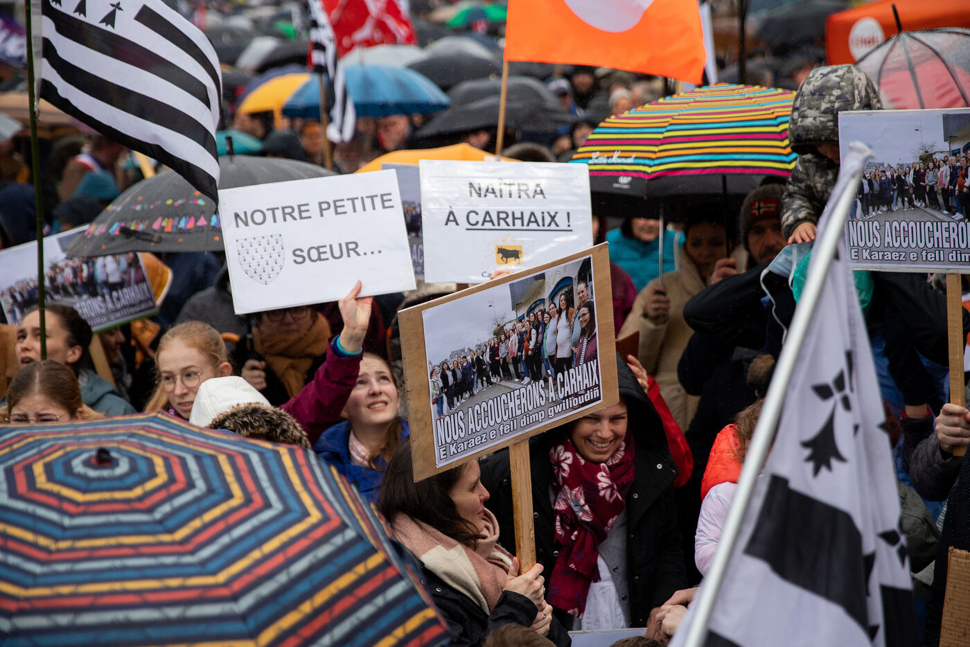 France, Carhaix, 2023-03-18. 5000 personnes manifestent contre la fermeture programmée de la maternité de l'hôpital de Carhaix dans le cadre de la loi Rist. Photographie de Vincent Feuray / Hans Lucas.