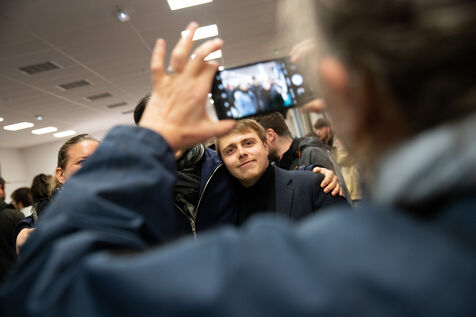 France, Brest, 2023-03-24. Plus de 500 personnes assistent à une reunion publique offensive contre la reforme des retraites des députés Nupes Mathilde Panot et Louis Boyard. Un groupe de militants d'extrême droite a tenté de perturber le meeting en vain. Photographie de Vincent Feuray / Hans Lucas.