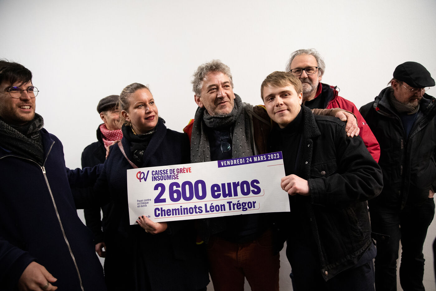 France, Brest, 2023-03-24. More than 500 people attend a public meeting against the pension reform of the Nupes deputies Mathilde Panot and Louis Boyard. A group of right-wing activists tried to disrupt the meeting but failed. Photo by Vincent Feuray / Hans Lucas.