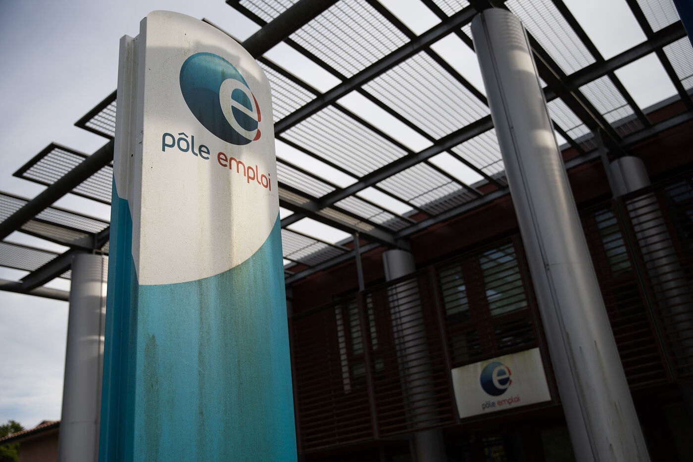 France, Andernos-les-bains, 2023-07-28. The final stretch for Pole Emploi, created in December 2008, which will become France Travail in January 2024 after 15 years of service. Illustration photograph of a Pole Emploi agency and its famous logo. Photograph by Vincent Feuray / Hans Lucas.