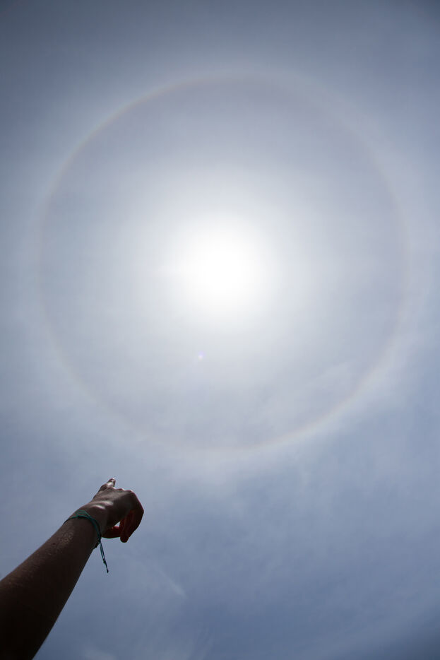 France, Kerlouan, 2024-05-18. Photographie d'un halo solaire dans le ciel du Finistère Nord. Ce phénomène météo est du a la réfraction des rayons du soleil par les cristaux de glace présents dans les nuages en haute altitude.