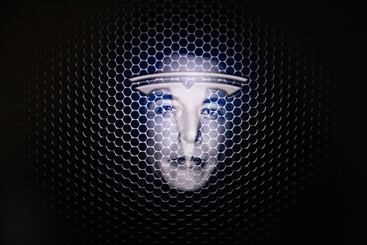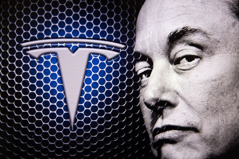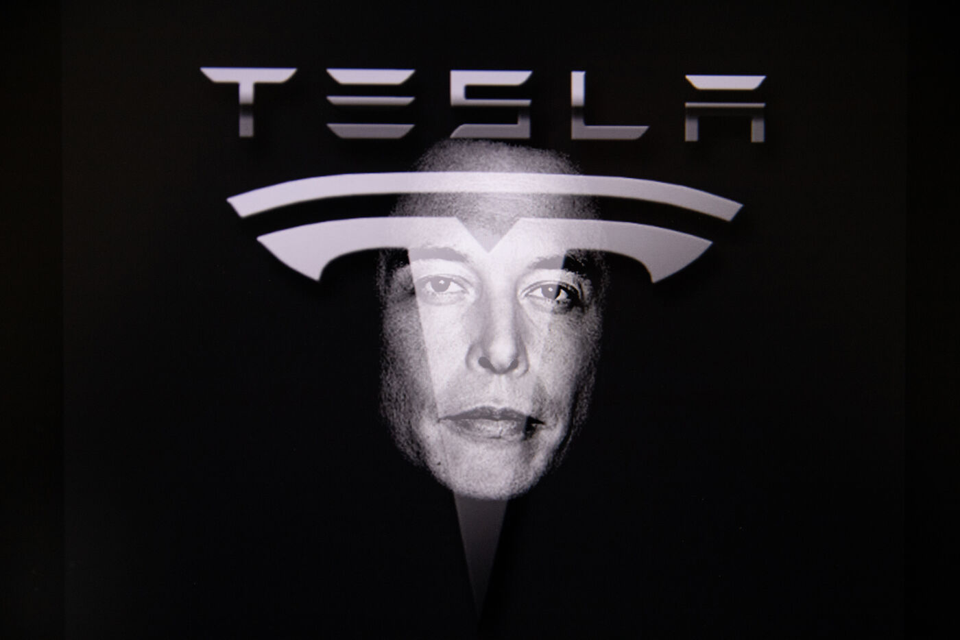 Double exposure illustration photographs of Elon Musk and his Tesla company logo.