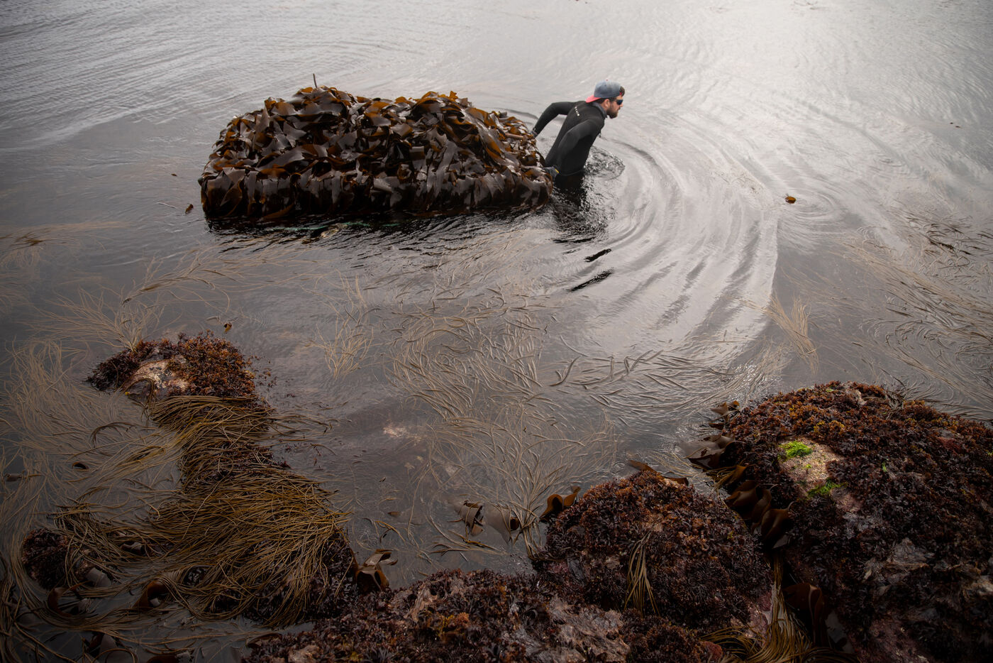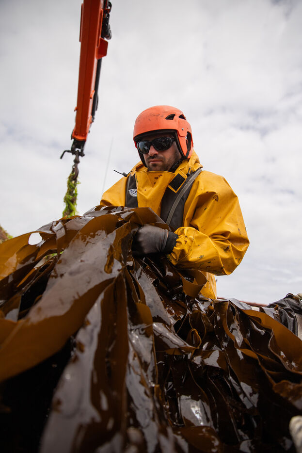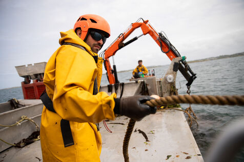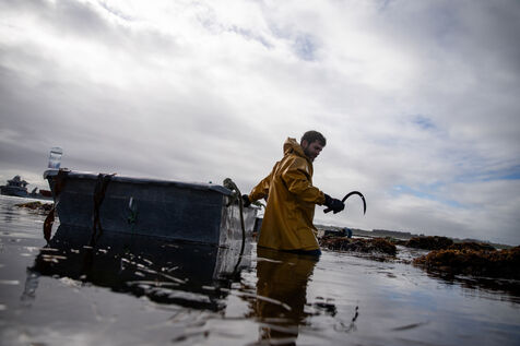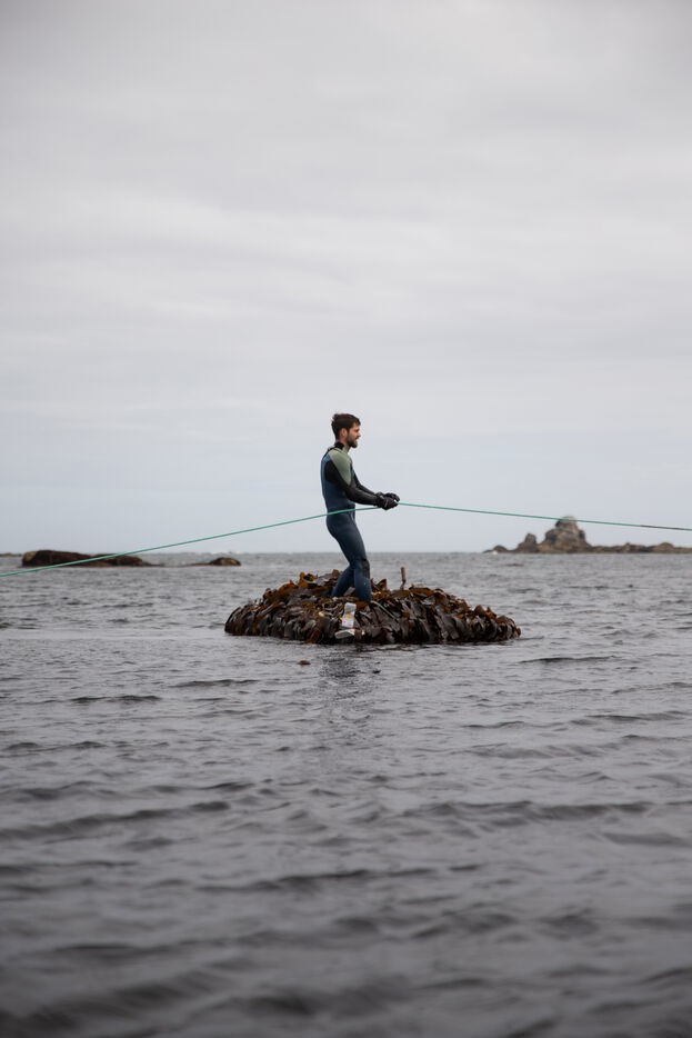 Sunday, May 25, 2025, 07:30 in the morning. The appointment has been made at Kerazan harbor in Lilia to accompany Guillaume, Alexandre and Titouan, three seamen from France Haliotis, the only company in Europe to raise wild abalone. The boarding sets the tone. We row to the boat moored to a dead body aboard a frail skiff. The aim of the day is to collect seaweed to feed the wild abalone growing in traps off the coast. Leaving the sheltered area at the mouth of the Aber Wrac'h, it's a 30 minute sail to the seaweed collection site. The ship and sailors face a 2.50 meter swell with impassivity, which is quite normal for these men who are used to the fury of the ocean. We finally come in sight of a rocky islet just above the surface of the water, the tide is almost out, and work can begin after a short break for lunch. A lifeline is stretched between our boat and the collection area, in the middle of the vast seaweed fields of North Finistère. The work looks like something from another era. Immersed in waist-deep water, the sailors slice through the seaweed with billhooks, the gestures precise and endlessly repeated, five tenders each loaded with 700 kilos of the precious resource before the tide rises too much. Once the ship has been loaded, it heads for the concession where the abalone grow. Unlike farming areas on land, here the production site has been transformed into a veritable refuge for biodiversity. The second phase of the day begins. Four by four, the trays containing the abalone are lifted from the seabed by crane to be filled with the collected seaweed that will feed the precious mollusks for a month. Here, too, the movements are precise, the operation is dangerous, and concentration is the order of the day. 72 trays are thus filled before the day comes to an end, heralding the return to port. It will be three to four years before the wild abalone can be sold on the country's finest tables.