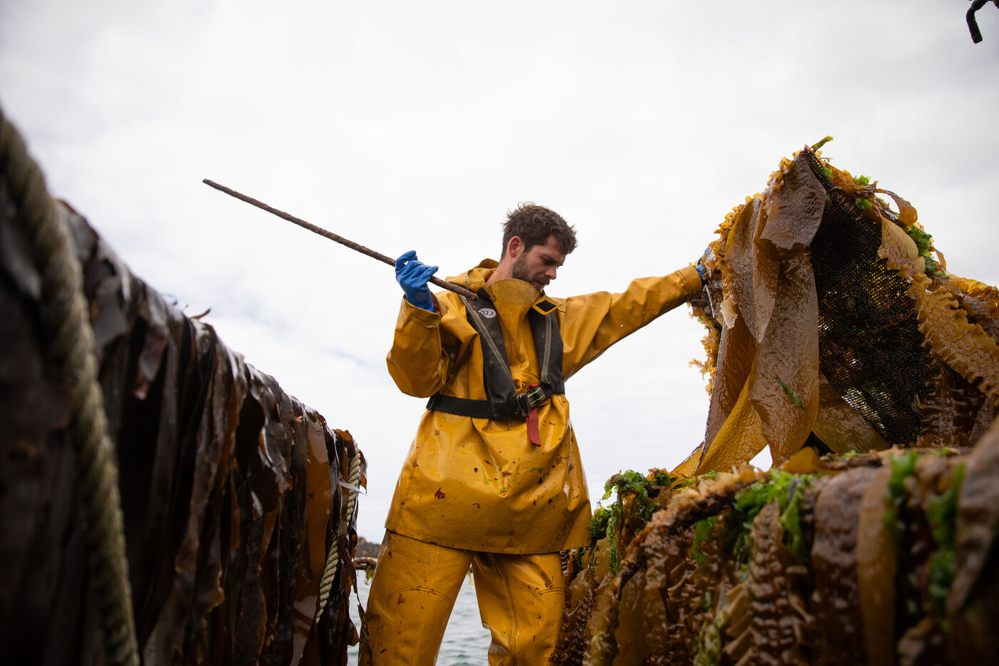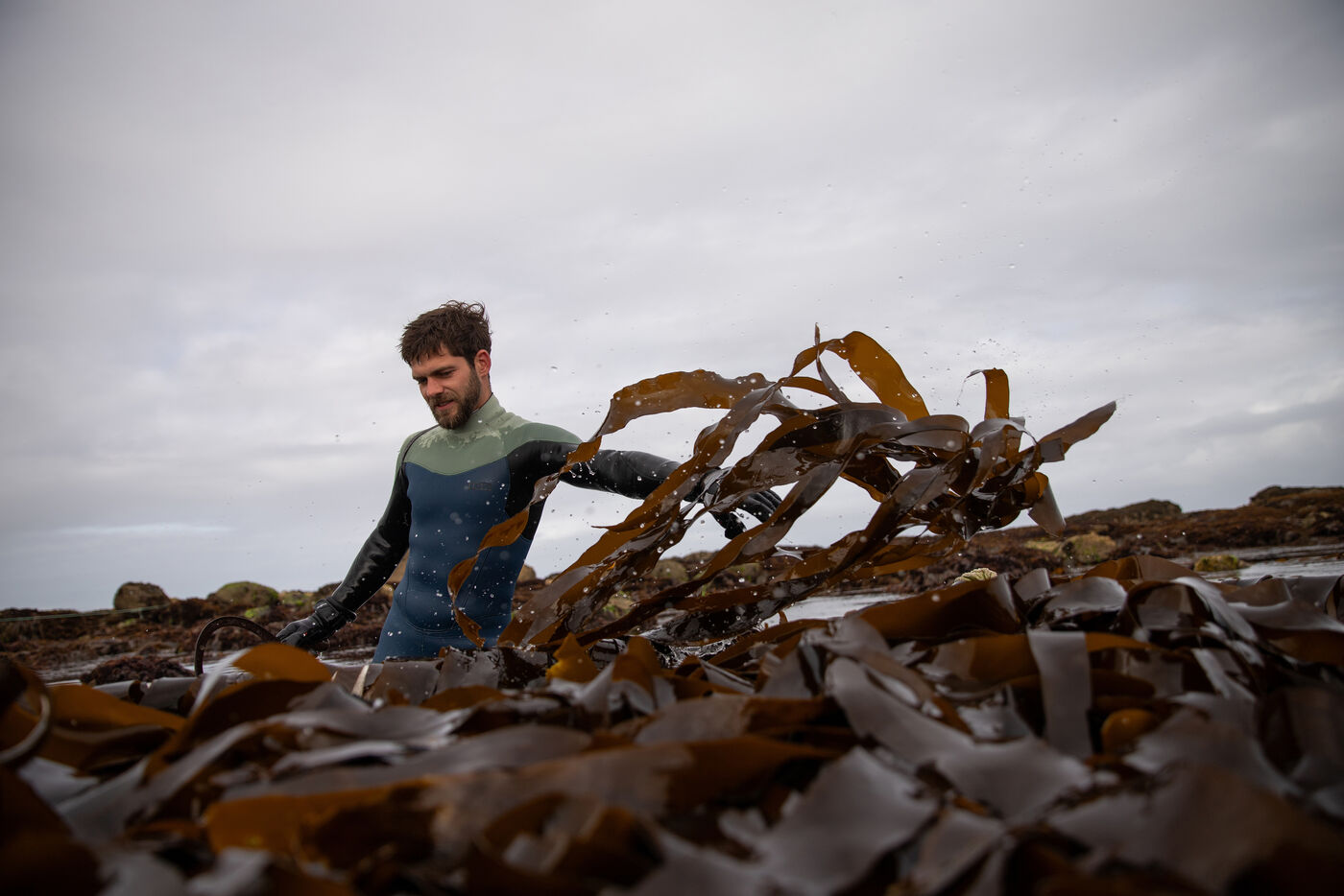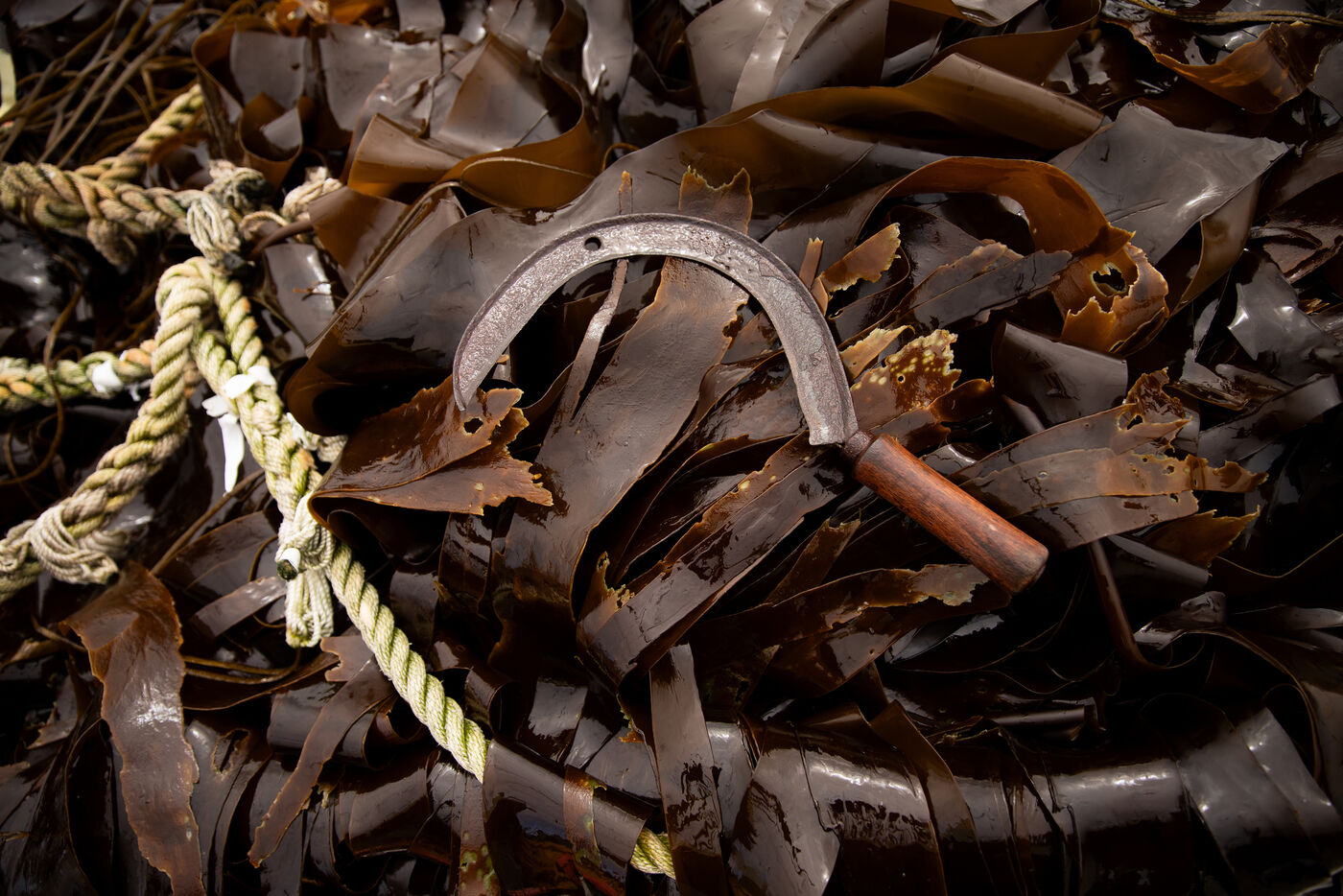 Sunday, May 25, 2025, 07:30 in the morning. The appointment has been made at Kerazan harbor in Lilia to accompany Guillaume, Alexandre and Titouan, three seamen from France Haliotis, the only company in Europe to raise wild abalone. The boarding sets the tone. We row to the boat moored to a dead body aboard a frail skiff. The aim of the day is to collect seaweed to feed the wild abalone growing in traps off the coast. Leaving the sheltered area at the mouth of the Aber Wrac'h, it's a 30 minute sail to the seaweed collection site. The ship and sailors face a 2.50 meter swell with impassivity, which is quite normal for these men who are used to the fury of the ocean. We finally come in sight of a rocky islet just above the surface of the water, the tide is almost out, and work can begin after a short break for lunch. A lifeline is stretched between our boat and the collection area, in the middle of the vast seaweed fields of North Finistère. The work looks like something from another era. Immersed in waist-deep water, the sailors slice through the seaweed with billhooks, the gestures precise and endlessly repeated, five tenders each loaded with 700 kilos of the precious resource before the tide rises too much. Once the ship has been loaded, it heads for the concession where the abalone grow. Unlike farming areas on land, here the production site has been transformed into a veritable refuge for biodiversity. The second phase of the day begins. Four by four, the trays containing the abalone are lifted from the seabed by crane to be filled with the collected seaweed that will feed the precious mollusks for a month. Here, too, the movements are precise, the operation is dangerous, and concentration is the order of the day. 72 trays are thus filled before the day comes to an end, heralding the return to port. It will be three to four years before the wild abalone can be sold on the country's finest tables.